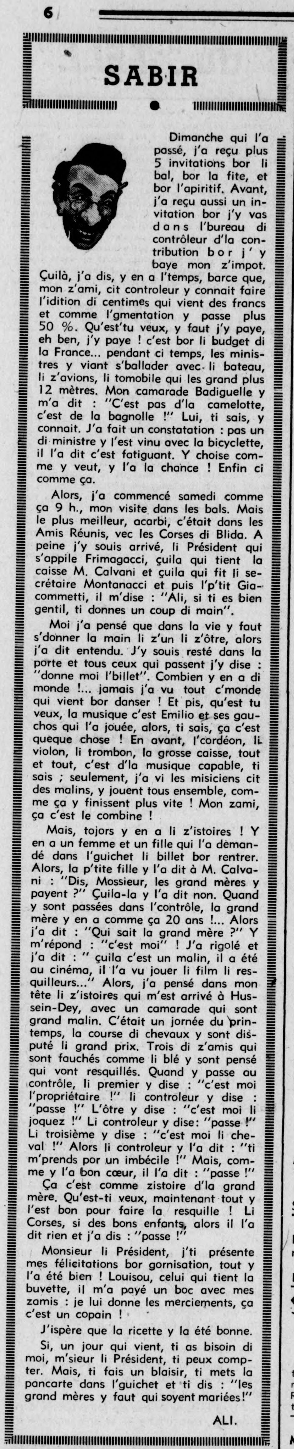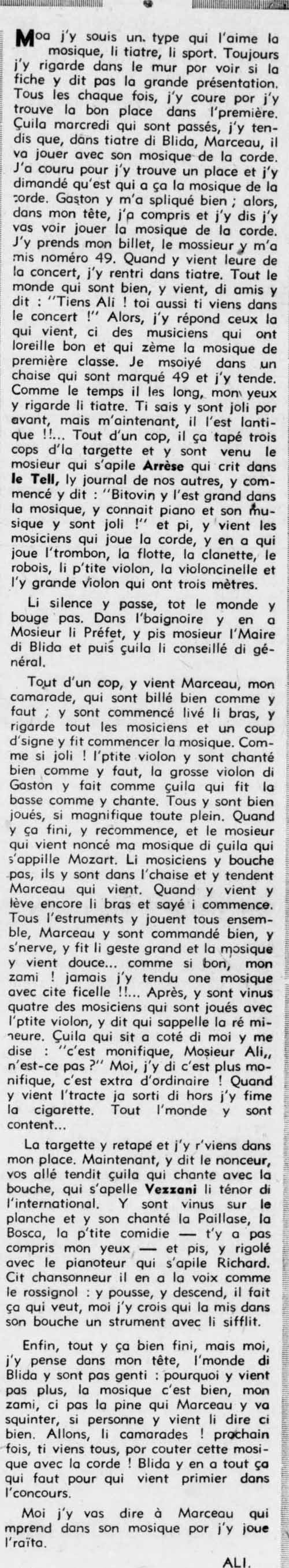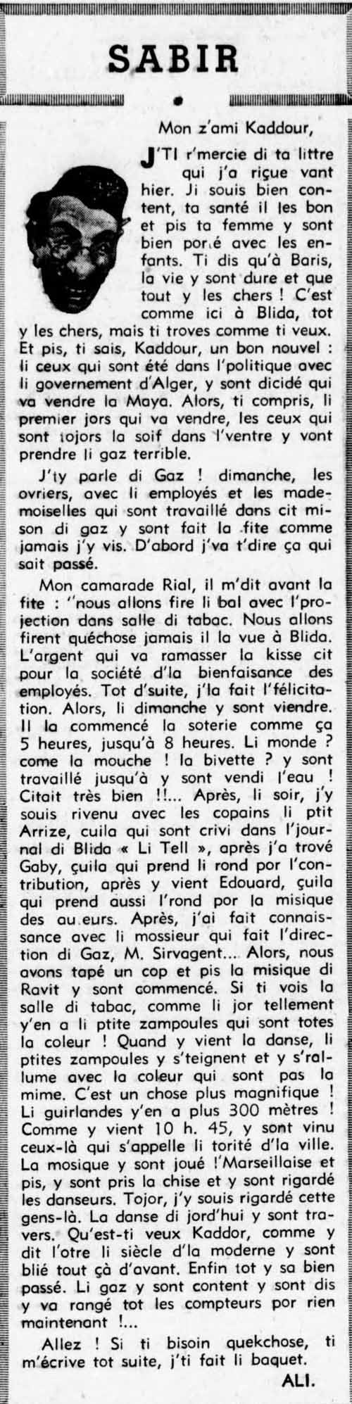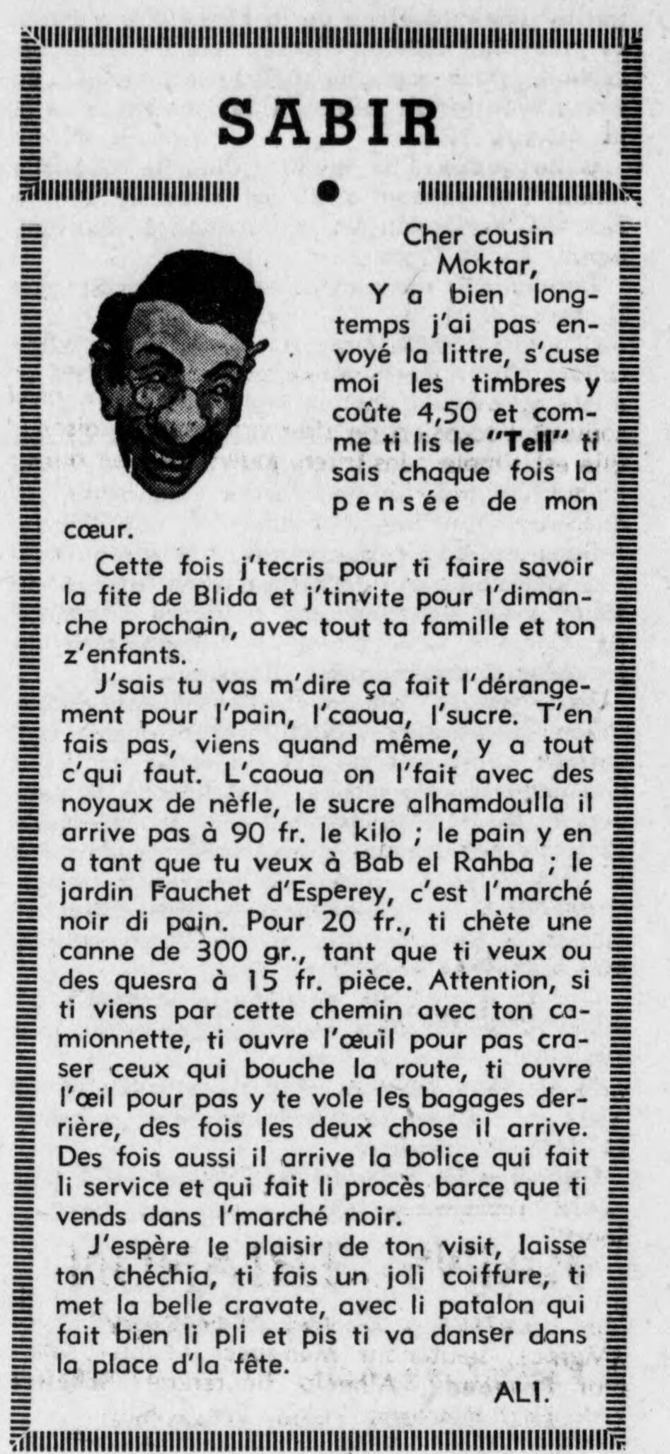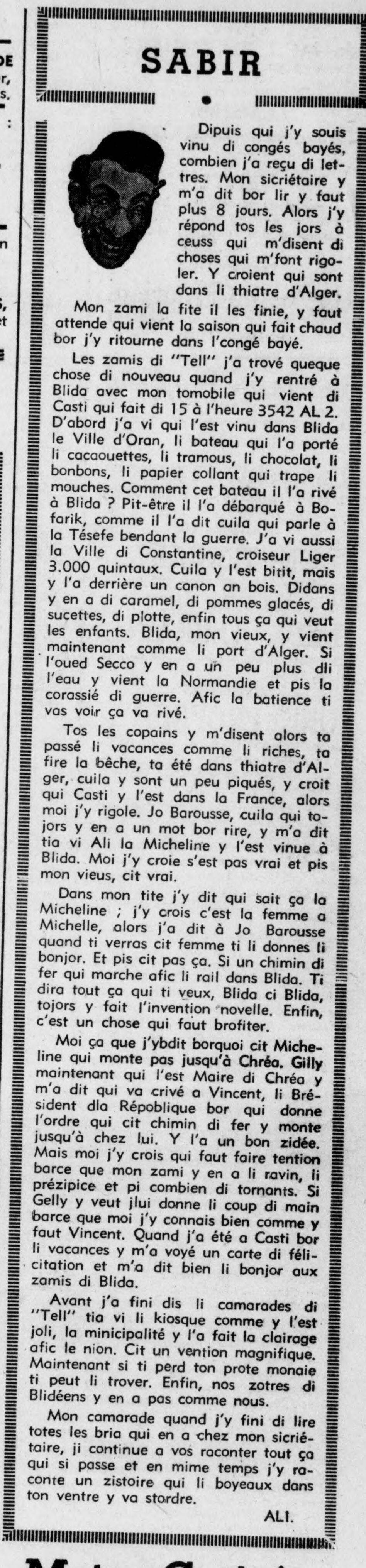 Certains se souviennent peut être de cette rubrique du Tell rédigée par un rédacteur du journal sous le pseudonyme d'ALI. Son premier article date du 23 mars 1946.
