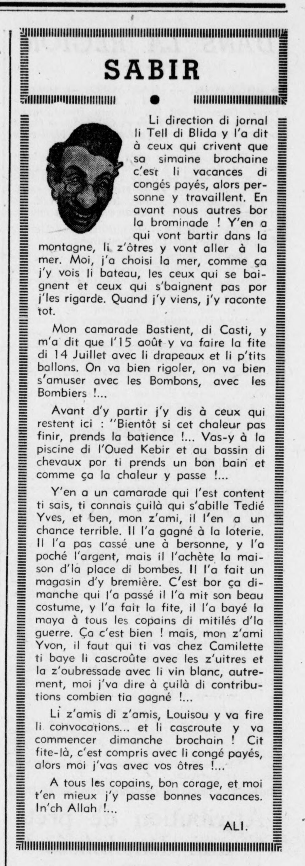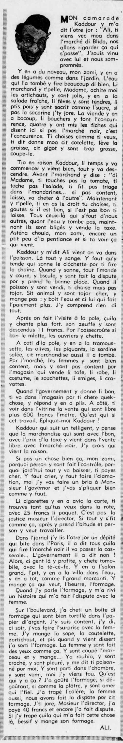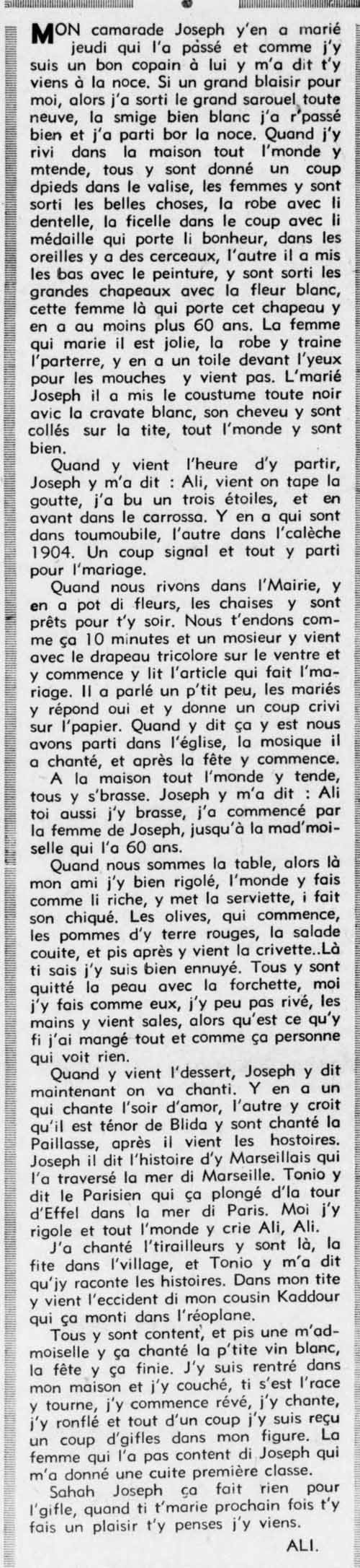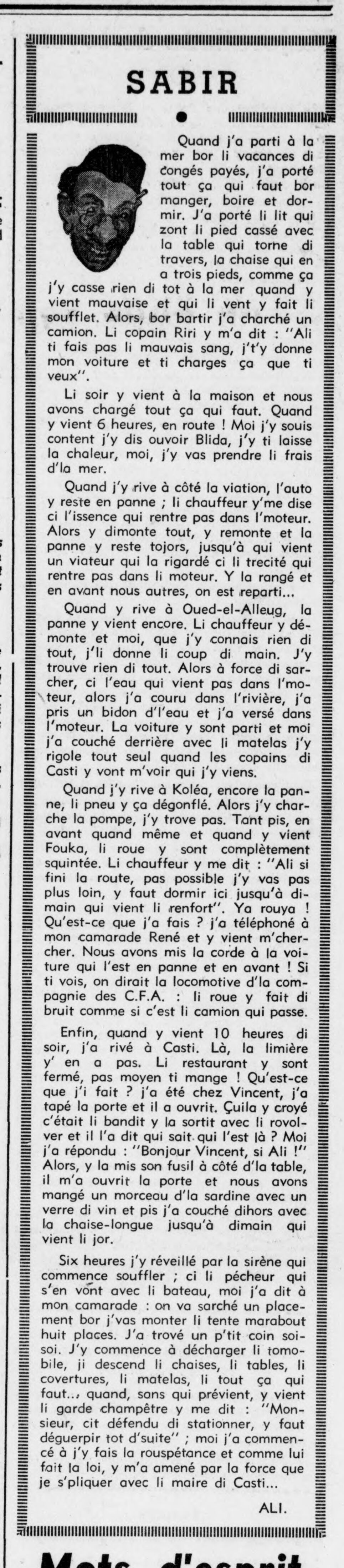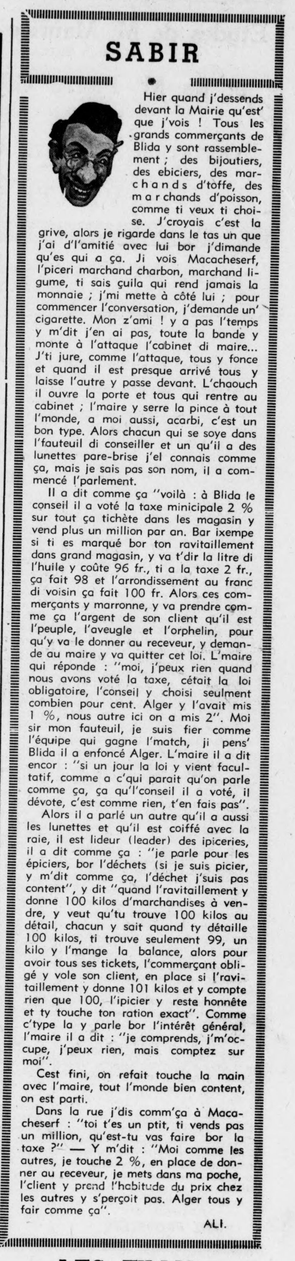 Certains se souviennent peut être de cette rubrique du Tell rédigée par un rédacteur du journal sous le pseudonyme d'ALI. Son premier article date du 23 mars 1946.