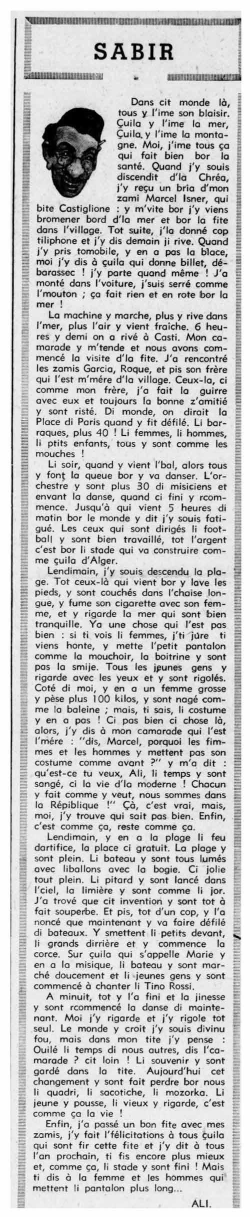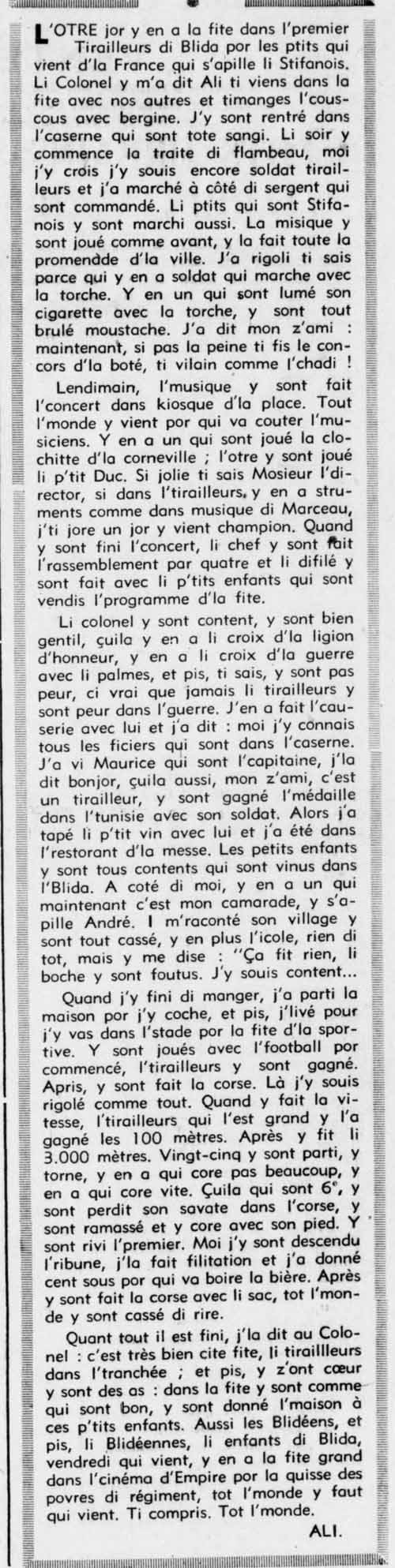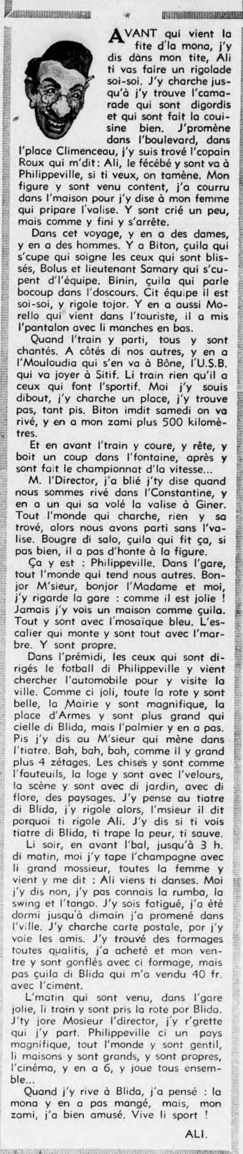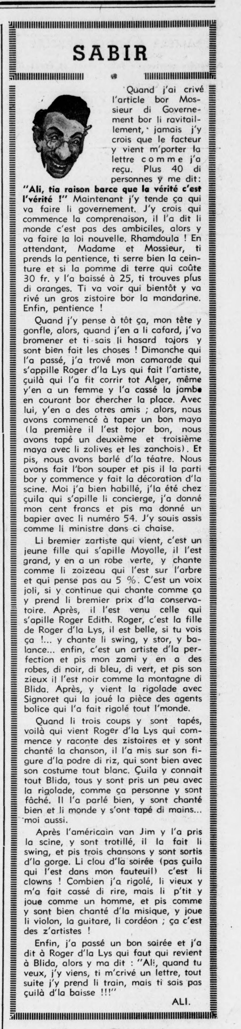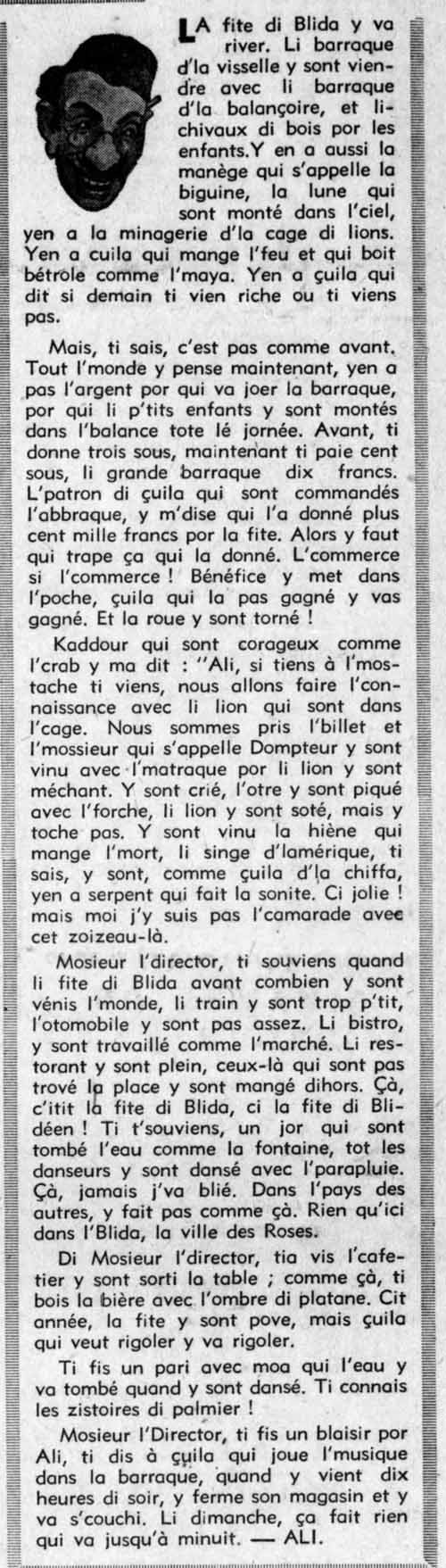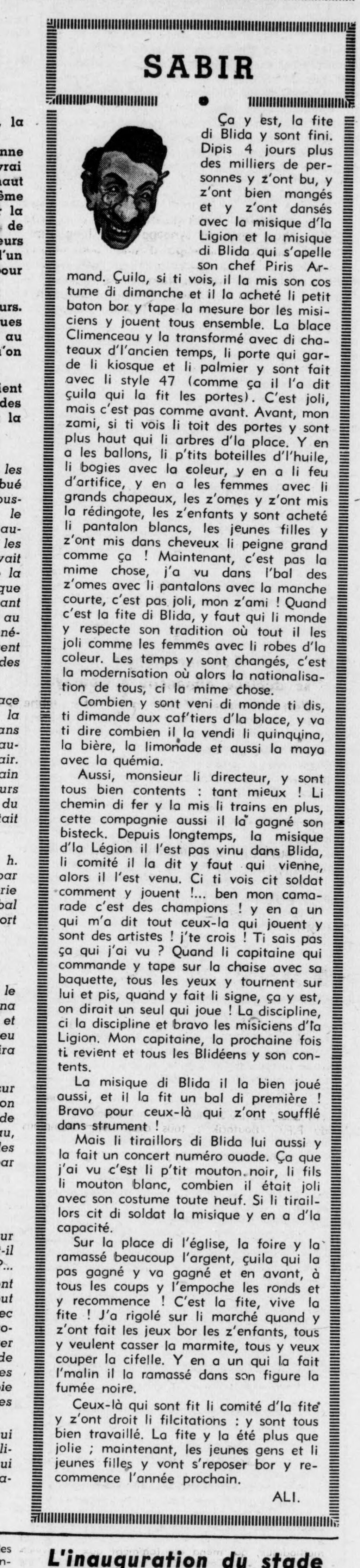 Certains se souviennent peut être de cette rubrique du Tell rédigée par un rédacteur du journal sous le pseudonyme d'ALI. Son premier article date du 23 mars 1946.