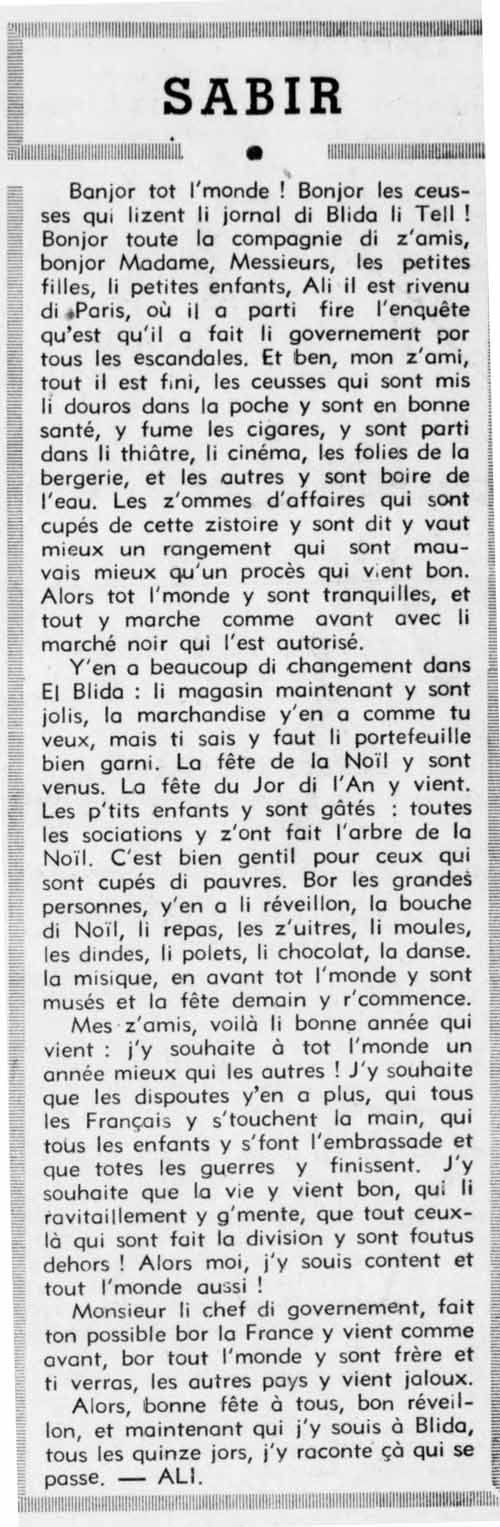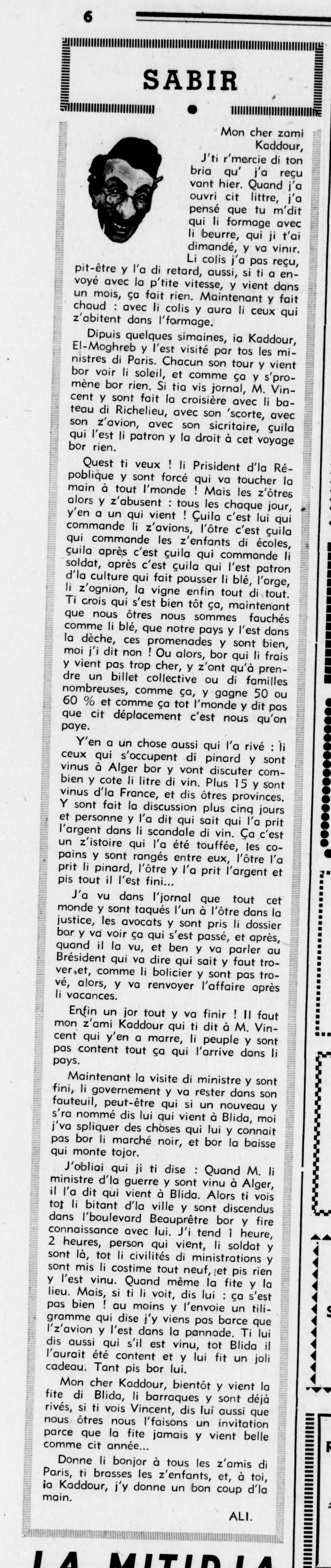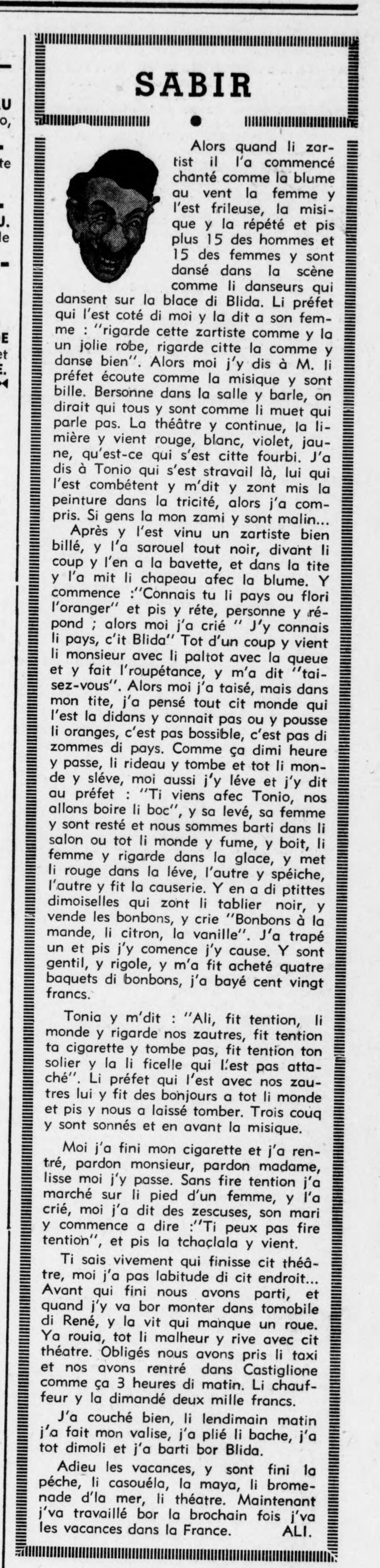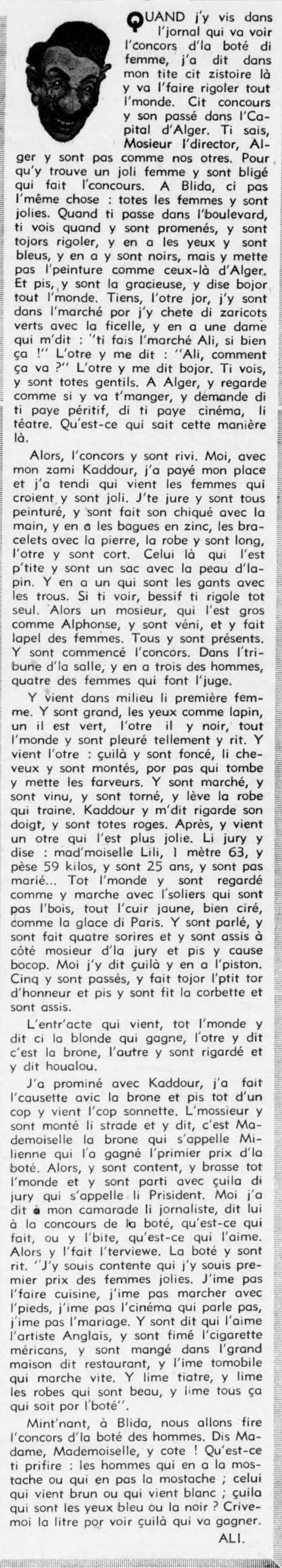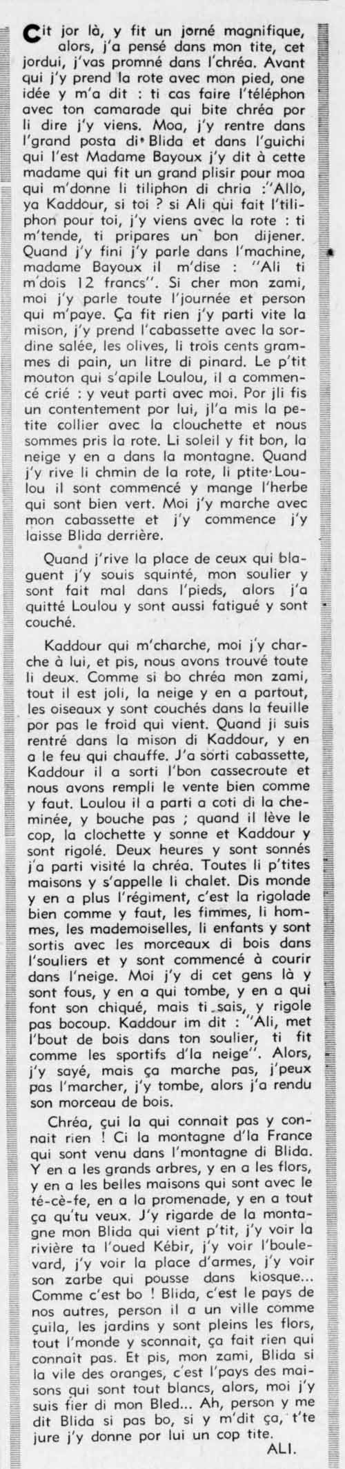 Certains se souviennent peut être de cette rubrique du Tell rédigée par un rédacteur du journal sous le pseudonyme d'ALI. Son premier article date du 23 mars 1946.