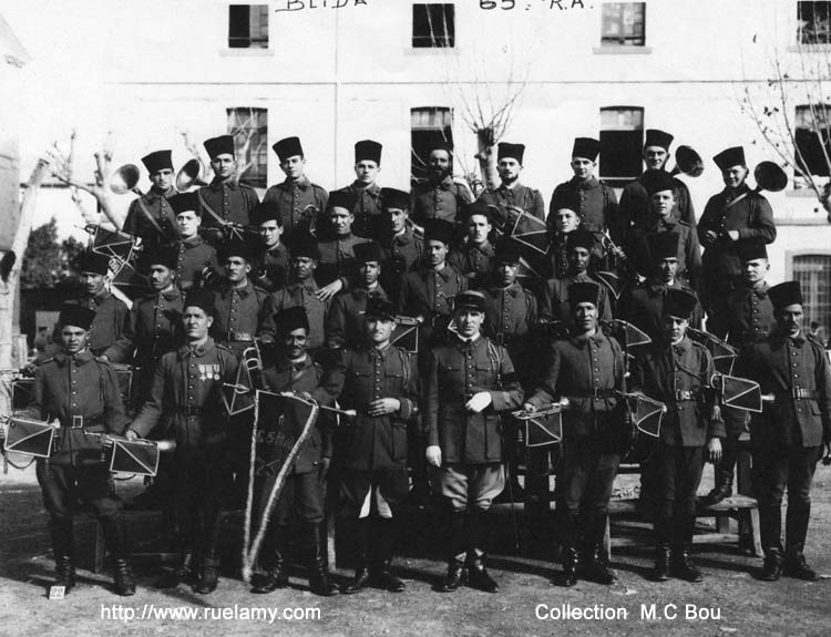Filiation: En 1917, le 65e R.A.D.C.A. regroupait toutes les unités de D.C.A. de province ; ses batteries ont été dispersées en janvier 1920 dans les cinq régiments de D.C.A. de l'Aéronautique et son Etat Major dissous Le 5 mai 1929, le 65e Régiment d'Artillerie est créé. Il est constitué avec les éléments du 7ième et du 1er Groupes d'Artillerie de campagne, dissous à la même date et avec des officiers venant d'autres corps et unités. A cette date les effectifs du Régiment sont les suivants: 34 officiers, 1208 sous-officiers, brigadiers et hommes de troupe; il dispose de 741 chevaux ou mulets Le Régiment comprend trois groupes - 1 groupe de 75 (1ère et 2e batteries) stationné à Blida ; - 1 groupe mixte (4e batterie de 75, 5e batterie de 155) stationné à Blida. Une section de D.C.A. est annexée à la 5e batterie - 1 groupe de 65 de montagne, stationné à Aumale. En août 1939, avant la mobilisation, le Régiment comprend quatre groupes et une batterie de D.C.A. Il donne naissance au 85e R.A.A.. Le 65e mobilisé part d'Algérie à deux groupes : l/65e et 1 l/65e. Un 1 ll/65e est mobilisé en France, à Niort En 1940, réorganisé en Algérie, il absorbe le 85e R.A.A En août 1946 il devient le 1 er R.A En avril 1956, le 4ème Bataillon de Tirailleurs Algériens devient 1e 1/65e R.A.A En 1958 il devient 65e R.A. puis en 1962, 65e G.A. Il est dissous en septembre 1964