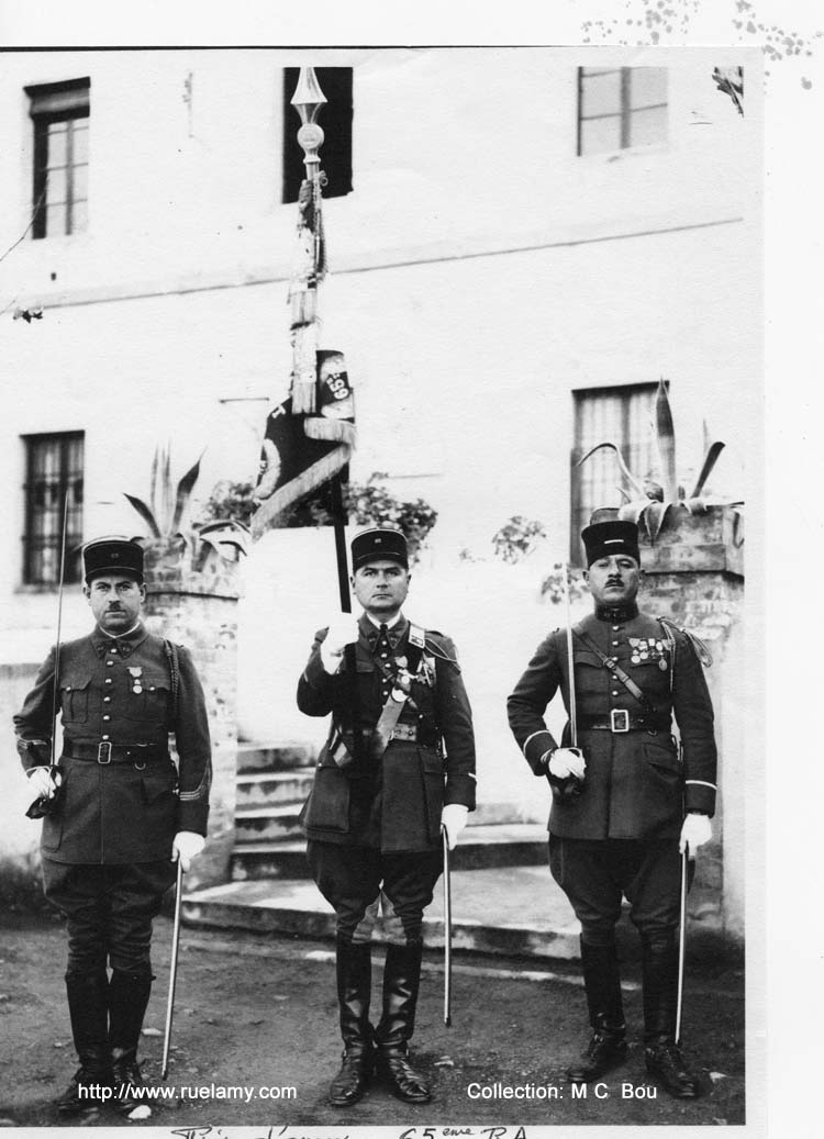 ETENDARD: MAROC 1908 LES DEUX MORINS 1914 CHAMPAGNE 1915 VERDUN 1916-1917 L'AISNE 1917 PICARDIE 1918 OUSSELTIA 1943 FOURRAGERE: Médaille Militaire le 9 février 1919 au 1er G.A.A, transmise officiellement au 65e R.A.A GARNISONS: 1929: Blida, Aumale -1940: Blida, Maison-Carré - 1945: Allemagne - 1947: Blida |