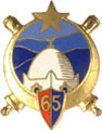 INSIGNES Type I: 65e R.A.A ECU français ancien bleu roi à deux canons croisés en sautoir rouge translucide chargée d'une tête de cheval contournée blanche accompagnée en pointe d'un petit écu tiercé en pal : bleu clair, blanc et rouge à motifs d'or, et en chef d'un cartouche noir à l'inscription : 65e R.A.A. d'argent, le tout posé sur un croissant d'or, les filières du grand écu, du mulet et des canons sont d'argent. Les symboles s'expliquent d'eux-mêmes, le petit écu est aux armes de la ville de Blida. La tête représentée sur l'insigne est inspirée de la monture du porte-étendard du régiment, ce cheval nommé « Tout-Blanc » n'avait pas un seul poil ou crin d'une autre couleur, particularité très rare. Fabriqué par Drago avant 1939.