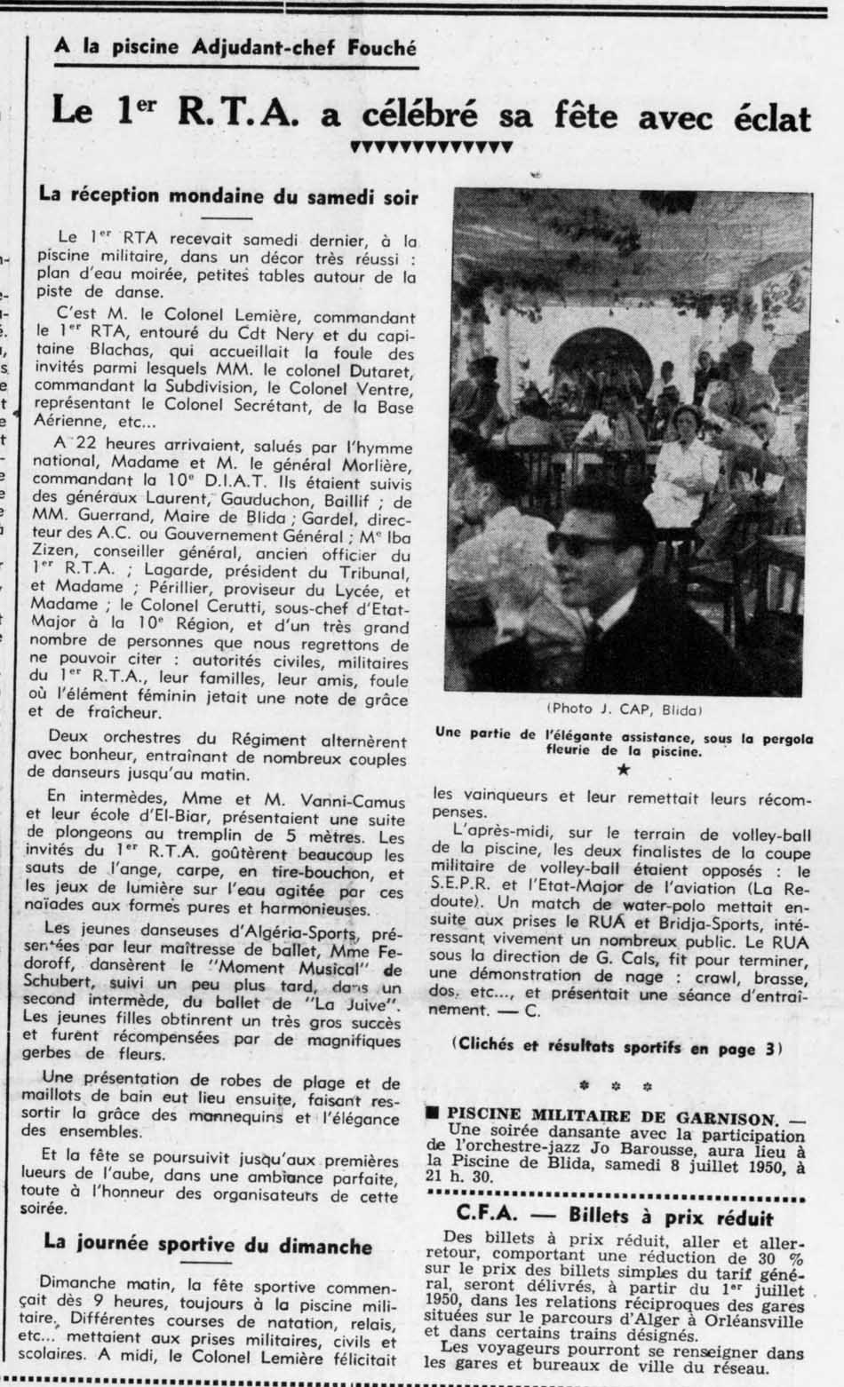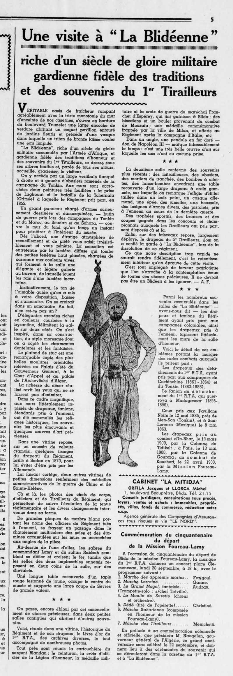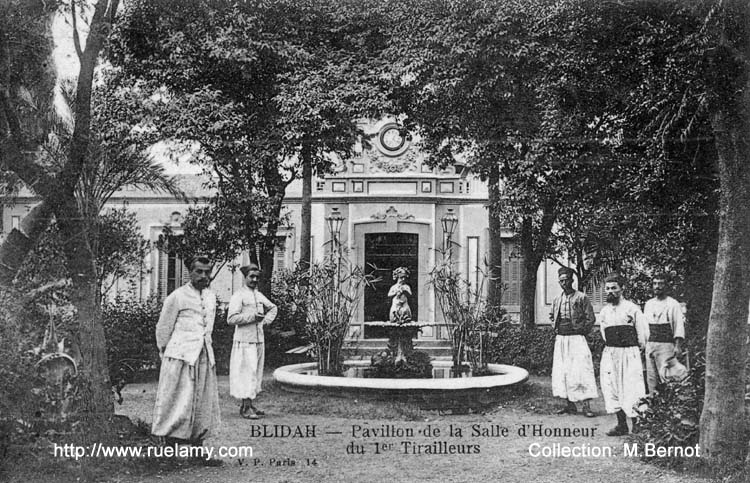 La Blidéenne Boulevard Trumelet, à Blida, il est un coin de verdure, une oasis au milieu des maisons, un jardin, un jet d'eau et un musée: c'est le berceau des Tirailleurs algériens, le cœur du régiment, son livre d'or. Ici sont rassemblés toutes les reliques, tous les tropées, tous les souvenirs tragiques et glorieux qui constituent les pages du livre de sa vie. Aussi ne faut-il pas s'étonner qu'aujourd'hui se déroule, dans cette maison, la plus belle des manifestations, consacrée à l'évocation d'un passé d'héroïsme et de fidélité à la France R. DESCHANEL (Le Tell 1960) Extrait du bulletin des anciens des écoles de Blida