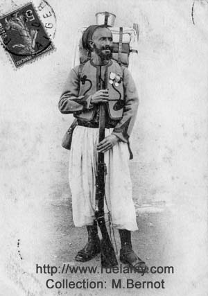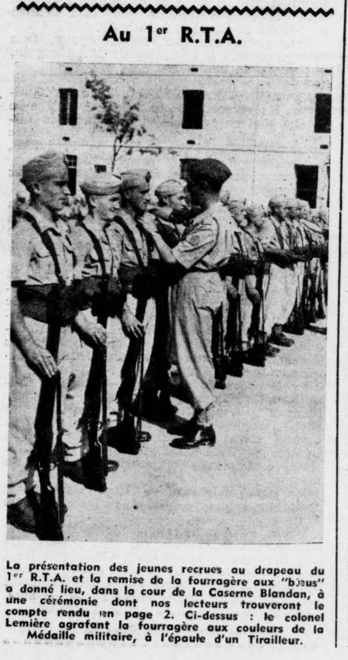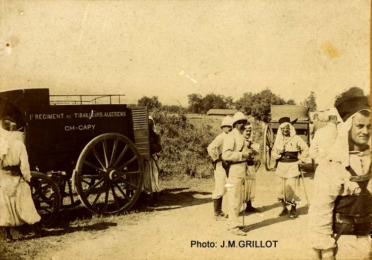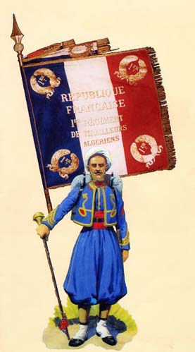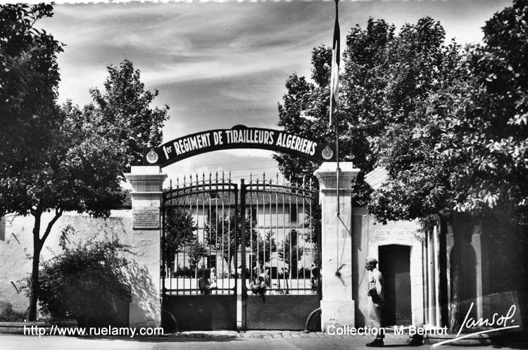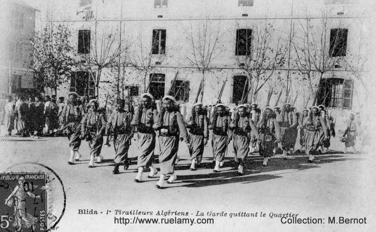 Le 1ier Régiment de Tirailleurs Algériens Son histoire par un blidéen : R.Deschanel Le 1ier RTA raconté par Pierre Penin Hommage au 1 ier RTA par Marie Louise Armand Le 1er RTA par Victor DURUY (1899) Le 1ier RTA dans la guerre de 1914-1918 (source Gallica) Un document exceptionnel édité pour le centenaire de la création du régiment Le livre d'Or des Tirailleurs indigènes Une Chronologie de la vie du 1ier RTA et encore là La magnifique épopée des Tirailleurs et des Spahis Algériens Tirailleurs d'hier et d'aujourd'hui Algérie 1954-1962 par Eric de Fleurian Le 1ier Régiment de Tirailleurs Algériens est né à BLIDA de l'un des bataillons de Tirailleurs indigènes recrutés dès 1830 dans la province d'ALGER par le Général CLAUZEL et fut appelé : "Le bataillon de Tirailleurs des provinces d'ALGER ET DU TITTERI" Son drapeau décoré de la Croix de la Légion d'Honneur, de la fourragère aux couleurs de la Médaille Militaire et de la Croix de guerre 1914-1918 chargé de quatre palmes porte en lettre d'or les noms des batailles et expéditions auxquelles il a participé : LAGHOUAT 1852 - SEBASTOPOL 1854-1855 -TURBIGO, SAN LORENZO 1863 - EXTREME-ORIENT 1884-1885 - TCHAD 1900 - MAROC 1907-1913-1918 - LA SOMME- l’AISNE 1916 - SAINT THIERRY 1918.