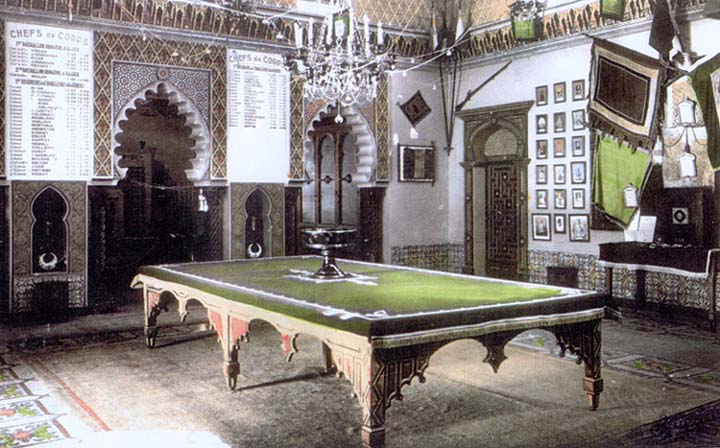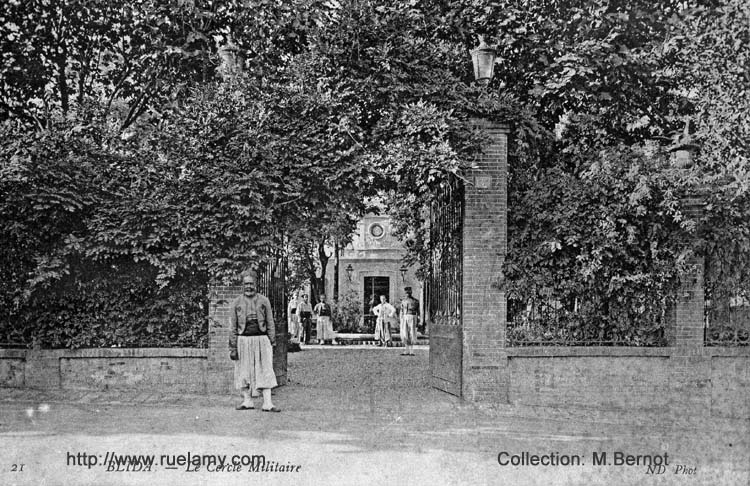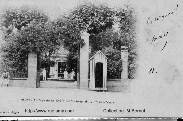 Le Tell du 15/12/1886 En 1885, une Société de gymnastique nouvellement organisée sous la dénomination de "LA BLIDEENNE" obtint la location de ces locaux, avec un bail de douze ans ; ils subirent une transformation ad hoc ; une épaisse couche de sable remplaça le carrelage de la grande salle centrale et des agrès y furent installés. Les officiers continuèrent, par entente verbale avec le Président, à utiliser la cour pour leur croquet, mais à la suite d'une délibération du Conseil d'Administration de "LA BLIDEENNE", ils furent priés de chercher ailleurs un emplacement. Leur jeu fut transféré dans la cour des magasins militaires à orge. "LA BLIDEENNE" prospéra, mais lorsque le bail expira en 1897, il ne fut pas renouvelé, l'extension du casernement du 1er Tirailleurs étant envisagée; à son tour elle eut à chercher un autre emplacement. Un moment dissoute, cette Société se reforma sous le nom de "BLIDA-GYMNASTE" et elle devint, sous la Présidence du regretté Monsieur GUISONI, une des plus belles des Sociétés de gymnastique de la Colonie. Le Colonel MENESTREL obtint du Corps d'Armée l'adjonction de ce coquet pavillon et de ses dépendances au casernement du 1er Régiment de Tirailleurs et y fit transférer la Salle d'Honneur, la Bibliothèque, le Bureau du Colonel et du Major, et la Salle d'Armes des Officiers. A ce moment, les affaires de FACHODA avaient amené à Blida un Bataillon d'Infanterie du Midi, dans lequel se trouvaient deux artistes éducateurs de grand talent. Passés au 1er Tirailleurs, ils furent envoyés à Alger où ils relevèrent, au Palais d'Eté du Gouverneur Général, à la Première Présidence de la Cour d'Appel et à l'Archevêché, les plus belles moulures orientales qui s'y trouvent et, sous l'impulsion du Colonel MENESTREL et de son dévoué Adjudant-Major, le Capitaine GODIOT, elles furent appliquées, au plafond et sur les murs de cette salle d'honneur qui, par cette ravissante décoration orientale, fait l'admiration, de tous les visiteurs. ...... Cette salle renferme des souvenirs inestimables des grandes guerres et des guerres coloniales auxquelles ce brillant régiment a participé et on ne connaît en souvenirs glorieux que la salle d'honneur du 1er Etranger et du 1er Zouaves qui puissent rivaliser avec elle.