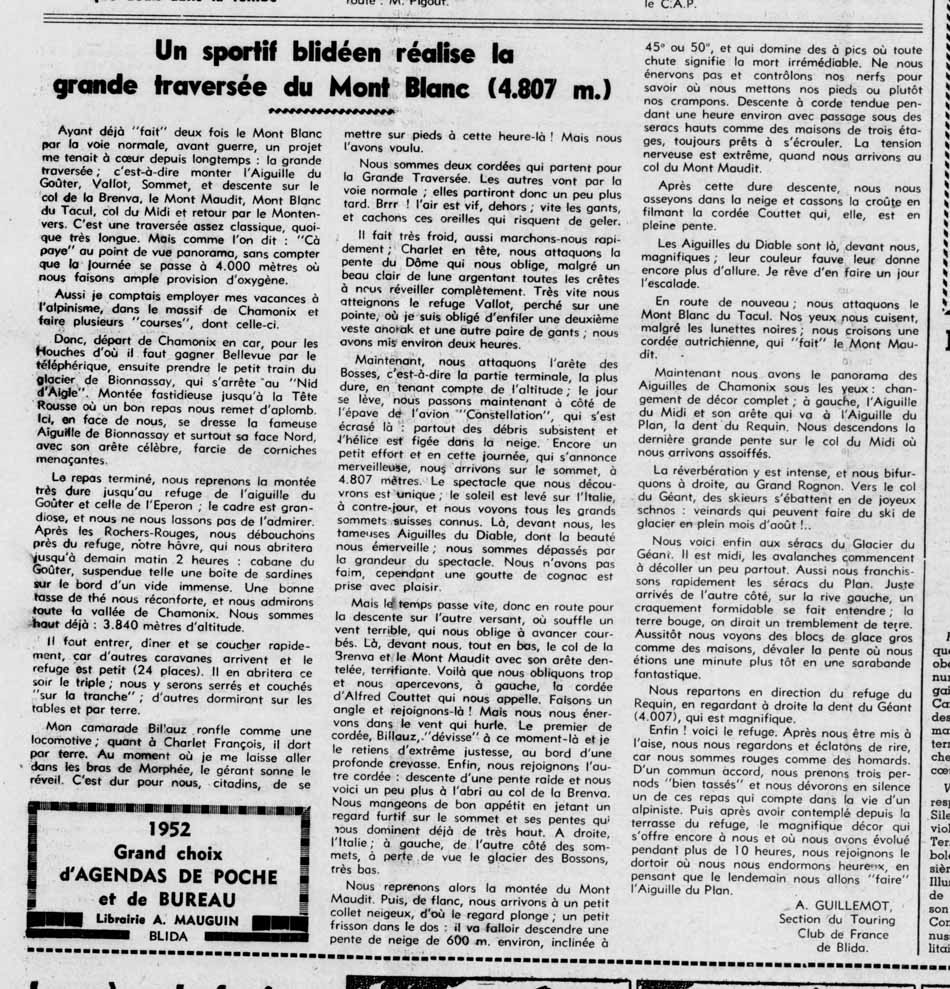 André Guillemot est membre du Touring Club de France à Blida où il organise des sorties régulièrement en tant que chef de groupe. Sa passion de la montagne l'entrainera très loin mais avant il va s'attaquer à le Tell du 5/01/1952 et en compagnie de 2 autres blidéens à Le Tell duu 25/04/1952 ****************** Le 26 novembre 1955, à Blida dans les locaux du Touring Club de France il présente au cours d'une conférence un compte rendu de son voyage dans l'Himalaya en juillet de la même année. J'ai découvert un numéro de la revue Sciences et Voyages dans laquelle A.Guillemot raconte son expédition. Hélas il n'y a que le début du récit dans ce numéro. Vous trouverez ci-dessous cet article qui nous laisse un peu sur notre fin.
