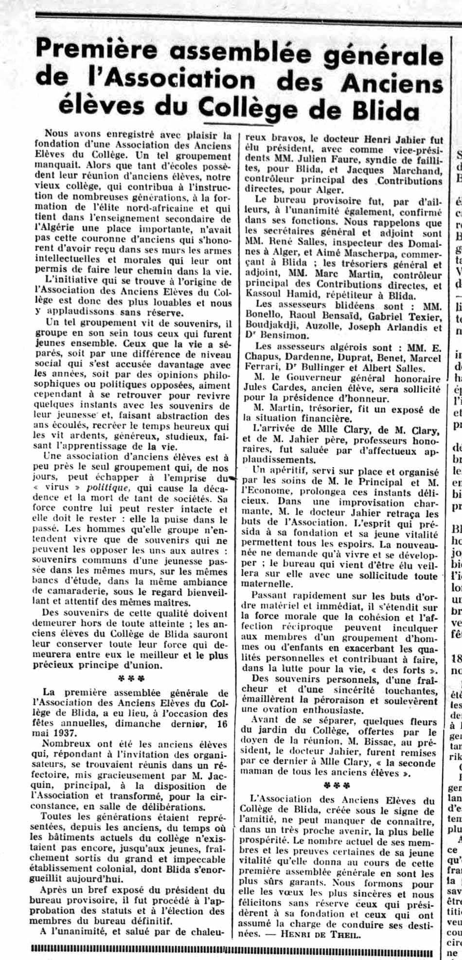 Création de l'Association des Anciens élèves du Collège de Blida Le 22 MAI 1937