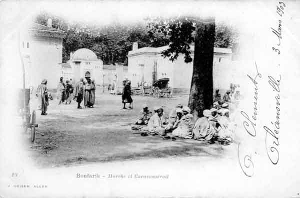 Un caravansérail ou fondouk est un lieu sur une route commerciale où les caravanes et les marchands font étape et commercent. Dans le but de respecter et de maintenir une activité ancienne en Algérie, l'administration française fait le projet en juillet 1844 de créer une série de caravansérails à Cherchell, Koléa, Blidah et Boufarick. Lettre au ministre du 4 juillet 1844 Un premier projet est présenté dès 1844 au Conseil Supérieur de l'Administration. Celui-ci est approuvé par la commission des bâtiments civils mais c'est à Paris au ministère qu'un premier obstacle se présente. Commence alors un aller-retour entre l'inspection des bâtiments civils et le ministère pour modifier le projet. (Il est évident que l'on est mieux placé à Paris pour savoir si le toit d'un caravansérail est adapté au climat que les créateurs du projet et si les écuries doivent être placées devant ou derrière le bâtiment! ).