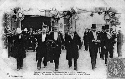 La visite du Président Loubet (II) Sortant du banquet des Amis Réunis, on voit le président Loubet avec à sa droite le maire de Blida, Mr A.Le Goff et à sa gauche en habit et haut de forme le gouverneur général REVOIL.