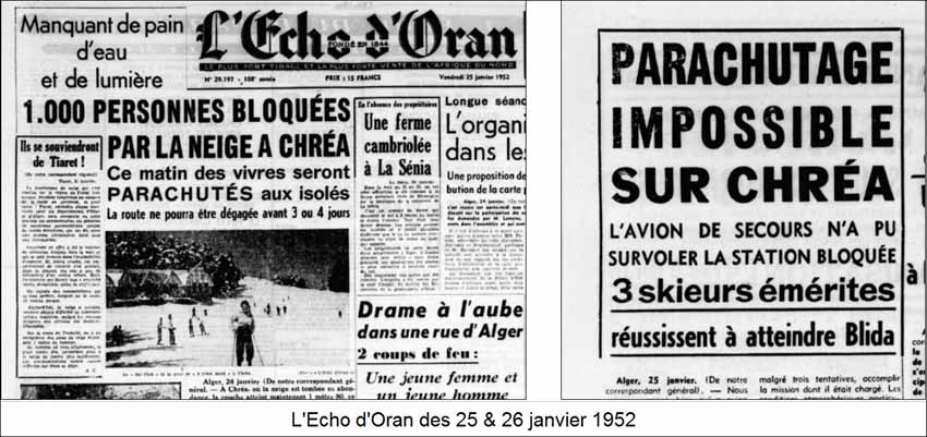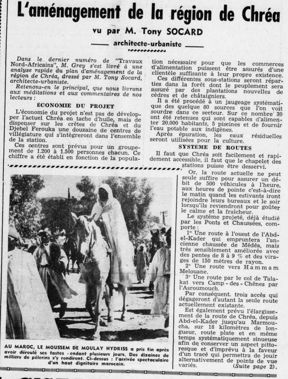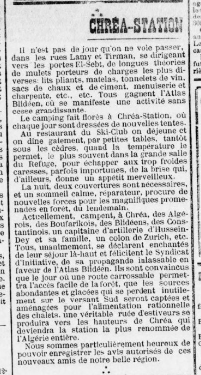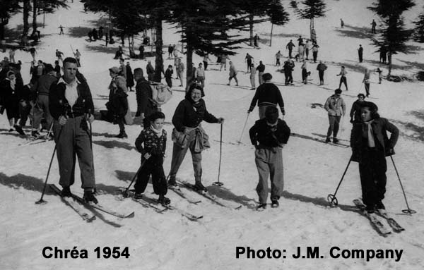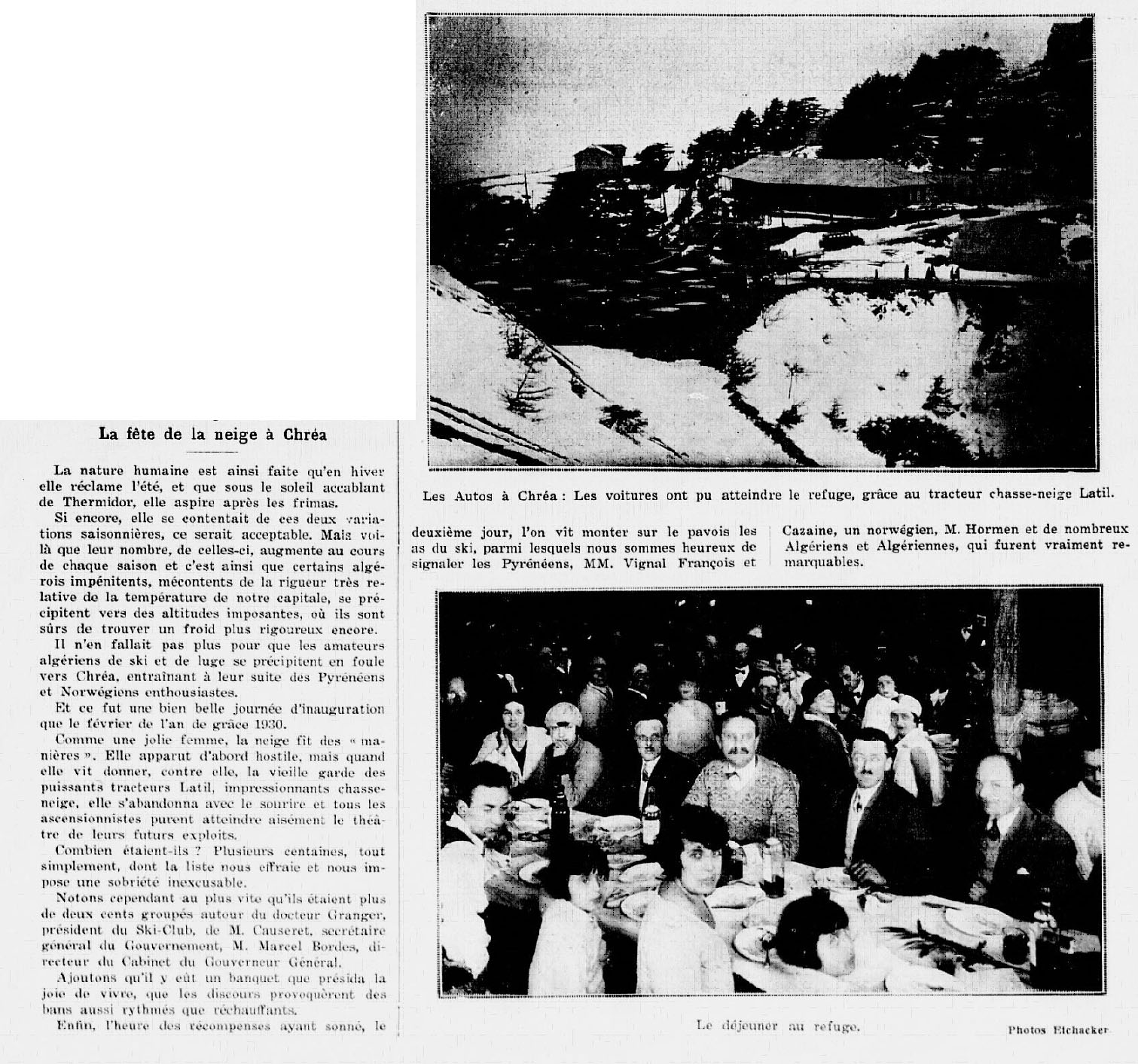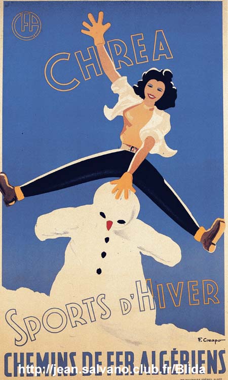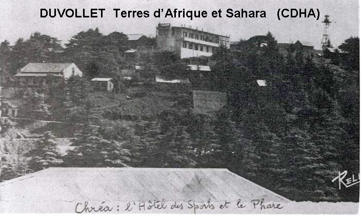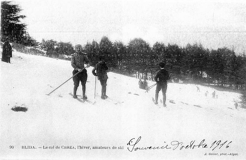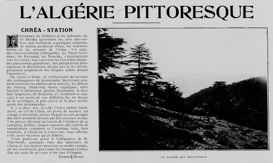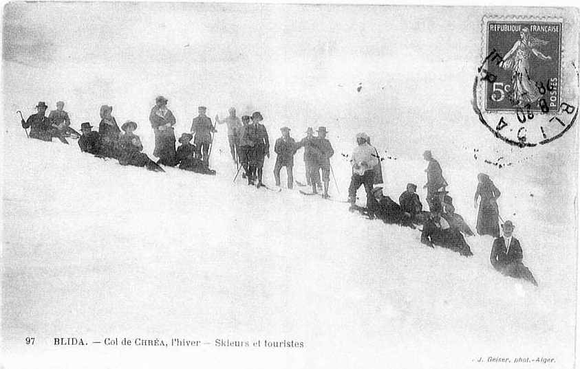 CHREACHREA !….Nom évocateur pour les fervents de la montagne, les excursionnistes, les touristes, les sportifs, les intellectuels, les poètes, les malades... Chréa présente divers aspects selon les saisons. L'hiver, avec ses sommets neigeux, c'est le paradis des skieurs. Le printemps, c'est un tapis de violettes et de boutons d'or. L'été, c'est un lieu édénique de repos. L'automne, c'est le rendez-vous d'amateurs de savoureux champignons. A une heure environ de la Capitale, et située à 1.550 mètres d'altitude, la station de Chréa est accessible aux automobilistes par une magnifique route macadamisée de 19 km. 500, en lacets capricieux. Mais pour le montagnard, la distance est réduite à 8 km. seulement si l'on emprunte les traverses qui sont, d'ailleurs, très praticables et agréables surtout par les paysages que l'on y découvre. Le climat est idéal et satisfait les plus difficiles. La végétation consiste principalement en superbes et imposants cèdres plusieurs fois centenaires, en chênes verts et en ifs. Bien que Chréa soit habitable en toute saison, il faut admettre, néanmoins, que la station est plus particulièrement attrayante aux époques hivernales et estivales. Dès Décembre, la neige atteignant parfois une couche de plus de deux mètres, comble de satisfaction les skieurs qui arrivent des quatre coins de l'Algérie. Car nul n'ignore que, sous l'impulsion intelligente et soutenue du "SKI-CLUB ALGERIEN" et d'un moniteur aguerri, de grandes manifestations sportives ont lieu chaque année sur une piste merveilleuse avec remonte-pente. A mi-Juin, Chréa devient le domaine des promeneurs et des excursionnistes. De Juillet à Septembre, c'est également un centre important de colonies de vacances, parmi lesquelles celles de Boufarik, de Marengo. de la Base Aérienne de Blida, de la Marine, de la Croix Rouge, etc... Ces organismes, bien agencés et où l'hygiène prédomine, reçoivent des enfants de tous âges qui demeurent, durant leur séjour, sous contrôle sanitaire constant et rigoureux. Dans tous les sens, la montagne peut être parcourue par des sentiers muletiers, des chemins forestiers très bien entretenus, et quelques fois même des routes larges de trois à quatre mètres. L'eau, d'une fraîcheur remarquable, abondante et délicieuse, arrive dans les vallées en fantaisistes cascades flanquées d'une reposante verdure constituée de capillaires et de vignes vierges.