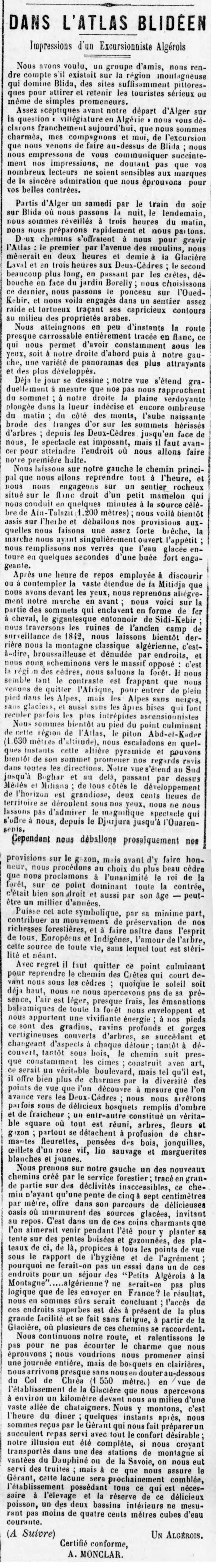 Les Glacières (3 km.), où l'on trouve, à l'étape, un véritable bouquet d'arbres droits comme des I. Le pic de SIDI-ABDELKADER (5 km.), d'accès très facile, où l'on peut visiter le Refuge et le Marabout. Les cols de NZATEN et de TALAZIT (10 km.) que l'on atteint par un sentier assez escarpé, en corniche parfois, très pittoresque. A quelque deux cents mètres du col de Talazit jaillit, d'un rocher imposant, une abondante source déversant ses eaux dans la vallée de La Chiffa qui s'ouvre vertigineusement devant soi.