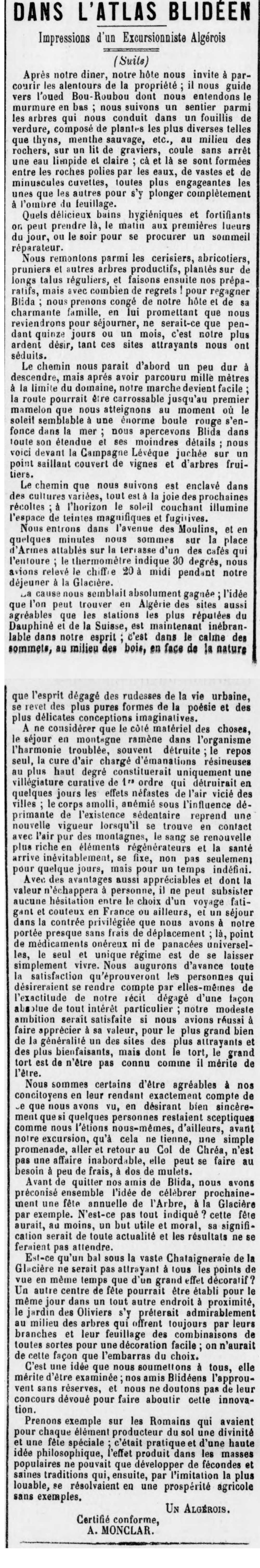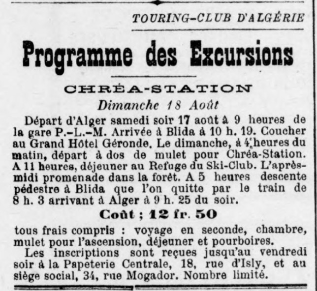 Partir de la Place d'Armes, remonter la rue Tirman, pénétrer dans l'avenue des Moulins. A une cinquantaine de mètres à peine, tourner à gauche par un chemin qui longe tout d'abord des villas, puis qui se libère, pique vers la montagne par une rampe assez raide, et s'élève peu à peu au-dessus de la ville. Ce chemin est dit route des Glacières. Il aboutit au col de Chréa, lieu d'excursion réputé, à 22 kms de Blida. On ne saurait en effet en recommander de meilleure, offrant de plus merveilleux points de vue. A mesure que l'on s'élève, le regard s'étend sur la plaine. L'horizon s'agrandit. A trois kilomètres, c'est déjà tout un panorama qui se déploie aux pieds du voyageur: toute la vaste plaine de la Mitidja, les figures géométriques dessinées par les propriétés, les longues lignes des plantations, le damier blanc et bleu de Blida. Puis la route carrossable tourne, grimpe hardiment à flanc de montagne, parfois encaissée entre les talus, parfois bordée de ravins, ou débouchant en terrasse et comme coupée sur l'infini. Bientôt on atteint la région boisée. Et voici les Glacières (1.210 m., 20 km.). Jadis, c'est-à-dire jusqu'à 1931 un Hôtel hospitalier s'abritait au milieu d'un bois de pins. La ville de Boufarik a acheté l'hôtel, le domaine, ses dépendances et les a convertis en camp pour ses « enfants à la montagne ». Un vaste bassin où le ciel se mire entretient en été une fraîcheur constante. L'endroit tire son nom des silos où l'on conservait autrefois la neige tombée pendant l'hiver. Les riches rhaïs de Blida ou d'Alger, tout comme le commun des mortels aimaient se rafraîchir. On transportait donc à dos de mulet cette neige de conserve, ce qui d'ailleurs la rendait assez chère, la moitié de la charge fondant en route. A partir des Glacières la route s'engage dans les hauteurs boisées. On atteint rapidement Chréa, 1.550 m. La station de Chréa est à la fois station d'hiver et station d'été. Station d'hiver, elle offre aux amateurs de ski des pentes agréables, aux simples promeneurs, une atmosphère vivifiante, tonique. Le Ski Club Algérien y a fait élever un refuge important inauguré officiellement en Février 1930. Station d'été, elle offre le charme de paisibles flâneries sous les cèdres, sur les hauteurs, dans les vallons, un air plus frais que dans la plaine, le calme des sommets. Le nombre croissant des chalets prouve son succès auprès des estivants. Plusieurs hôtels confortables, d'accès facile permettent et encouragent le séjour. Des services d'autobus nombreux assurent des relations rapides avec Blida. L'eau d'alimentation, captée à la source de Kerrach, est amenée à la station par refoulement. Petite Norvège africaine, l'hiver, Chréa devient, l'été une oasis de fraîcheur et un admirable belvédère. On y embrasse un spectacle unique, un panorama d'avion : Au nord-ouest, c'est le massif du Zaccar, le mont Chenoua massif, la baie de Tipasa,le fameux Tombeau de la Chrétienne. Au nord, l'immensité bleue de la Méditerranée sert de toile de fond aux coteaux de Bou-Smaïl, de Koléa, à l'embouchure du Mazafran. Au nord-est s'allongent les coteaux du Sahel, Staouéli, Sidi-Ferruch, Guyotville... A l'est se dresse le massif du Djurdjura, au sud les monts échelonnés de l'Atlas. Le Syndicat d'Initiative se préoccupe de l'installation d'une table d'orientation, et de l'érection d'une tour belvédère, avec le concours des Amis de Chréa. Assurément plus nombreux que les fameux cèdres du Liban, les cèdres de Chréa épandent le soir dans l'air calme leur parfum balsamique. Et rien n'est plus beau que la descente en auto sur Blida quand le ciel reste encore clair au-dessus des montagnes noyées d'ombre.