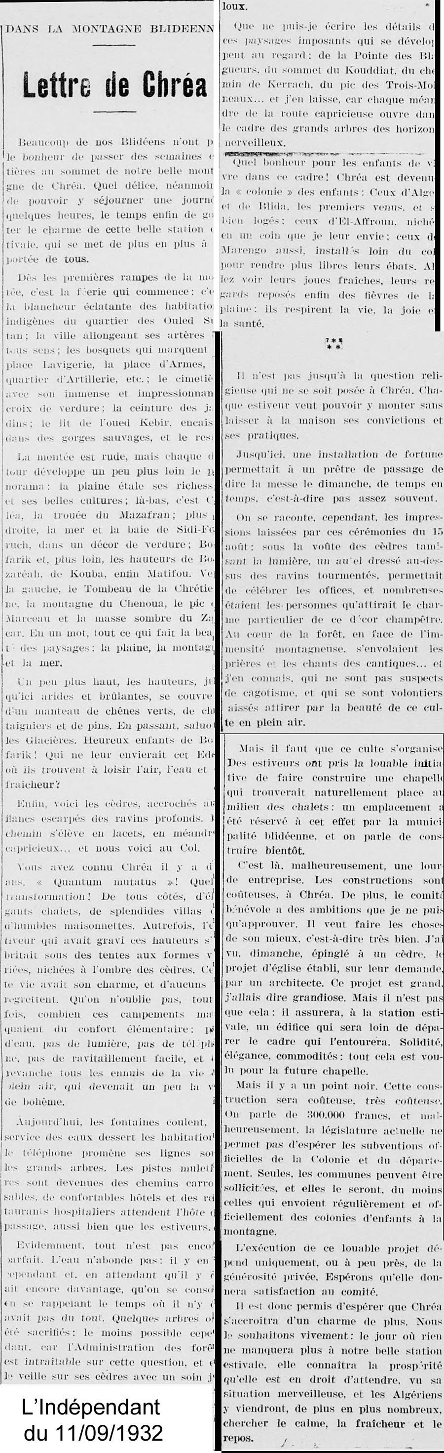 La Chapelle de Notre Dame des Cèdres à Chréa a été construire de 1933 à 1934. Vous pouvez en lire les détails dans le chapitre V de la monographie du Chanoine A.Vial de Blida écrite en 1936 |