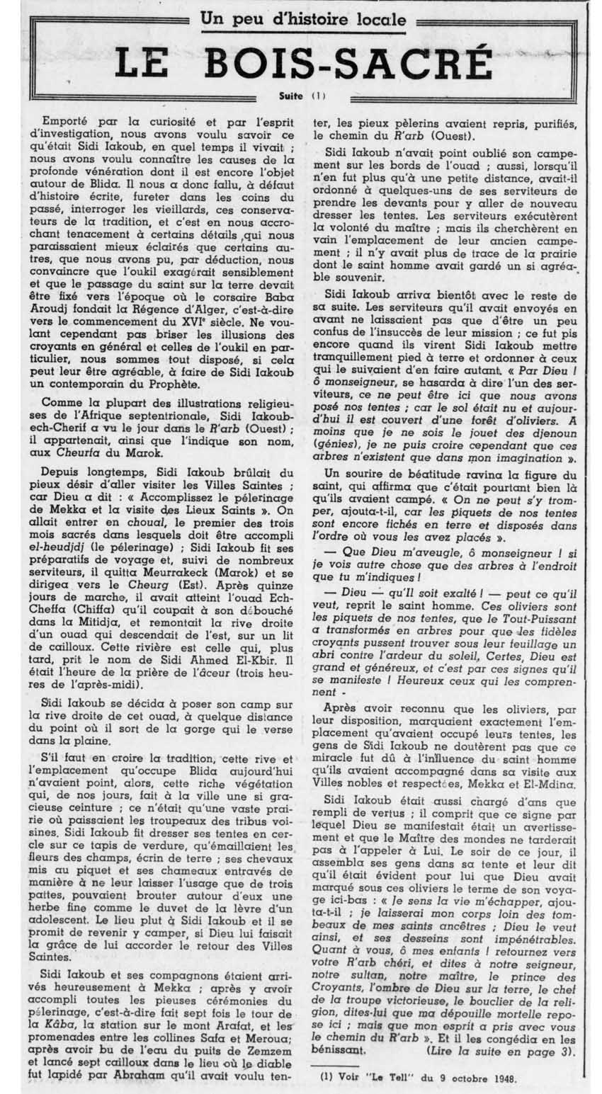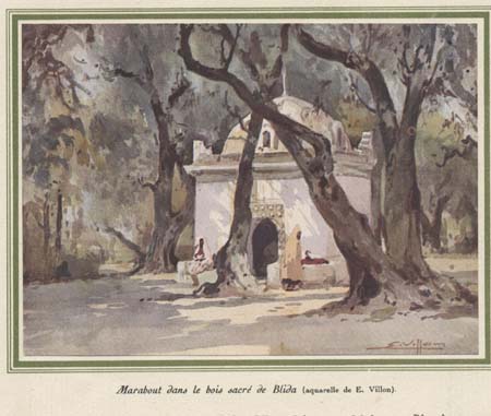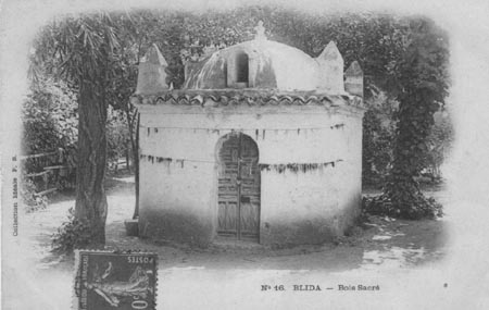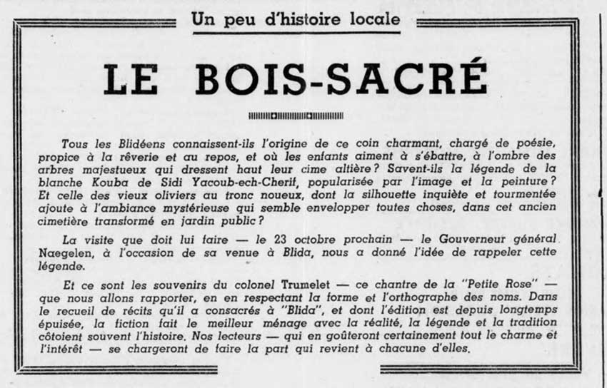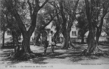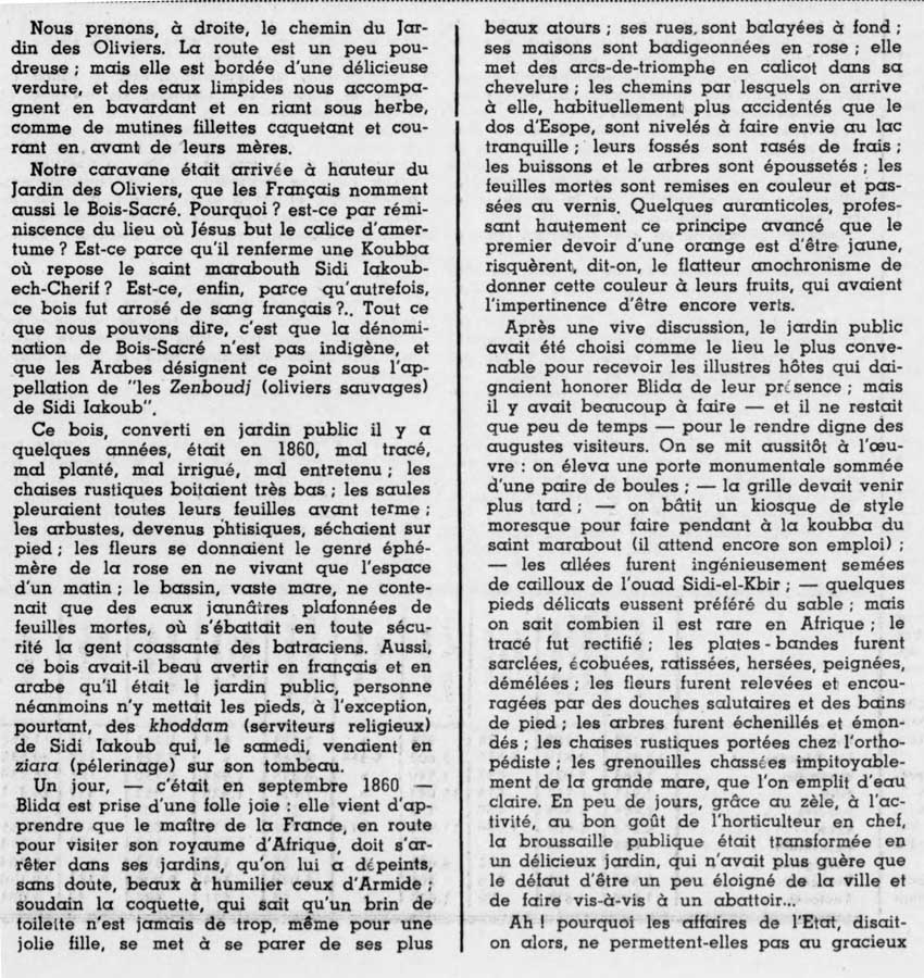 BLIDA Récits selon La légende, la tradition et l'histoire par le Colonel C. Trumelet Le bois sacré Notre caravane était arrivée à hauteur du Jardin des Oliviers, que les Français nomment aussi le Bois-Sacré. Pourquoi? Est-ce par réminiscence du lieu où Jésus but le calice d'amertume? Est-ce parce qu'il renferme une koubba (1) où repose le saint marabouth Sidi lakoub-ech-Cherif? Est-ce, enfin, parce qu'autrefois, ce bois fut arrosé de sang français?... Tout ce que nous pouvons dire, c'est que la dénomination de Bois-Sacré n'est pas indigène, et que les Arabes désignent ce point sous l'appellation de « les Zenboudj (2) de Sidi Iakoub, » Ce bois, converti en jardin public il y a quelques années, était, en 1860, mal tracé, mal planté, mal irrigué, mal entretenu; les chaises rustiques boitaient très bas; les saules pleuraient toutes leurs feuilles avant terme; les arbustes, devenus phtisiques, séchaient sur pied; les fleurs se donnaient le genre éphémère de la rosé en ne vivant que l'espace d'un matin; le bassin, vaste mare, ne contenait que des eaux jaunâtres plafonnées de feuilles mortes, où s'ébattait en toute sécurité la gent coassante des batraciens. Aussi, ce bois avait-il beau avertir en français et en arabe qu'il était le Jardin public , personne, néanmoins, n'y mettait les pieds, à l'exception, pourtant, des khoddam (serviteurs religieux) de Sidi Iacoub, qui, le samedi, venaient en ziara (pèlerinage) sur son tombeau...............................