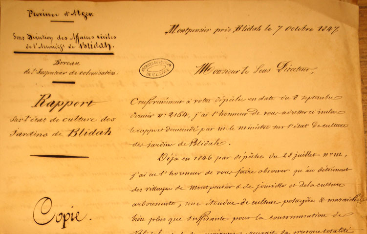 Conformément à votre dépêche en date du 8 septembre dernier N° 2164, j'ai l'honneur de vous adresser ci inclus le rapport demandé par M. le Ministre sur l'état de culture des jardins de Blidah. Déjà en 1846 par dépêche du 28 juillet N° 112,j'ai eu l'honneur de vous faire observer qu'au détriment des villages de Montpensier et de Joinville et de la culture arborescente, une étendue de culture potagère et maraichère bien plus que suffisante pour la consommation de Blidah et des environs, recevait sa presque totalité d'eau de l'oued el Kébir et que les 4/5 ou les ¾ au moins des légumes fournis par la culture potagère étaient des excédants de la consommation et servaient à la nourriture des porcs, à l'éducation desquels se livrent en général nos jardiniers qui afferment des jardins pour s'occuper de cette industrie. Pour palier aux inconvénients signalés plus haut, je proposais de ne pas accorder d'eau à ceux qui ne supprimeraient pas la majeure partie des légumes pour la remplacer par des plantations d'arbres ou par des pépinières. Avant la crise pécuniaire qui existe malheureusement toujours, Blidah était peuplé bien plus qu'il ne l'est aujourd'hui. Les immeubles intra et extra muros étaient vendus et revendus à des prix énormes pour y établir des constructions, mais la population diminuait de jour en jour dès 1846, les constructions projetées devinrent inutiles pour l'intérieur de la ville et en partie impossible autour de son enceinte extérieure à cause des 1iere 2 ième et 3 ième zones militaires sur lesquelles il était défendu de bâtir. Les acquéreurs ont donc dû chercher un moyen quelconque pour qu'une partie de l'intérêt de leurs capitaux leur rentrât. Ils ont pensé aux jardins potagers qui sont les plus tôt établis et d'un plus prompt rapport et alors on a vu en culture des terrains incultes sur lesquels existaient avant d'anciens chemins abandonnés , des cimetières arabes, des habitations mauresques en ruine et à la fin de 1846 et de 1847 ont vu plus que doubler l'étendue des cultures potagères , tandis que la population de Blidah allait toujours en décroissant; mais peu importait aux propriétaires, puisqu'ils rencontraient des espagnols et des maltais qui s’engageaient à leur payer une redevance annuelle et se livraient à la culture des nouveaux jardins, sachant qu'ils vendraient peu de légumes mais qu'ils trouveraient la consommation de l'excédent de la vente en nourrissant des porcs. On a même été plus loin, on a converti en jardin potager d'une étendue immense, des terrains qui n'auraient jamais été affectés qu'à la culture des céréales. Tout en