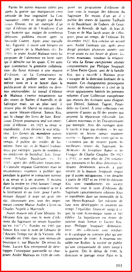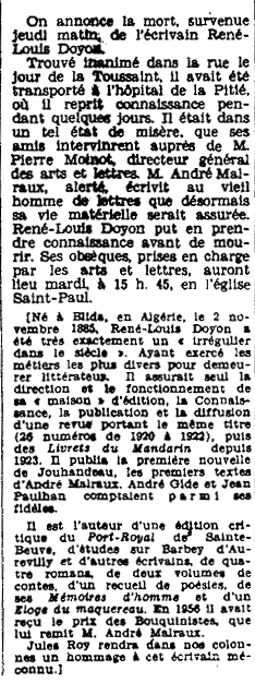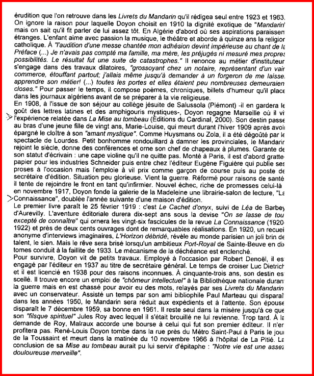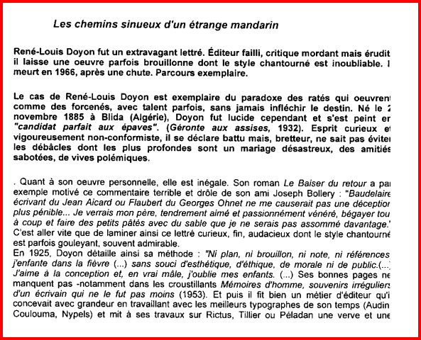 d’édition en 1918. Son premier livre paraît en février 1919. Après le déclin de son entreprise, Doyon vit difficilement, tout en publiant, seul, les Livrets du Mandarin. L’éditeur Robert Denoël paraît l’apprécier « Je rencontre parfois Doyon et nous parlons sur un ton amical », l’engage comme secrétaire général et rachète son fond en 1937. Leur