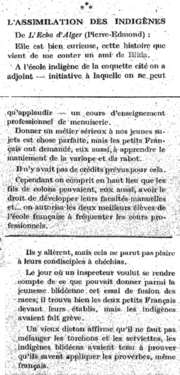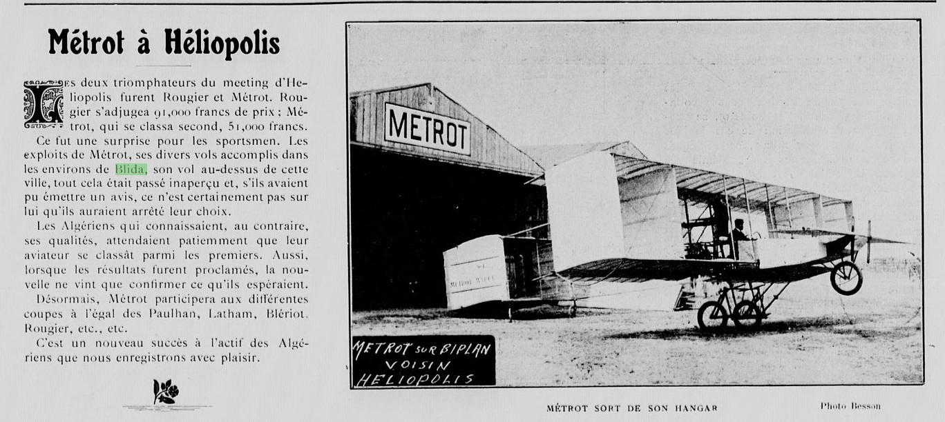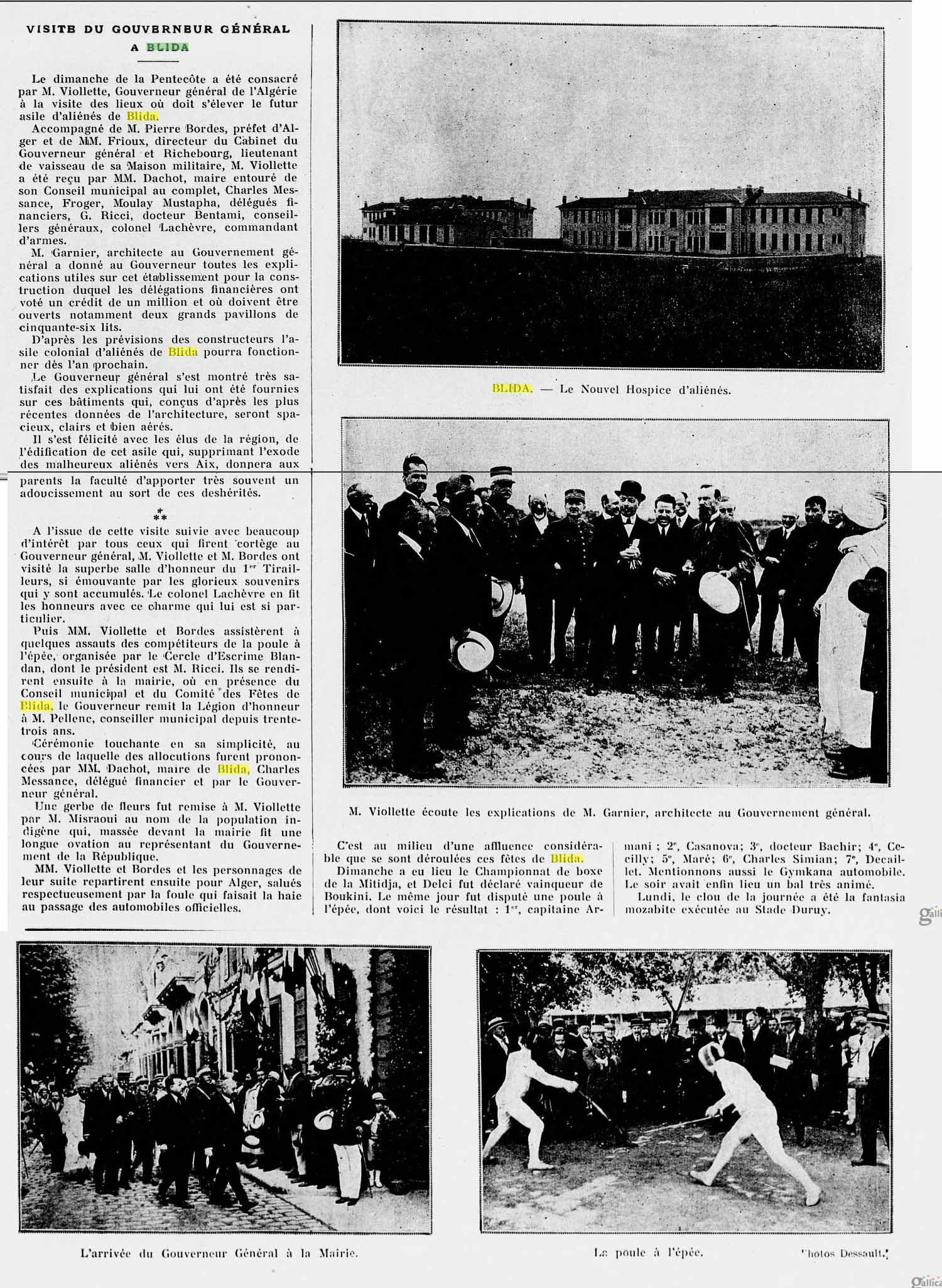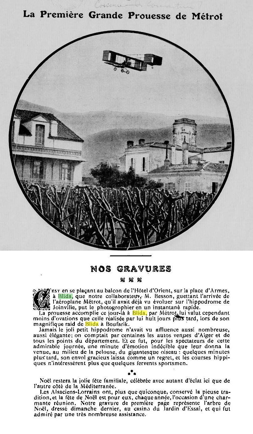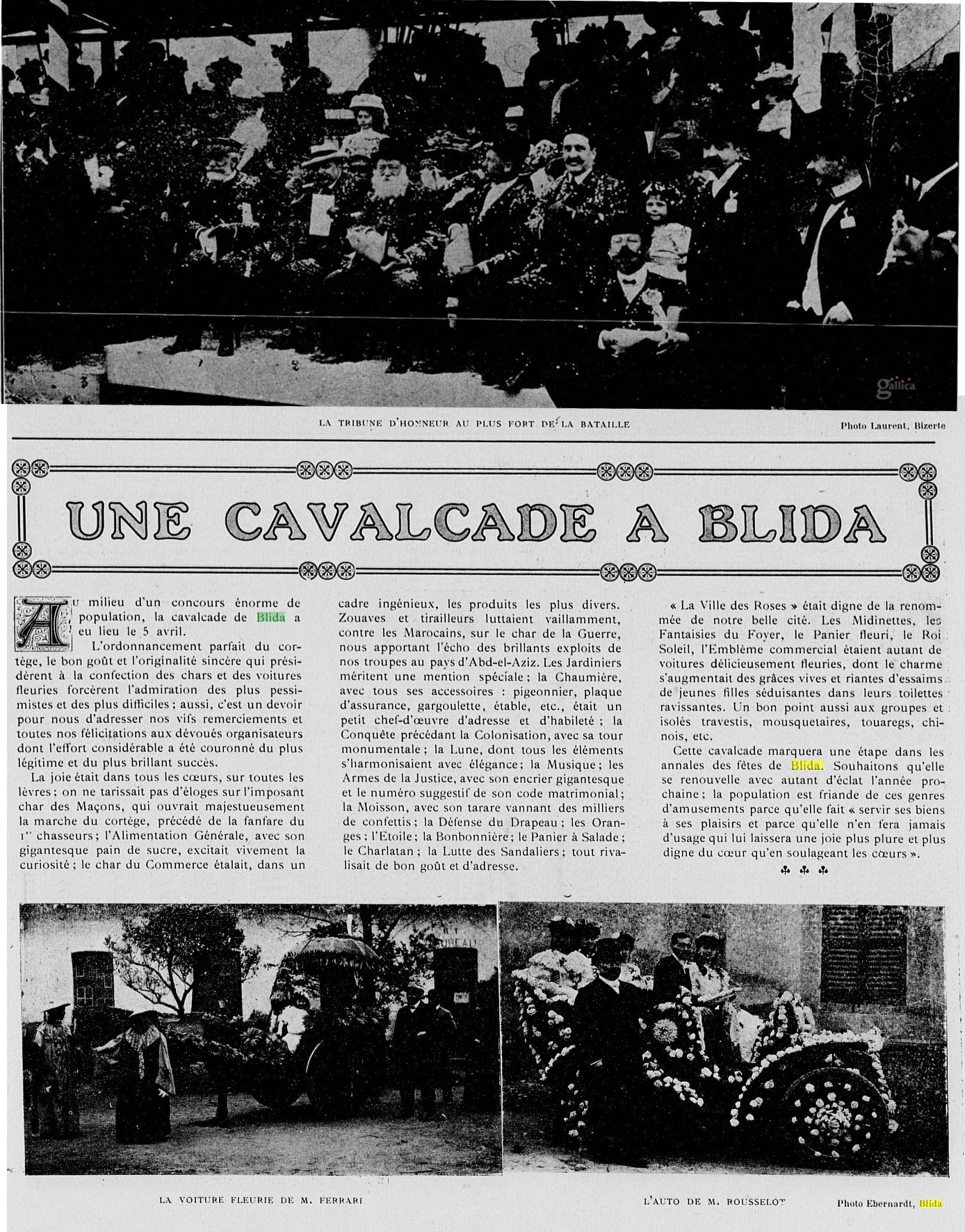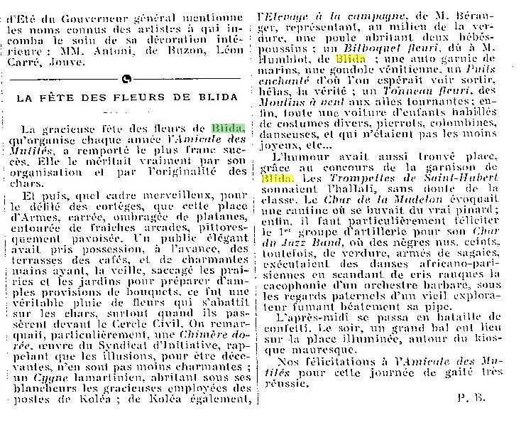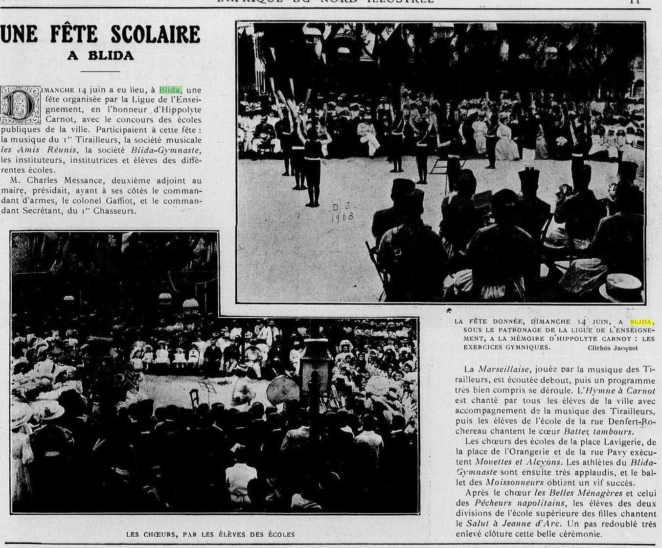 En Blida il y a 100 ans ou presque Blida Nostalgie vous propose de relire les articles des journaux d'Algérie du début du XX siècle et plus particulièrement tout ce qui se rapporte à notre ville. Ces journaux sont numérisés et sont accessibles directement à la BNF sur le site Gallica: http://gallica.bnf.fr/html/presse-et-revues/algerie Un salut amical à mes amis blidéens Guy Noël et Emile pour l'aide précieuse qu'ils m'apportent dans la recherche des documents que vous trouverez ci-dessous. Merci à eux.