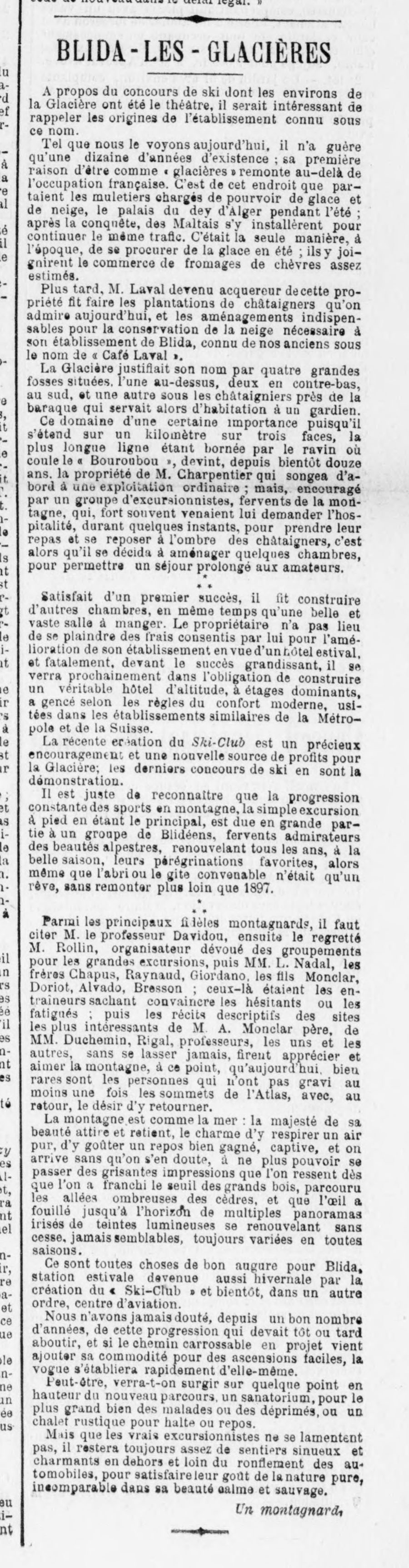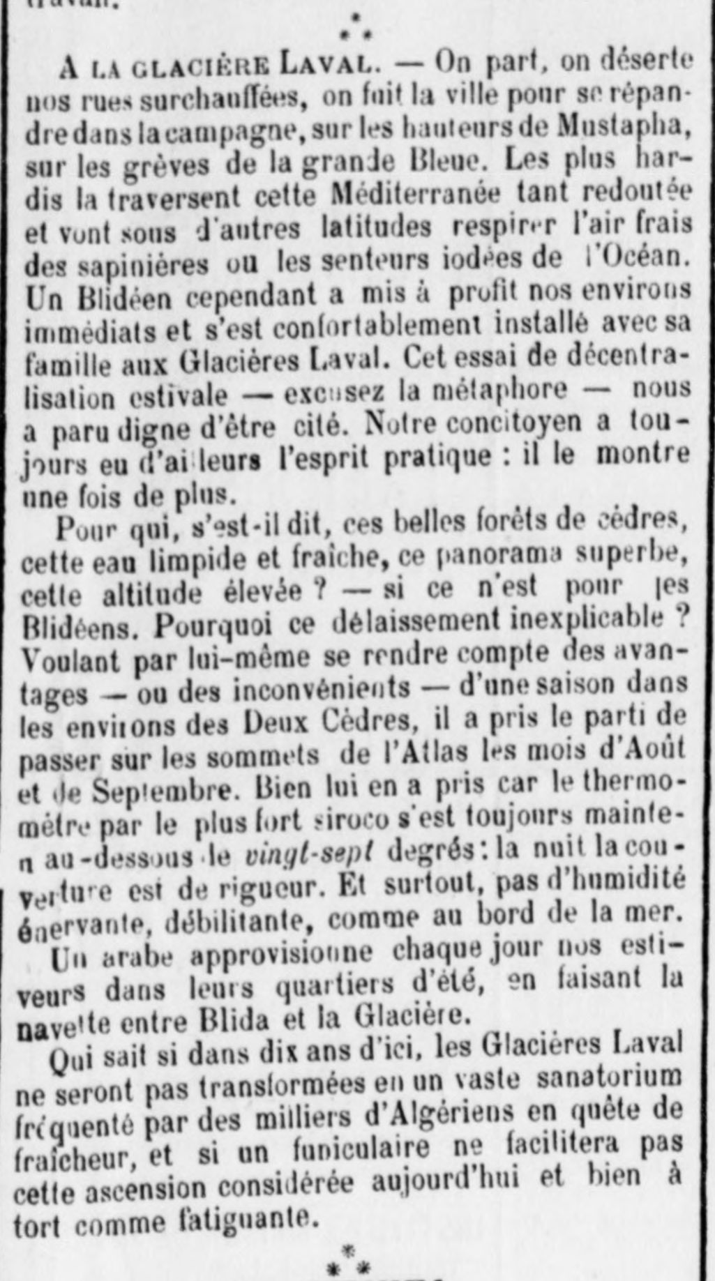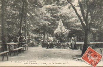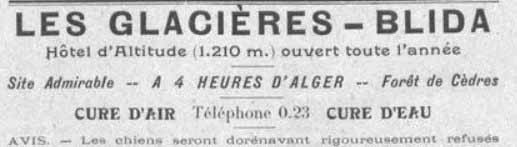 Alger-Journal-Blida-Hôtel des Glacières du 31/01/1911 Situées à 1200 m d'altitude sur la route de Chréa, leur vocation initiale avait disparu depuis longtemps mais leur renommée subsistait. C'était une halte quasi obligatoire pour profiter d'un brin de fraîcheur avant d'attaquer la fin de la montée vers Chréa. Deux textes de Mrs Darnatigues et Ernest Mallebay nous les racontent. Lire aussi celui de Jean Rigal (1906) Un aute texte de 1906 de Y.Amar Un article du Sémaphore algérien du 22/6/1913 Vers les Glacières (Octobre 1906) Les cartes postales de La Glacière Vente des Glacières à la ville de Boufarik en 1931