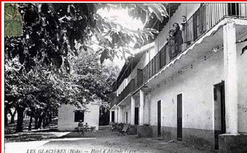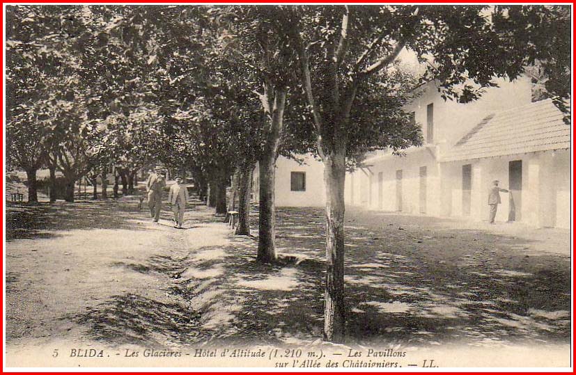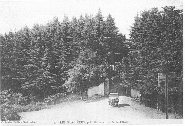 La cédraie et la châtaigneraie Il a créé ensuite une Cédraie et une Châtaigneraie devenues depuis très belles, un hôtel réputé repris par la suite par M. CASTAN ; en 1945 cet établissement sera acheté par la ville de BOUFARIK qui installe une colonie de vacances : le Petit Boufarikois à la Montagne. Le long du sentier qui menait des Glacières à CHRÉA, on pouvait voir encore les bases de ces glacières creusées dans le sol. Dès les premières chaleurs dans la plaine, 4 tonnes de cette glace étaient transportées chaque jour, à dos de mulets à BLIDA et jusqu'à ALGER par d'autres moyens. Je me souviens encore de ma première montée aux Glacières, pendant l'été 1916, bien calé dans l'une des poches du chouari fixé sur le dos d'un mulet, les bagages faisant contre poids dans l'autre poche. L'hôtel des Glacières était tenu, à l'époque, par M. CASTAN. C'est à peu près à cette date que fut ébauchée la route carrossable par une main d'oeuvre composée en majeure partie de prisonniers allemands. En 1923, cette route aboutissait aux Glacières.
