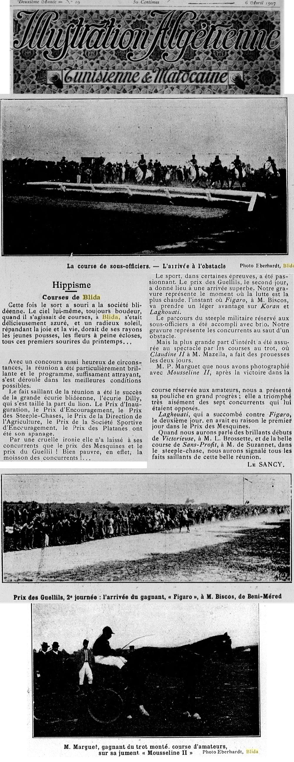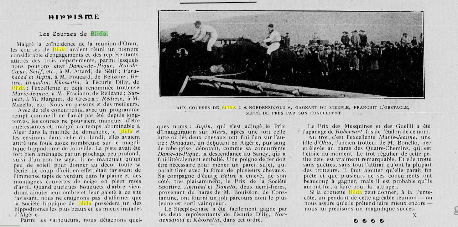 IL s'y déroulait différentes courses (galop, trot, steeple). Mes seules trouvailles se limitaient à une carte postale et une carte d'Etat major où on aperçoit le tracé de l'hippodrome de Joinville. Quel bonheur donc que cette découverte! On note la création de la Société Hyppique de la Mitidja par Mr Mauguin le 7 août 1886 Pendant les fêtes de Blida, de nombreuses épreuves s'y déroulent avec souvent des participations des militaires (steeple chase militaire). Il semble que parallèlement un deuxième champ de courses occupait le futur espace de l'HPB. Le champ de manoeuvre sera abandonné un temps pour celui de Joinville. On trouve encore des courses en 1914.