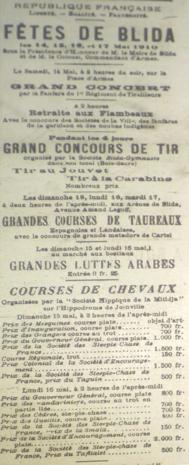 Le champ de courses était largement utilisé pendant les fêtes de Blida comme on le voit dans ce programme de 1910 |