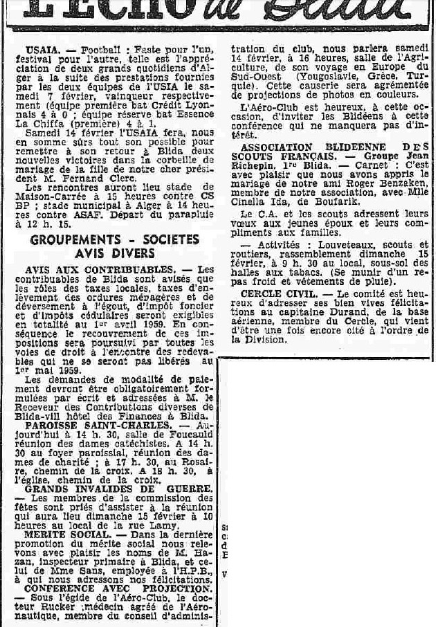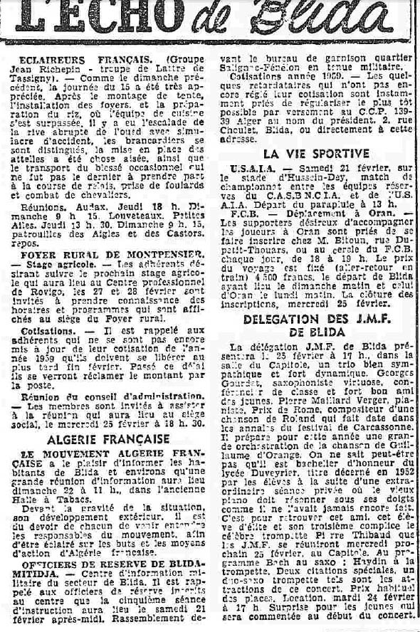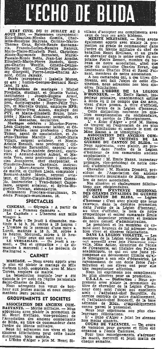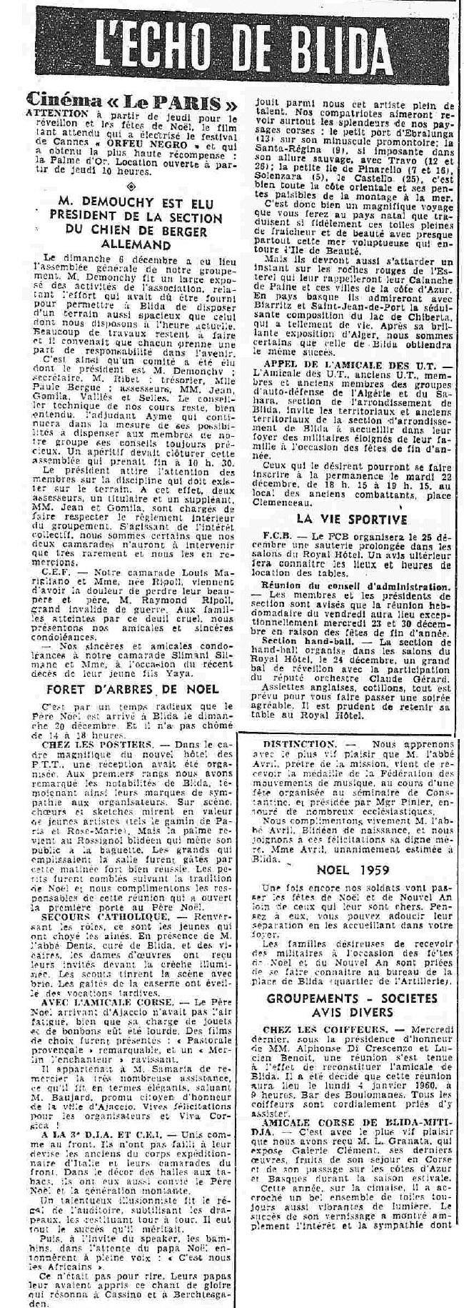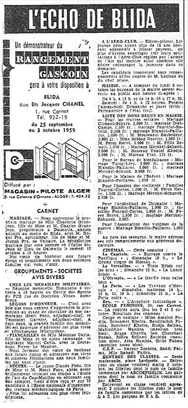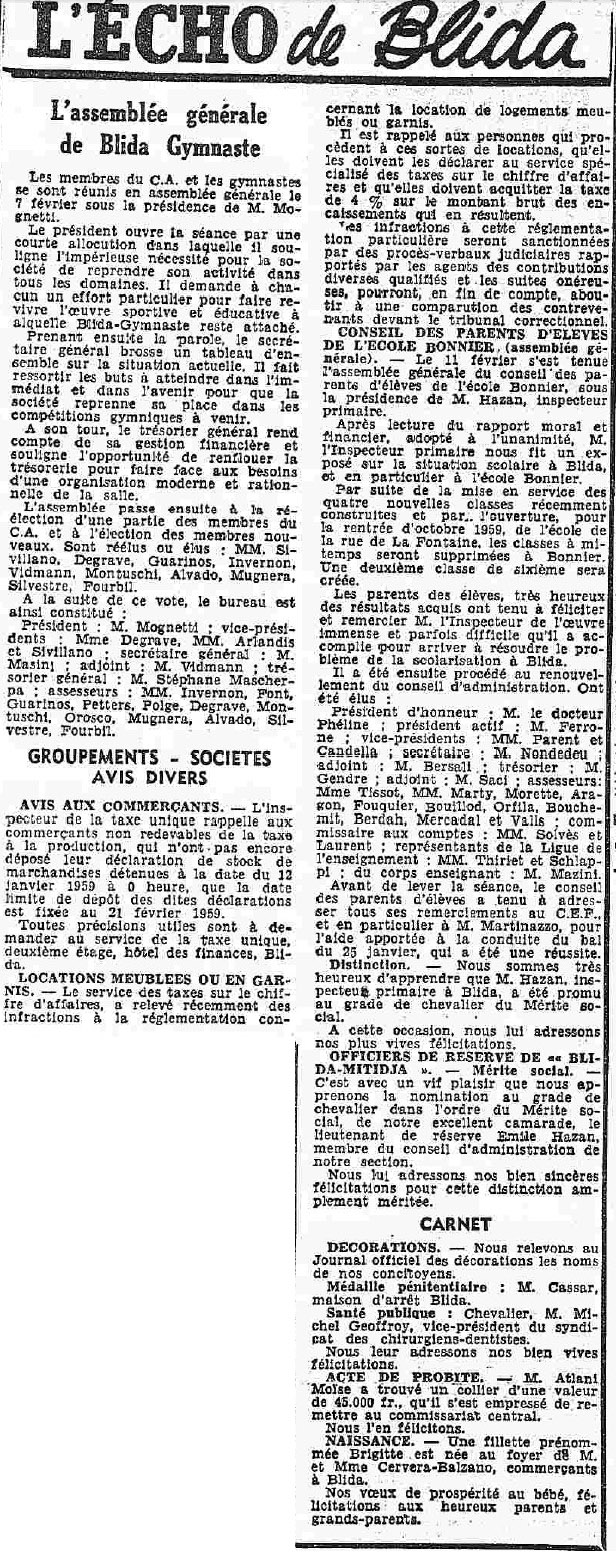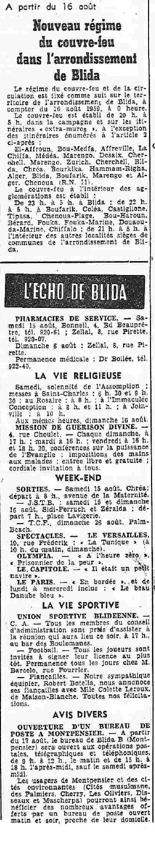 ANNEE 1959: Echos de BLIDA tirés de l'ECHO d'ALGER
