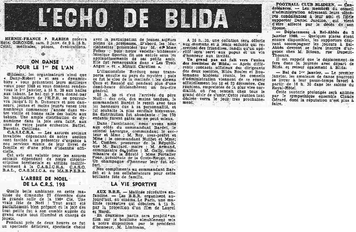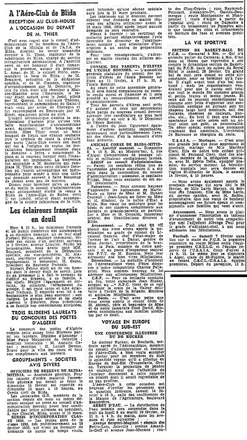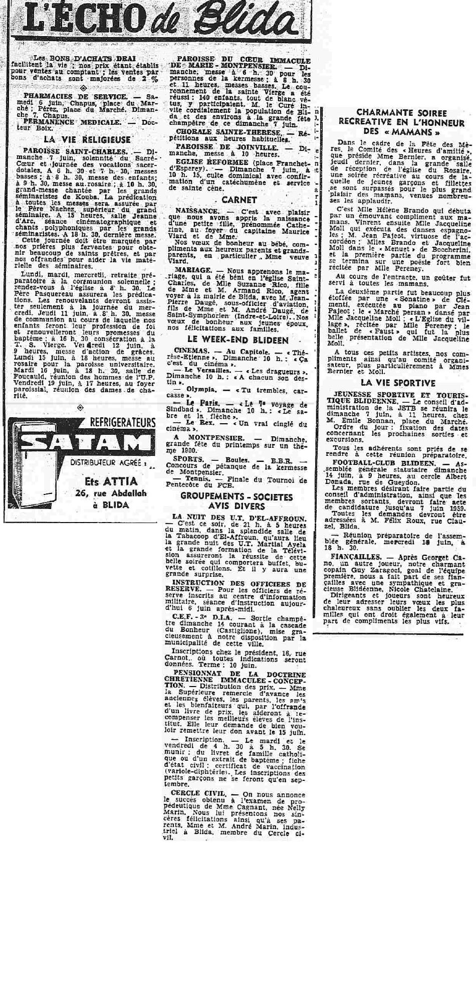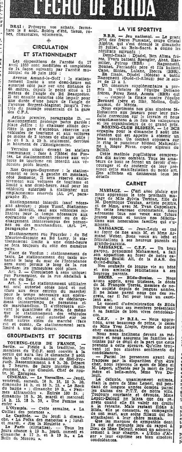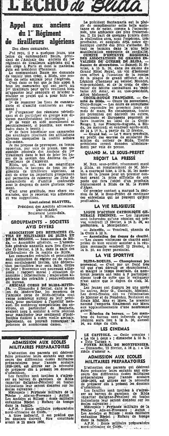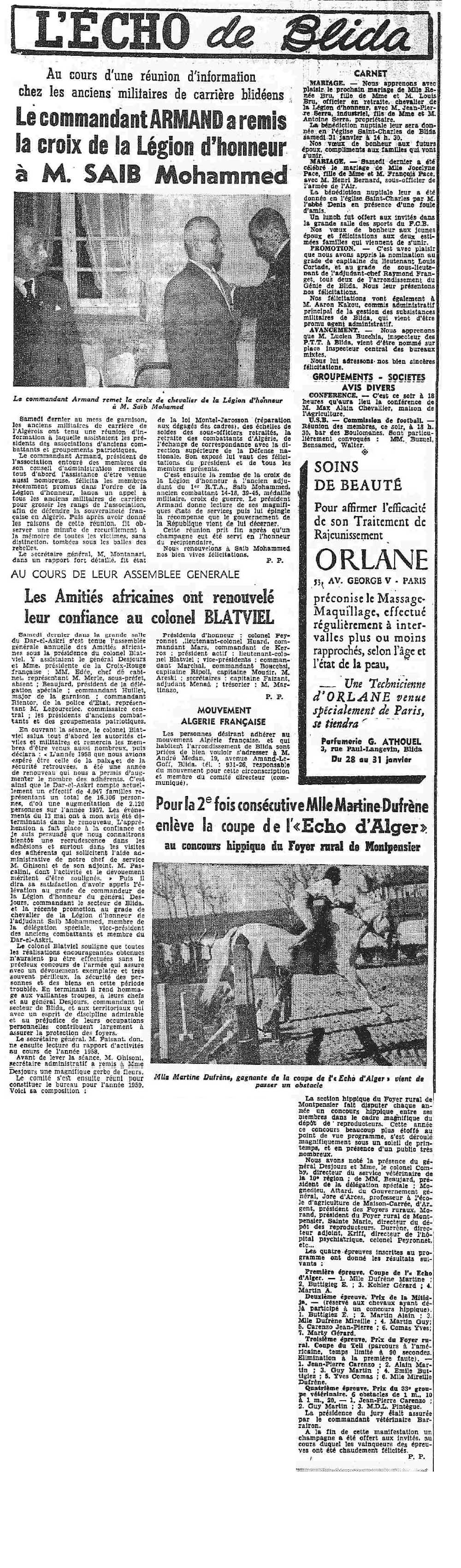 ANNEE 1959: Echos de BLIDA tirés de l'ECHO d'ALGER