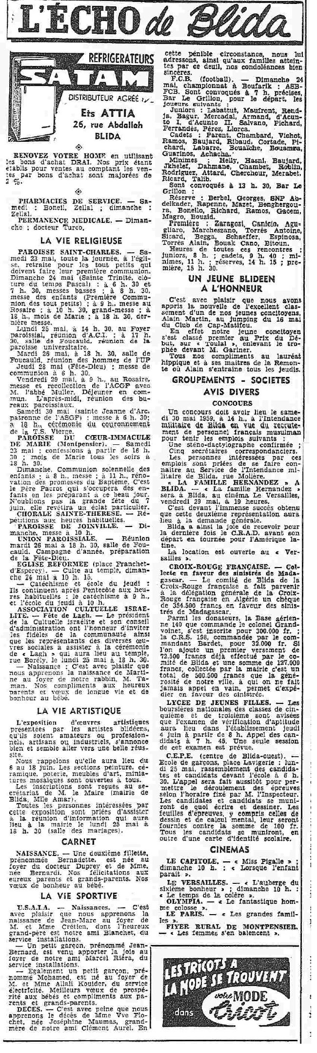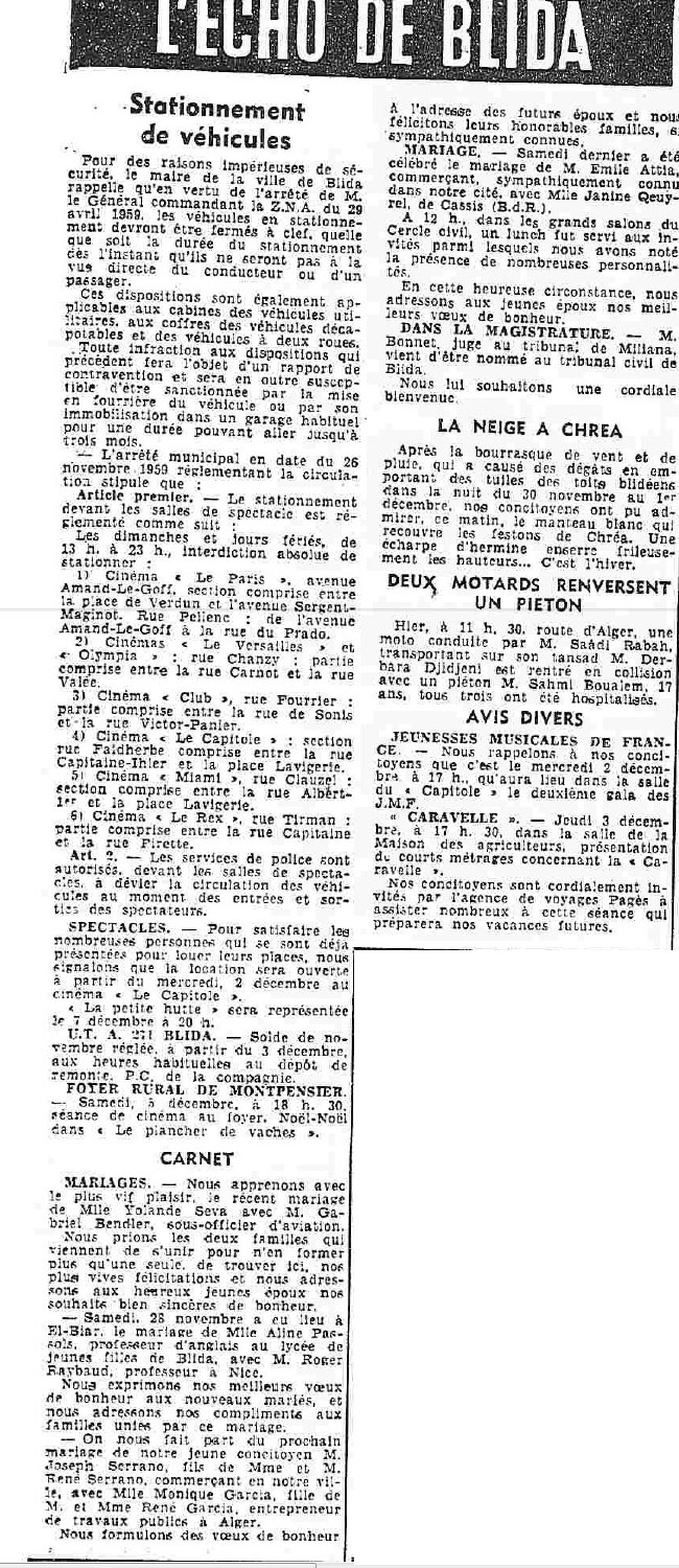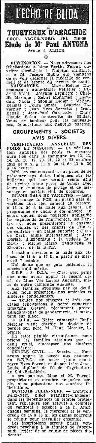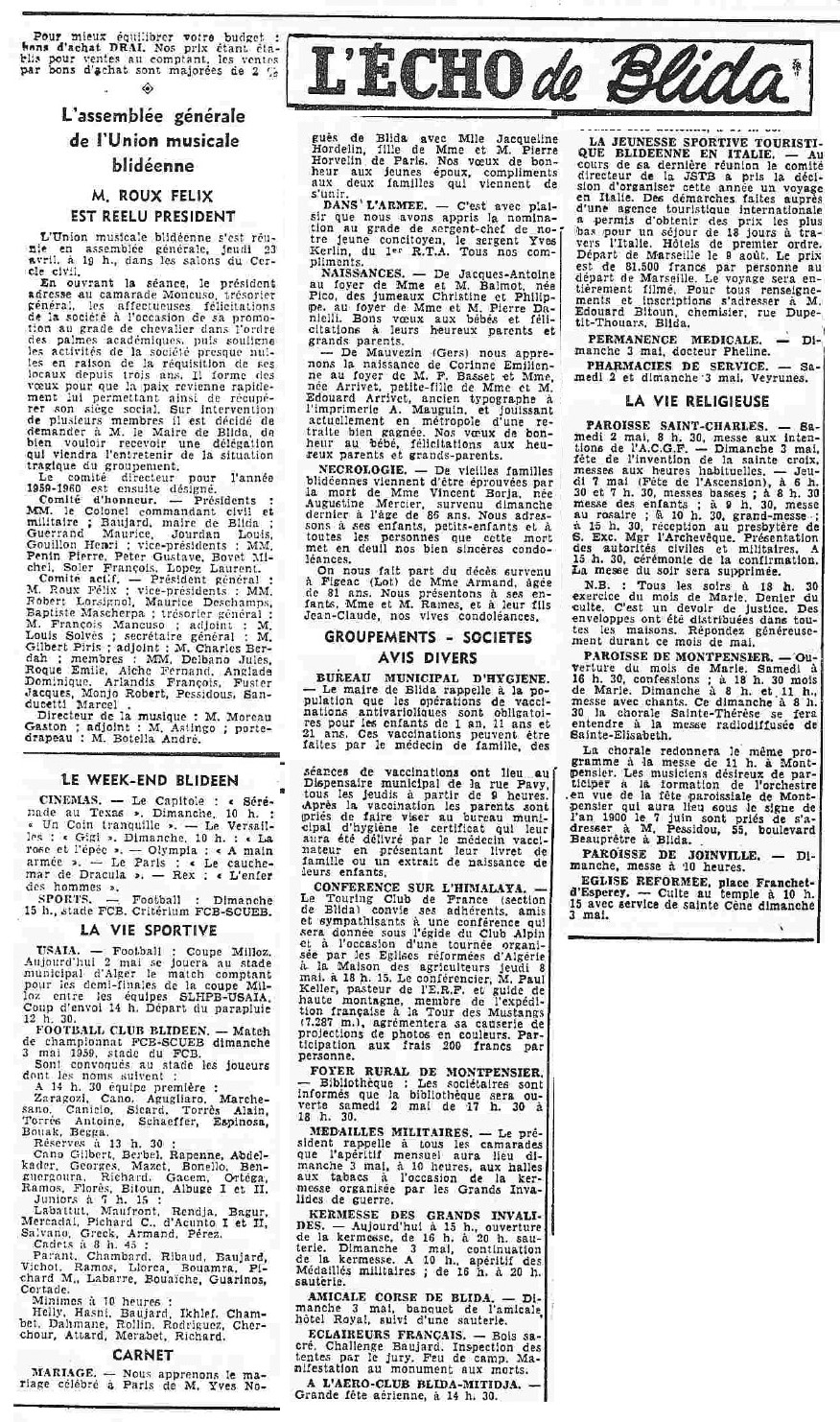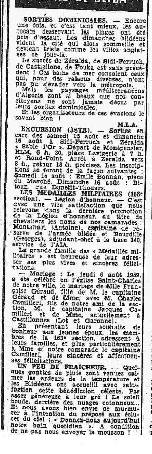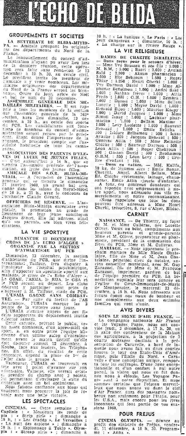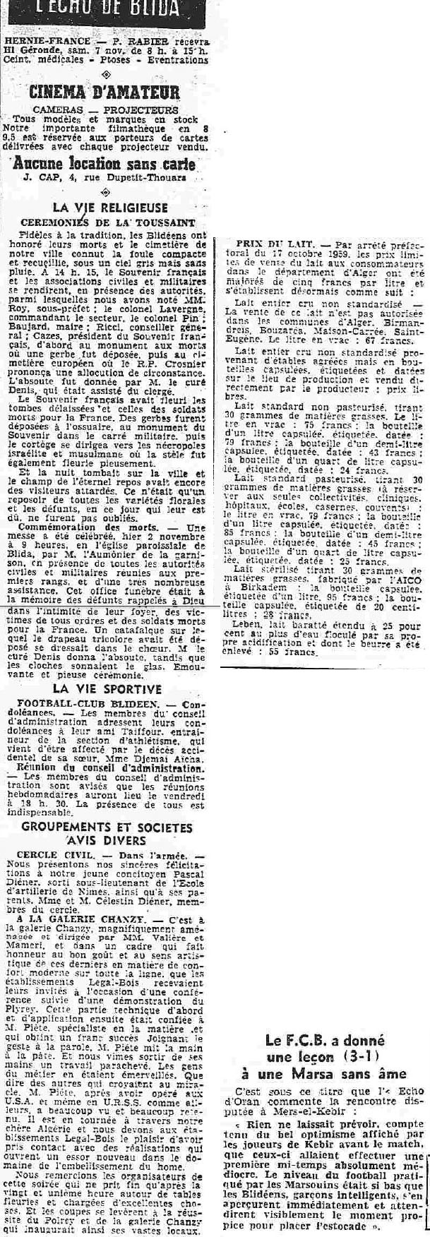 ANNEE 1959: Echos de BLIDA tirés de l'ECHO d'ALGER