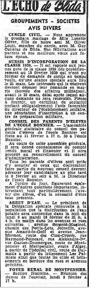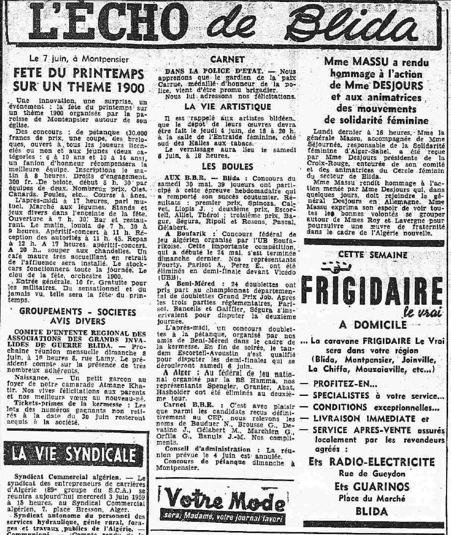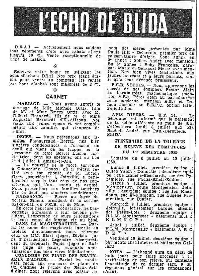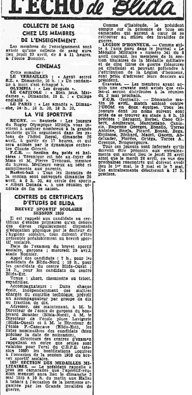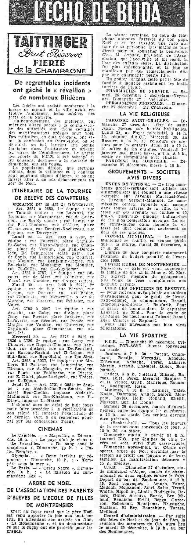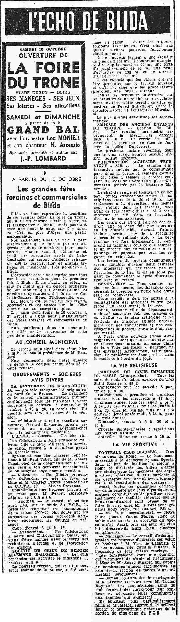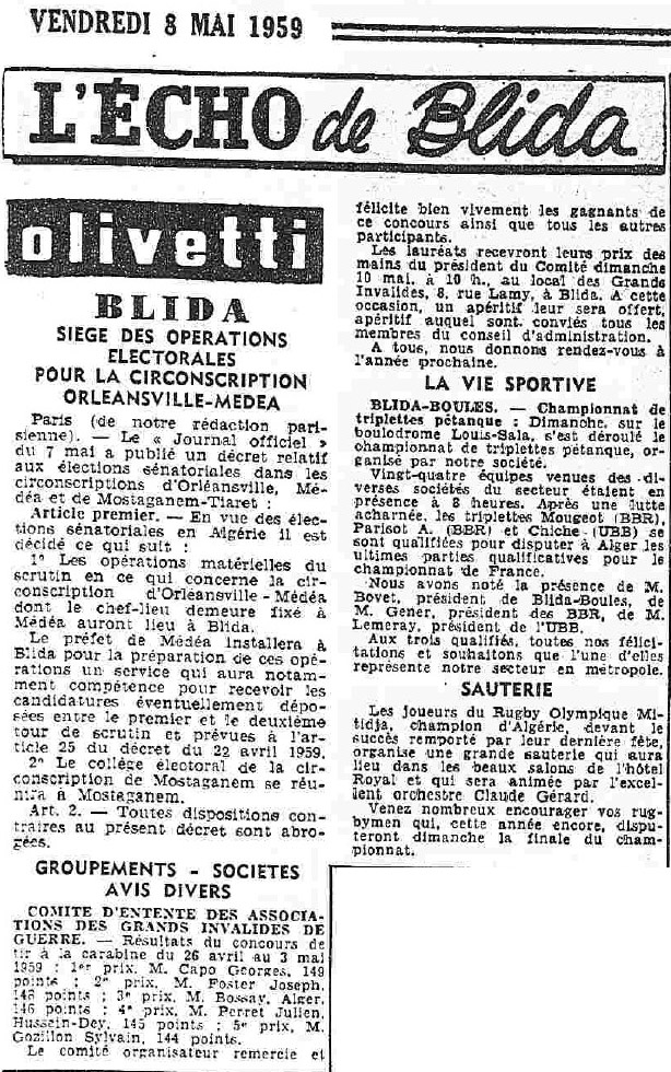 ANNEE 1959: Echos de BLIDA tirés de l'ECHO d'ALGER