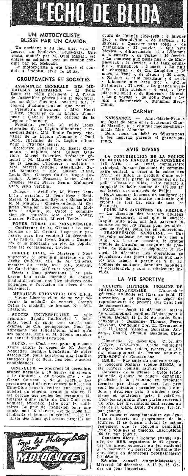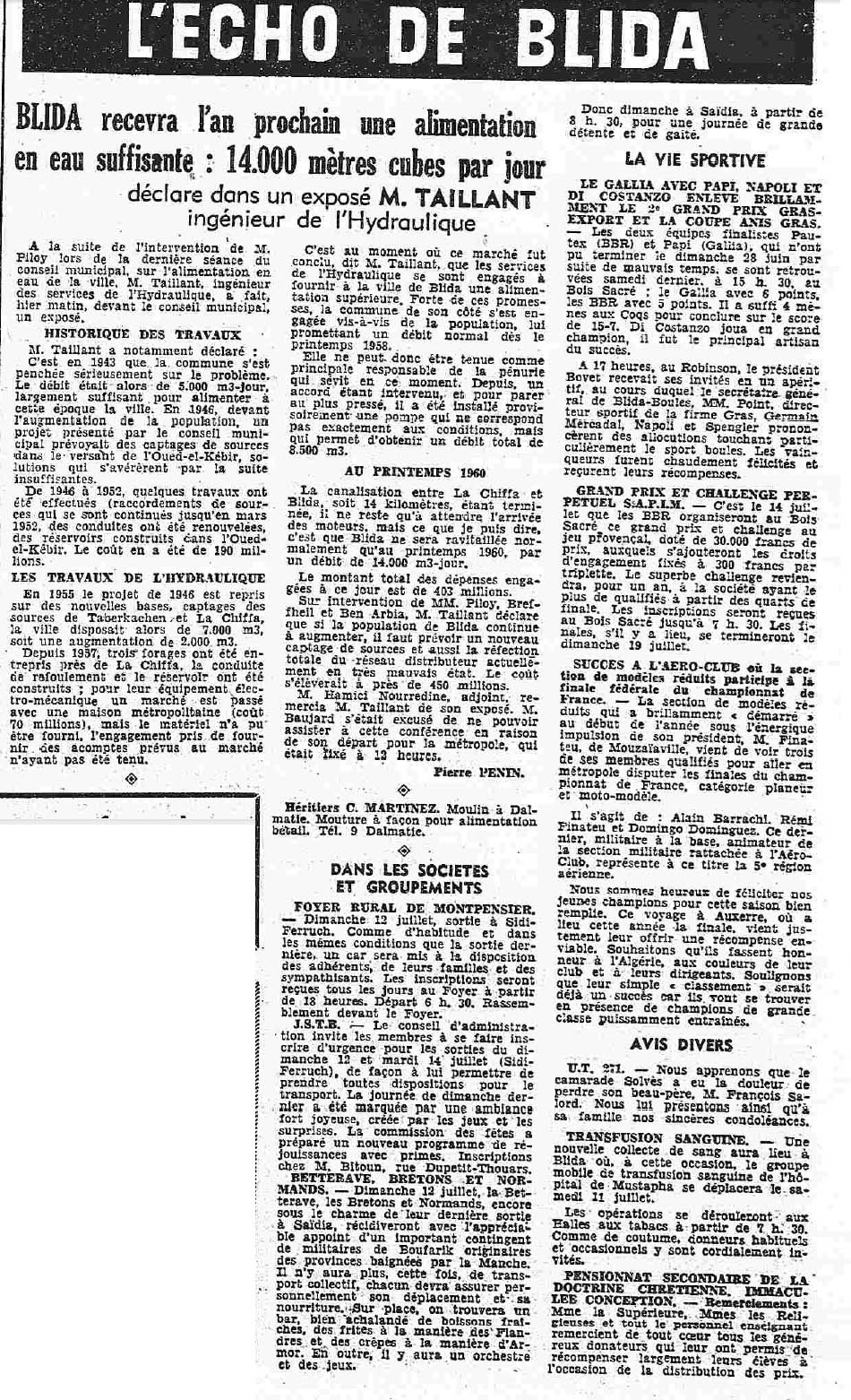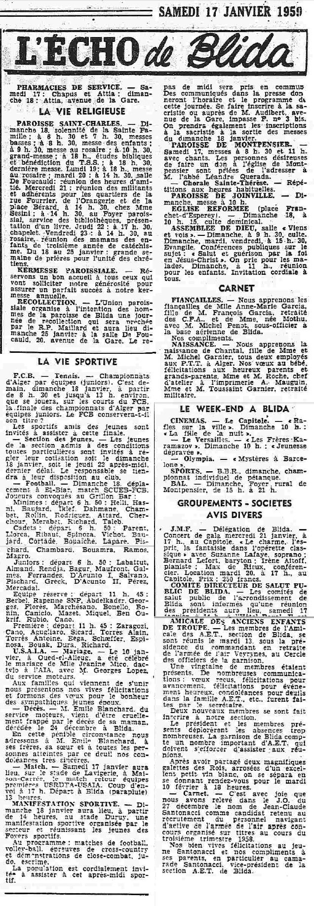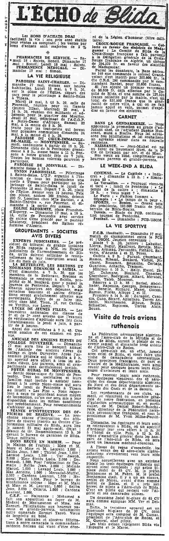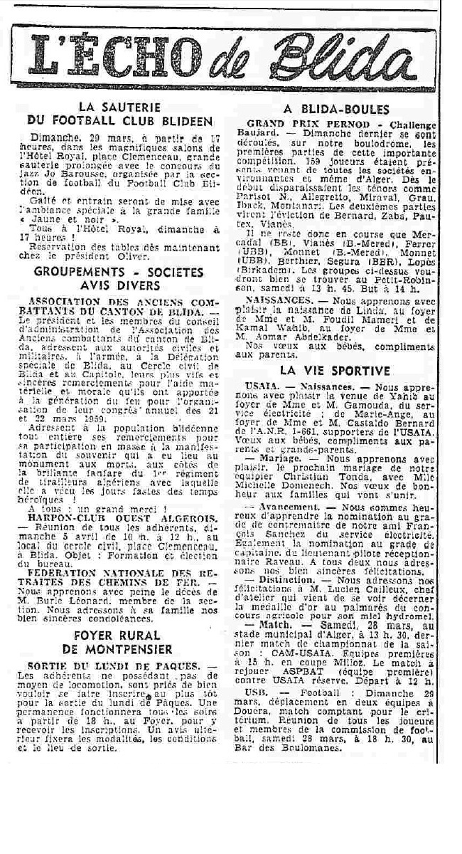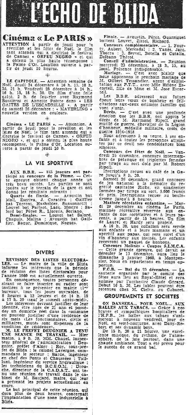 ANNEE 1959: Echos de BLIDA tirés de l'ECHO d'ALGER