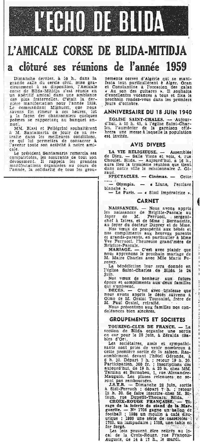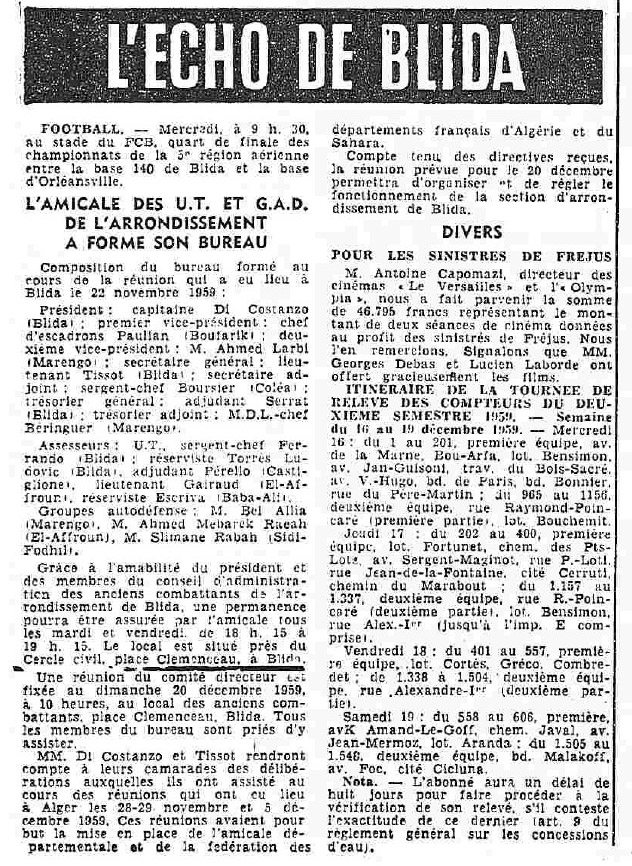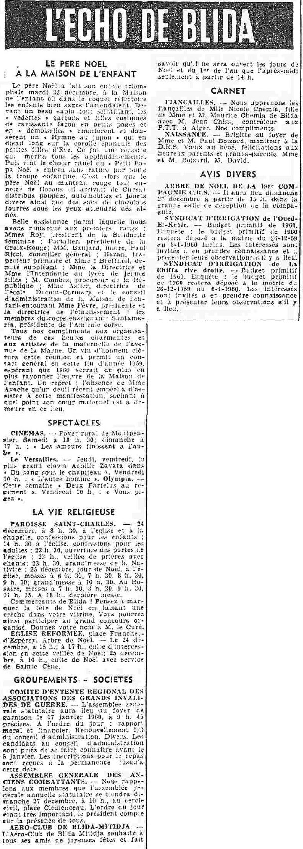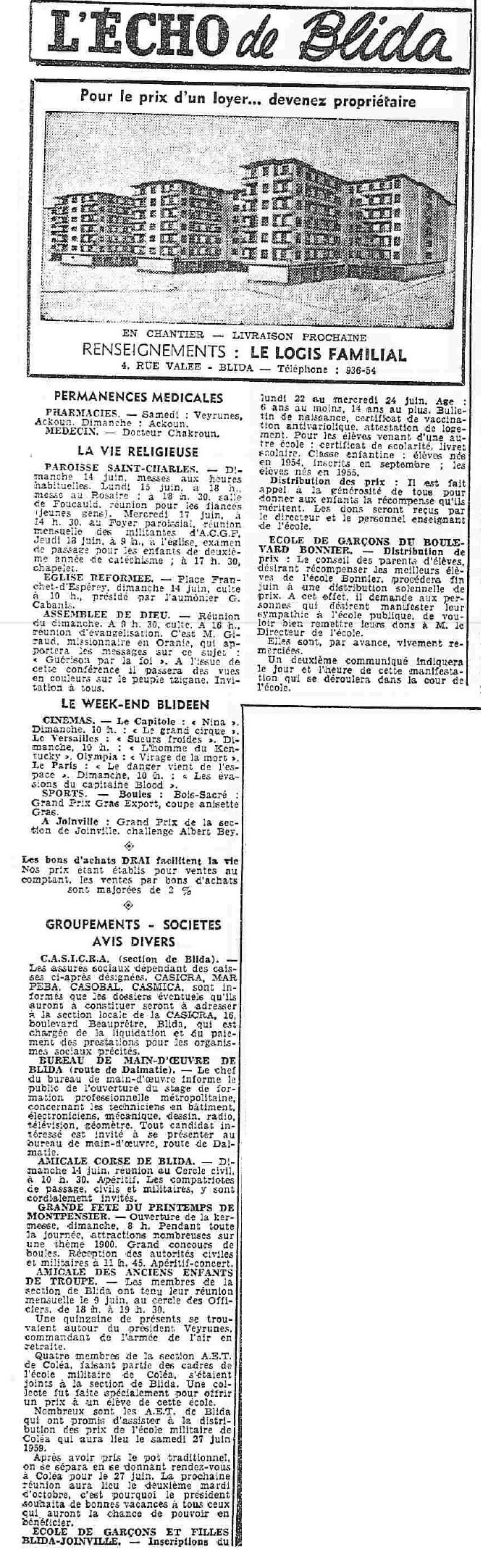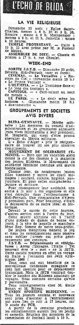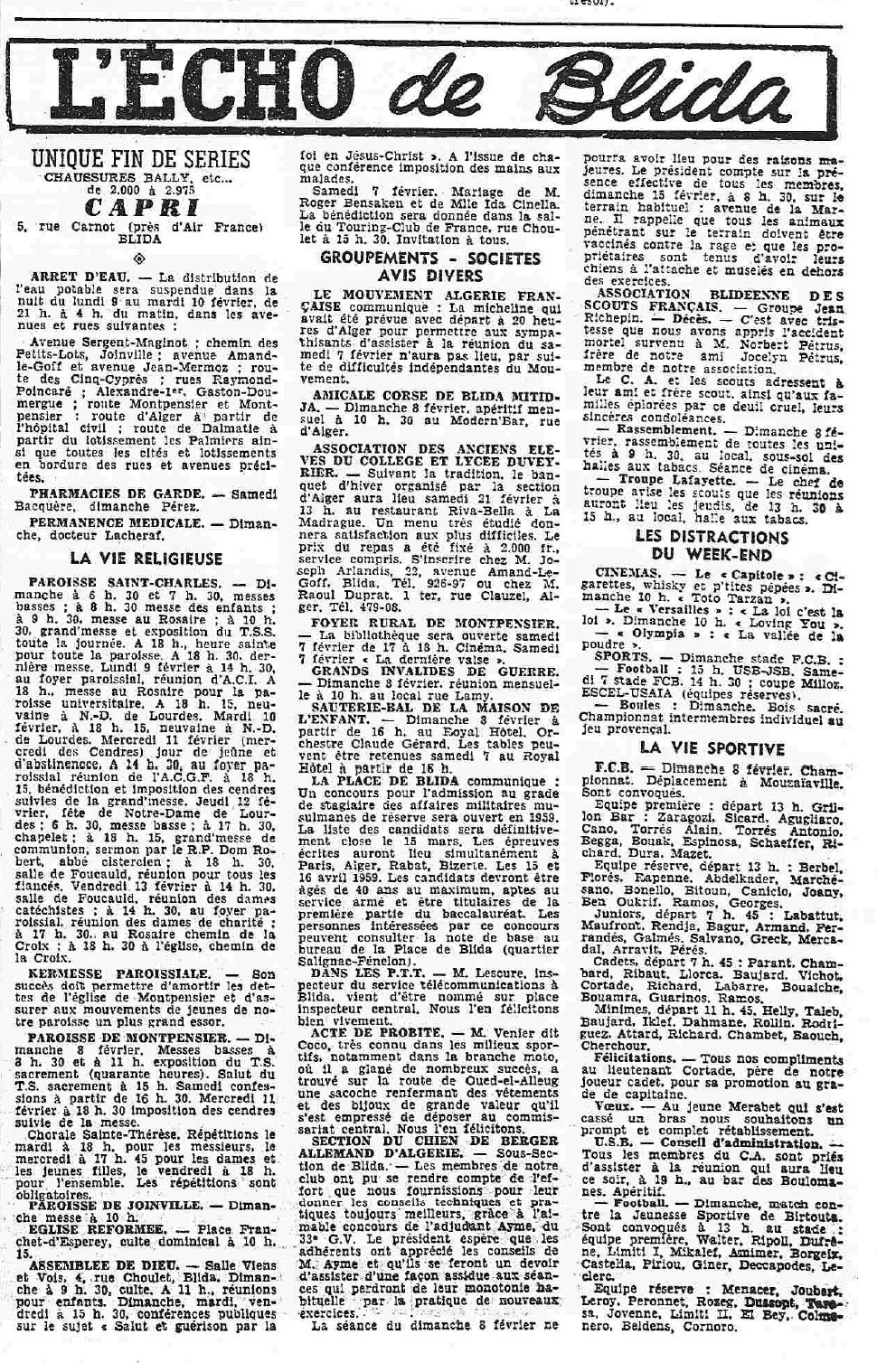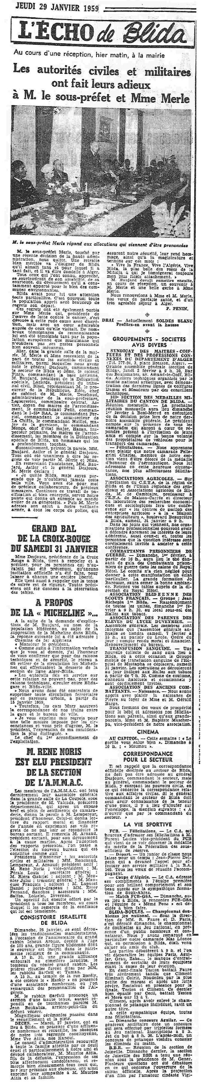 ANNEE 1959: Echos de BLIDA tirés de l'ECHO d'ALGER