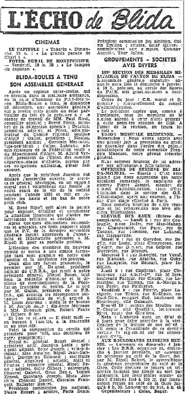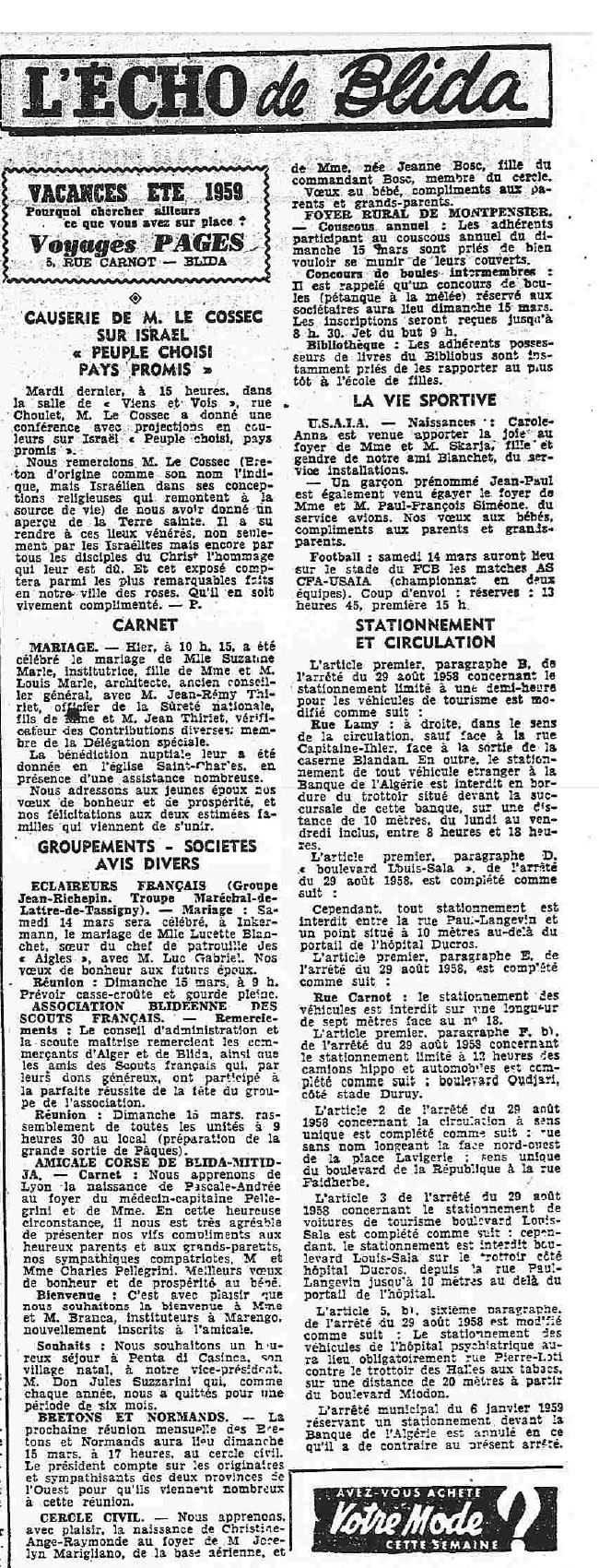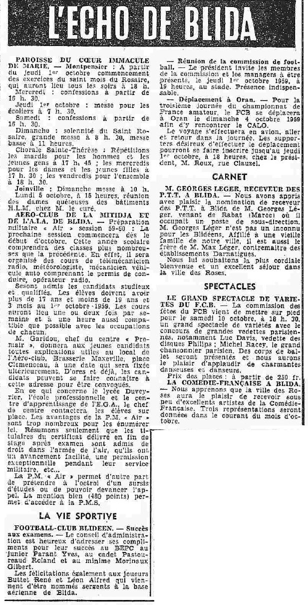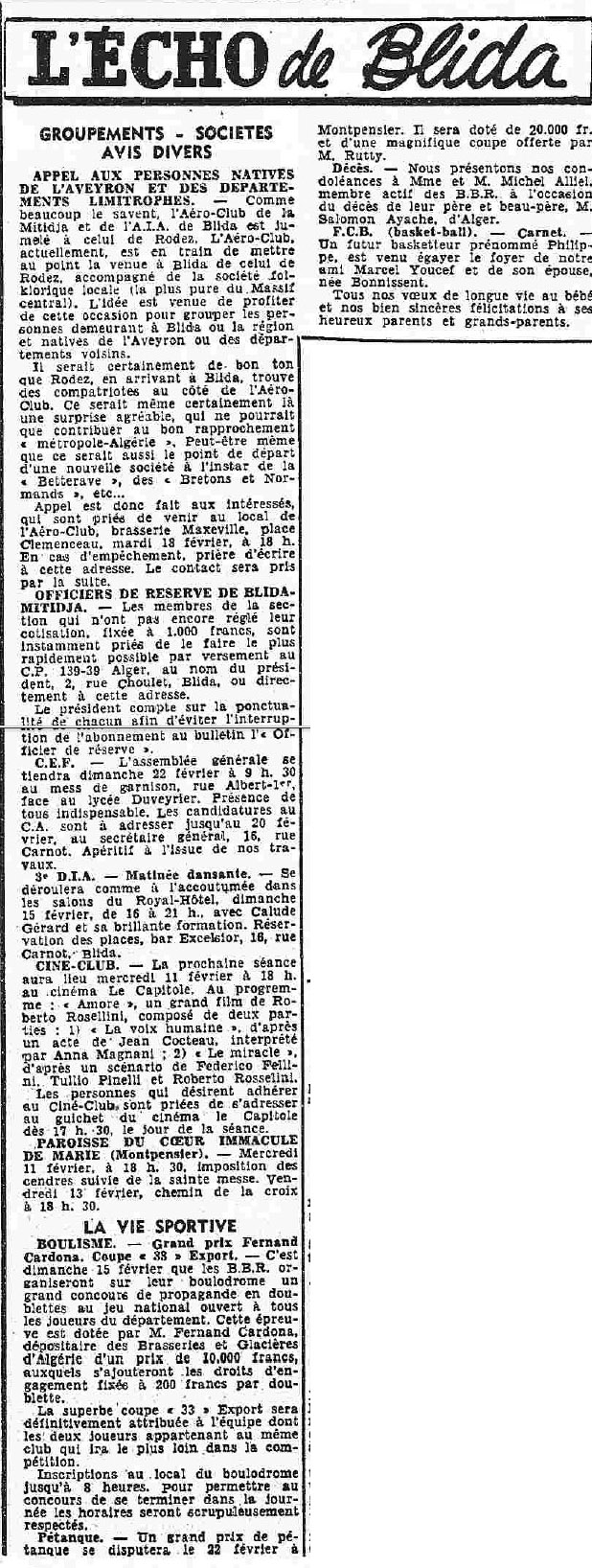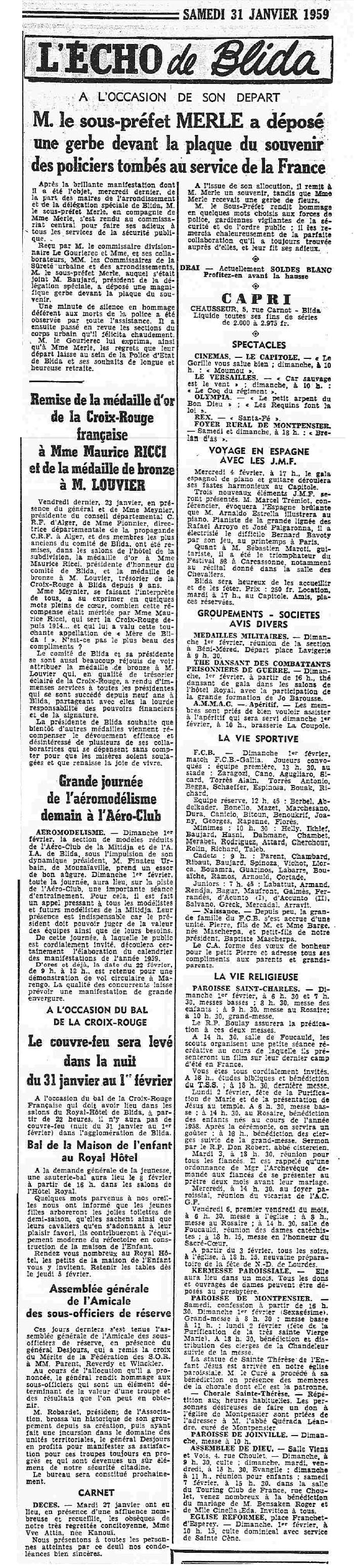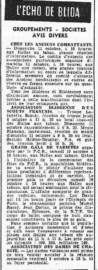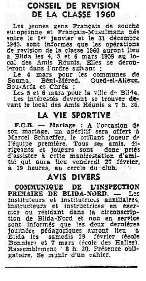 ANNEE 1959: Echos de BLIDA tirés de l'ECHO d'ALGER