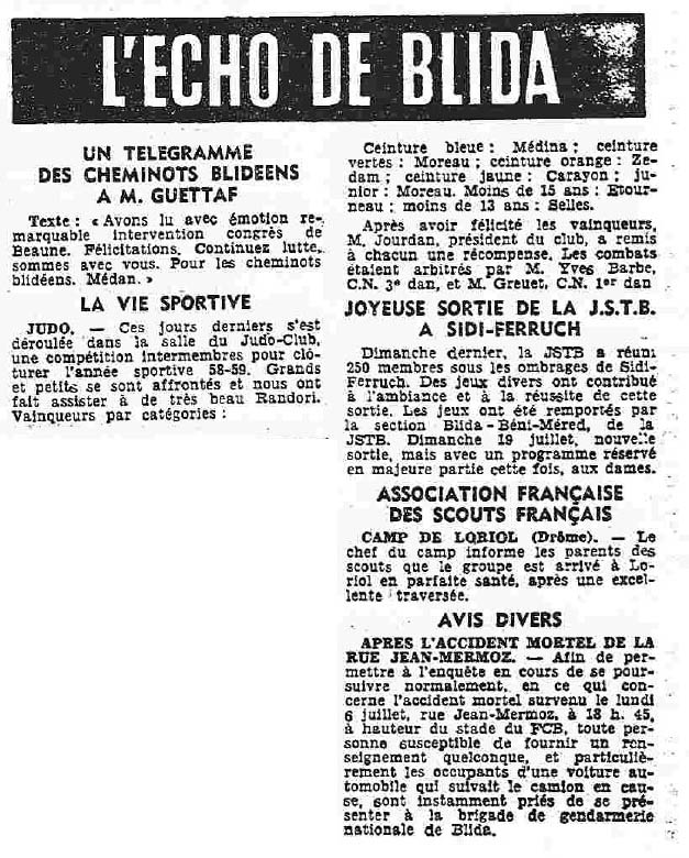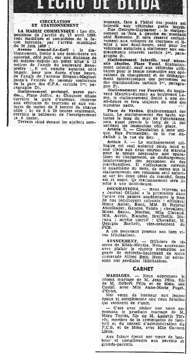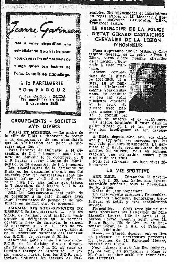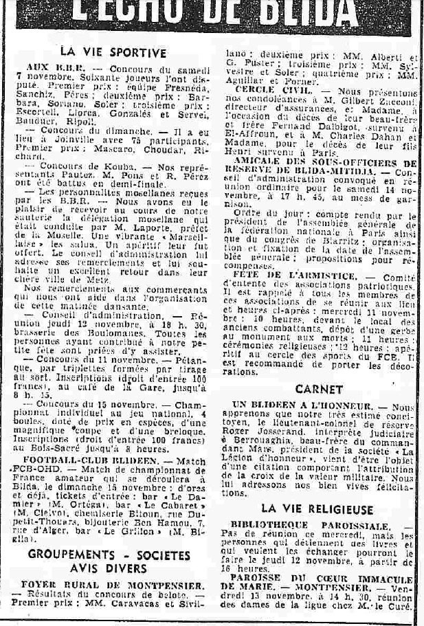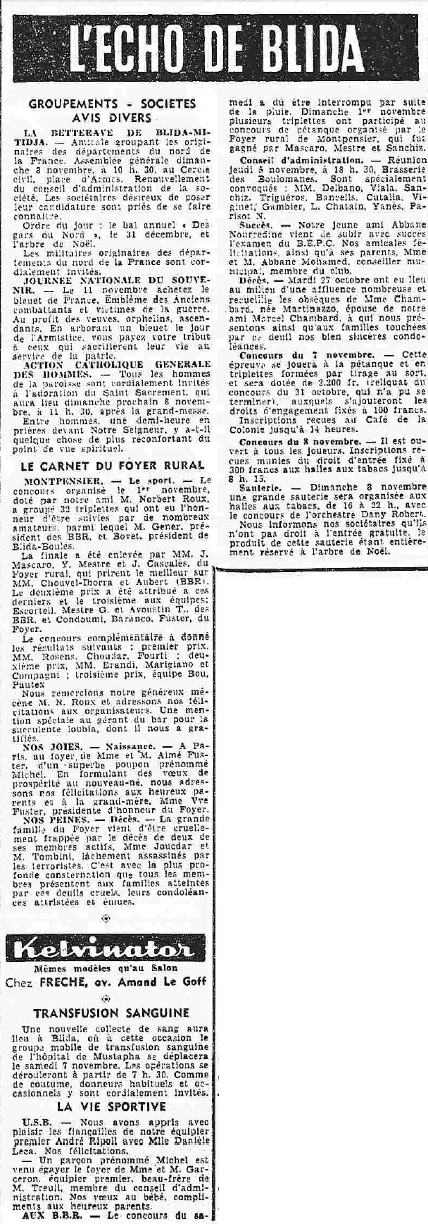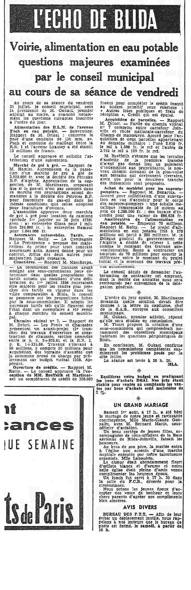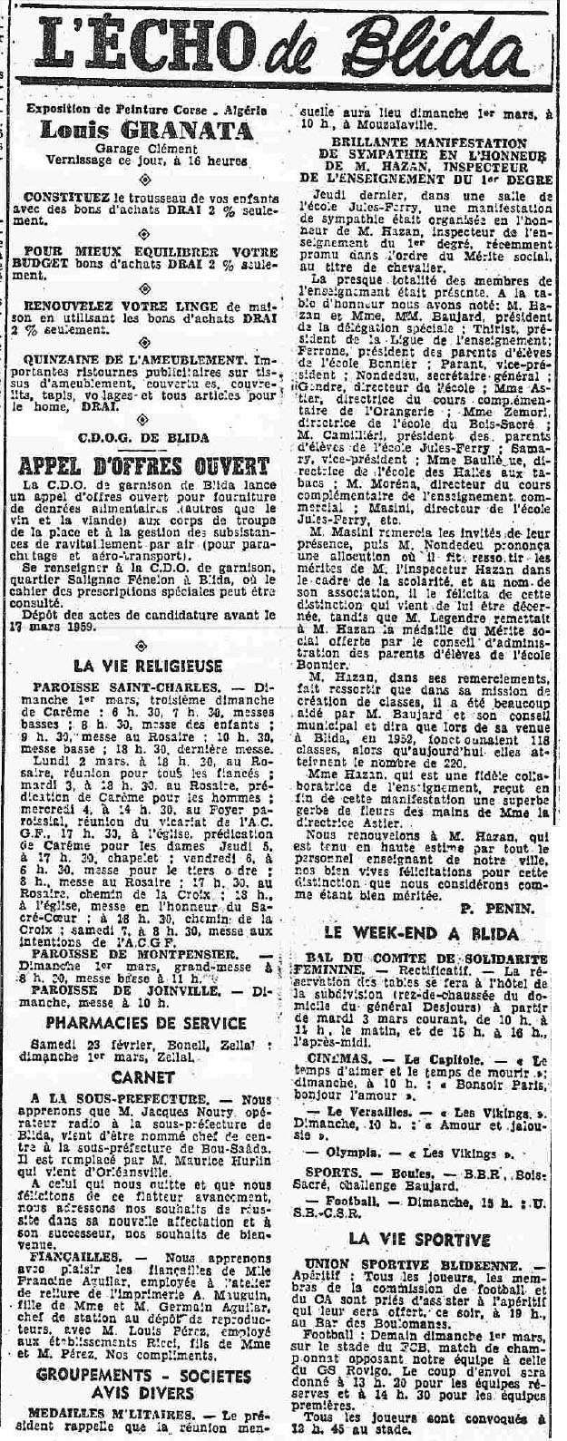 ANNEE 1959: Echos de BLIDA tirés de l'ECHO d'ALGER