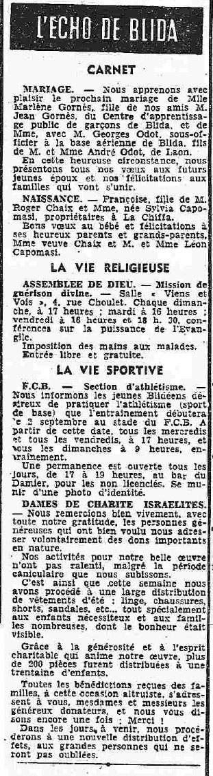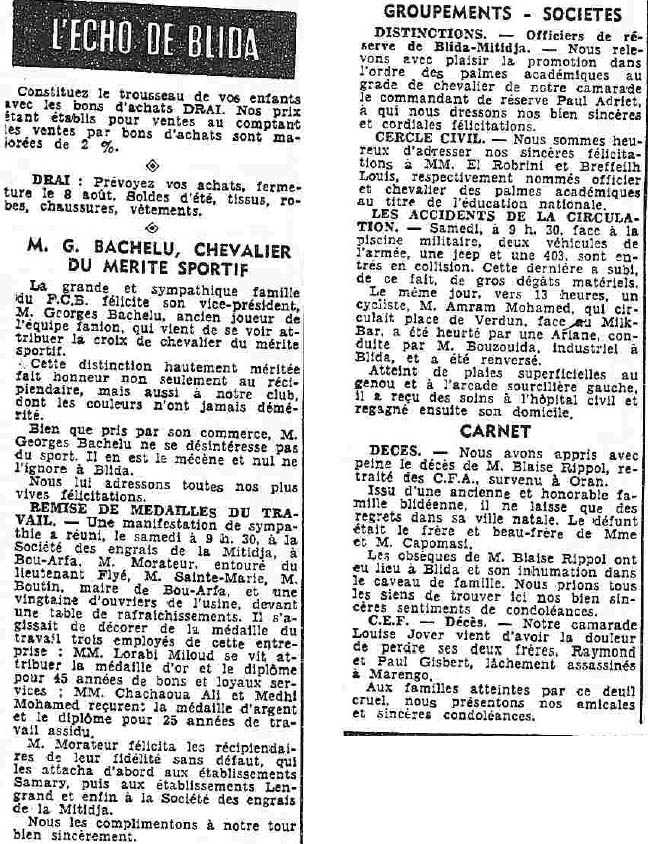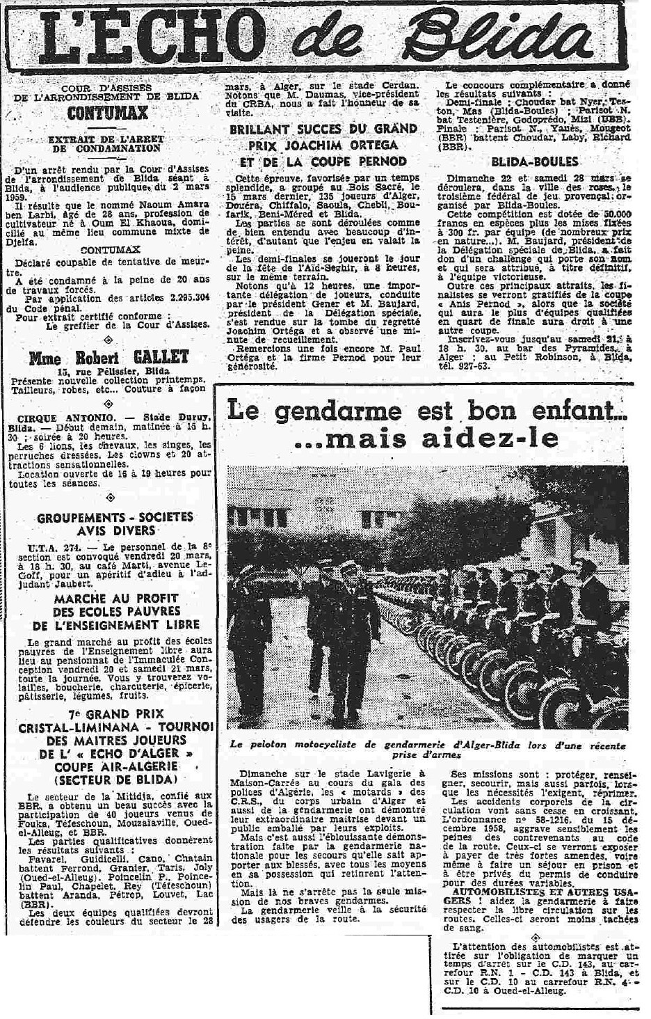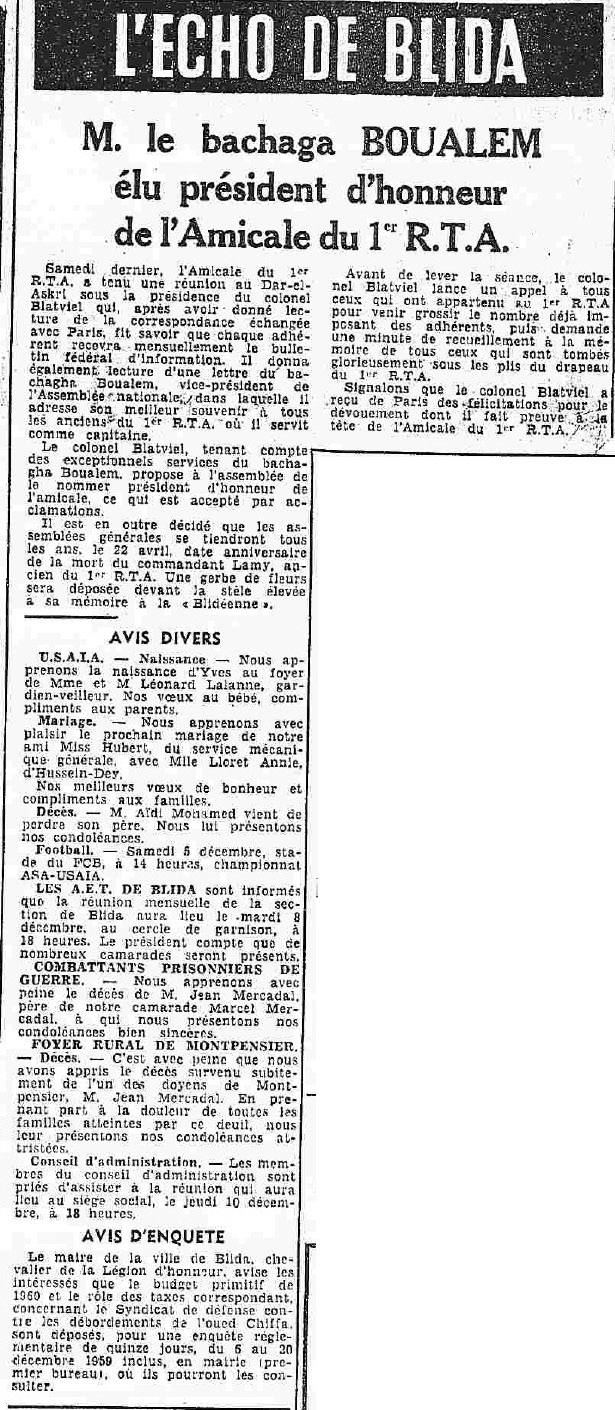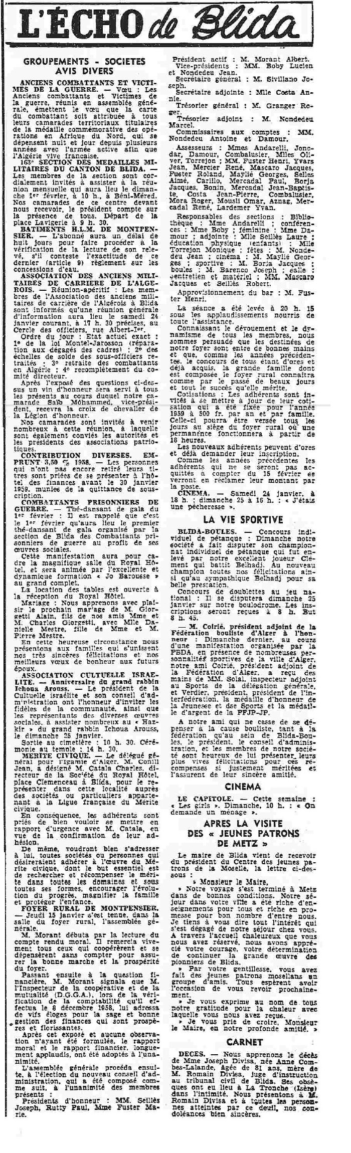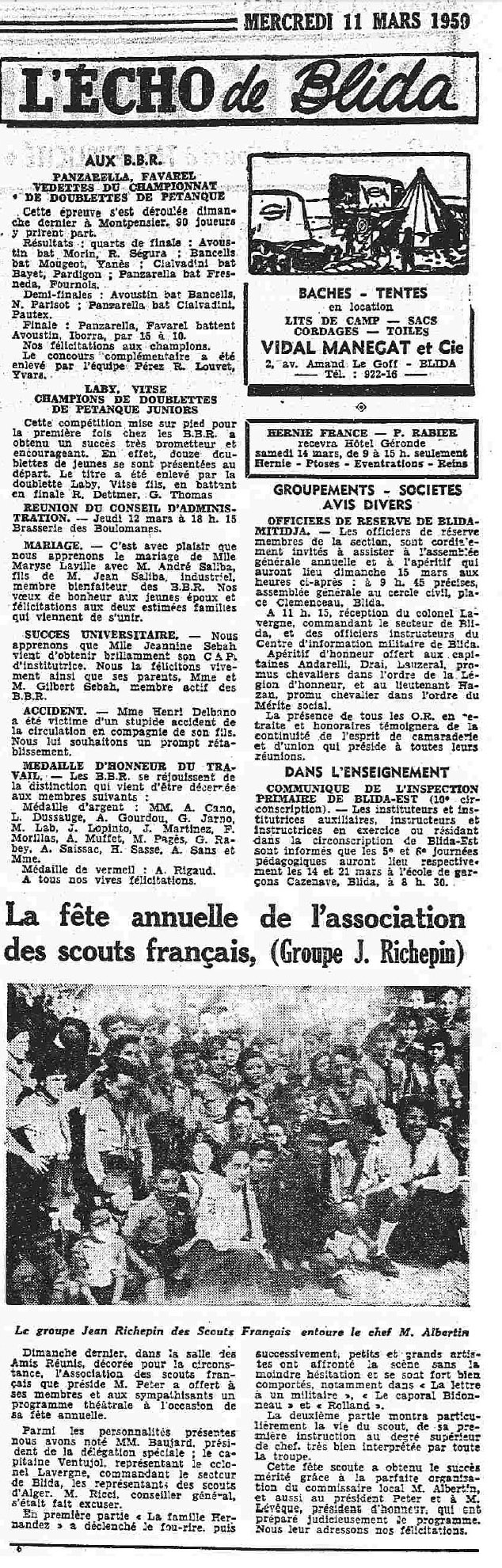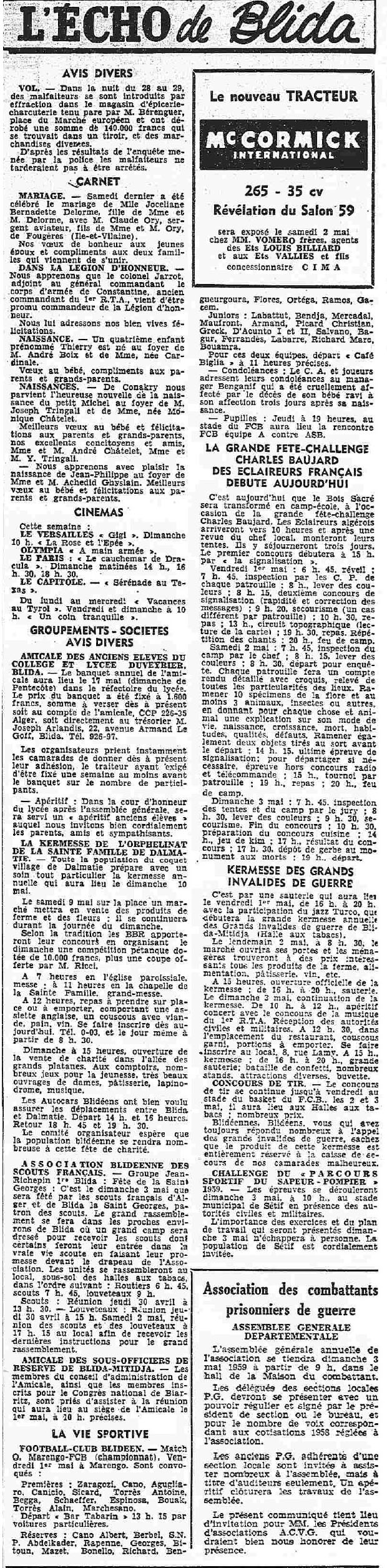 ANNEE 1959: Echos de BLIDA tirés de l'ECHO d'ALGER