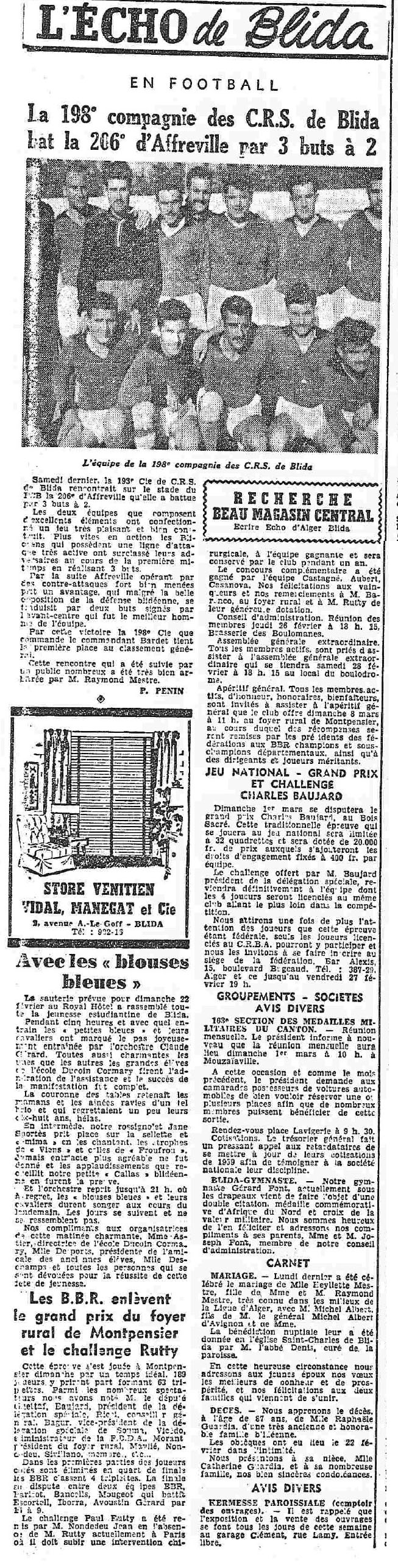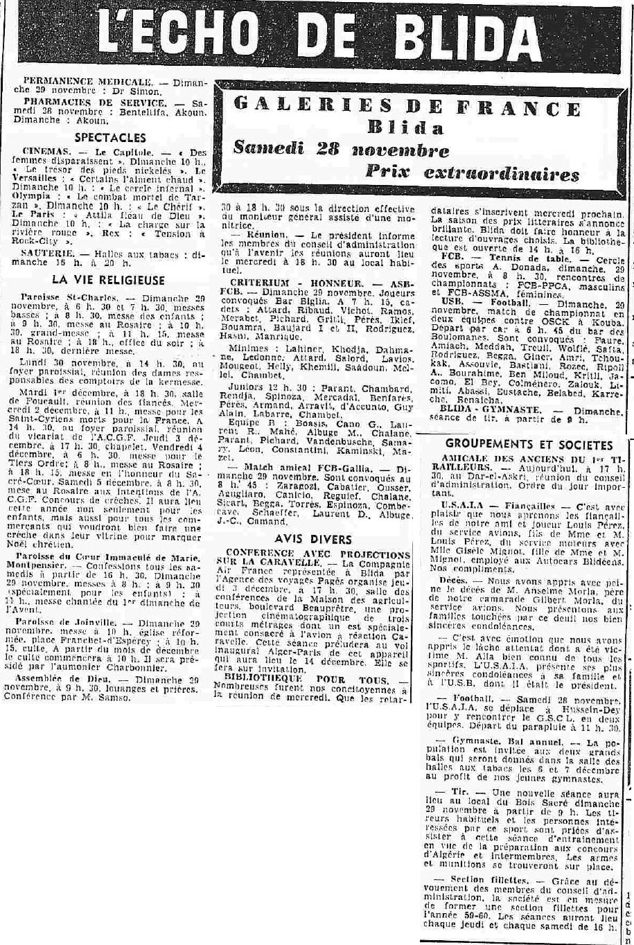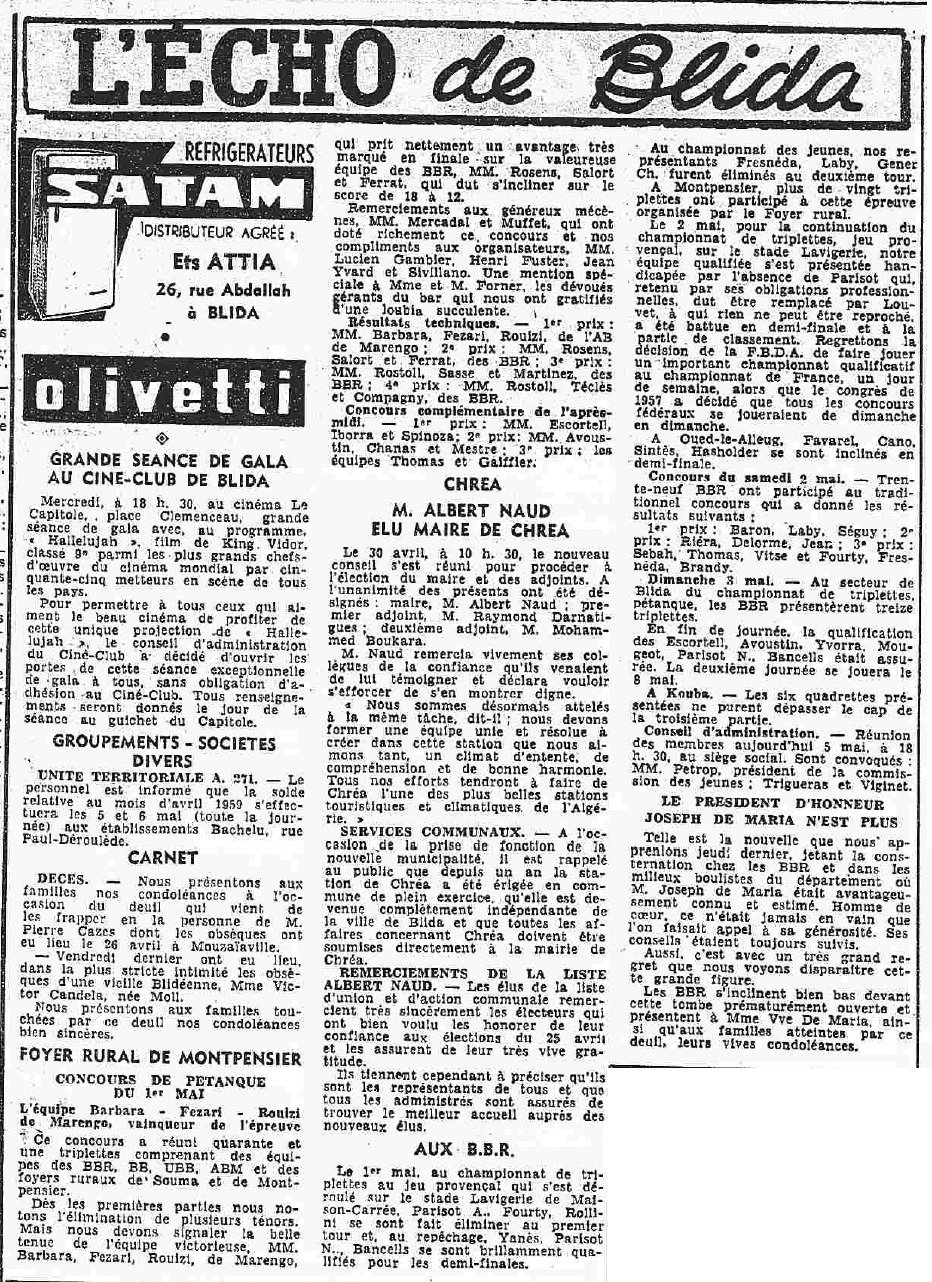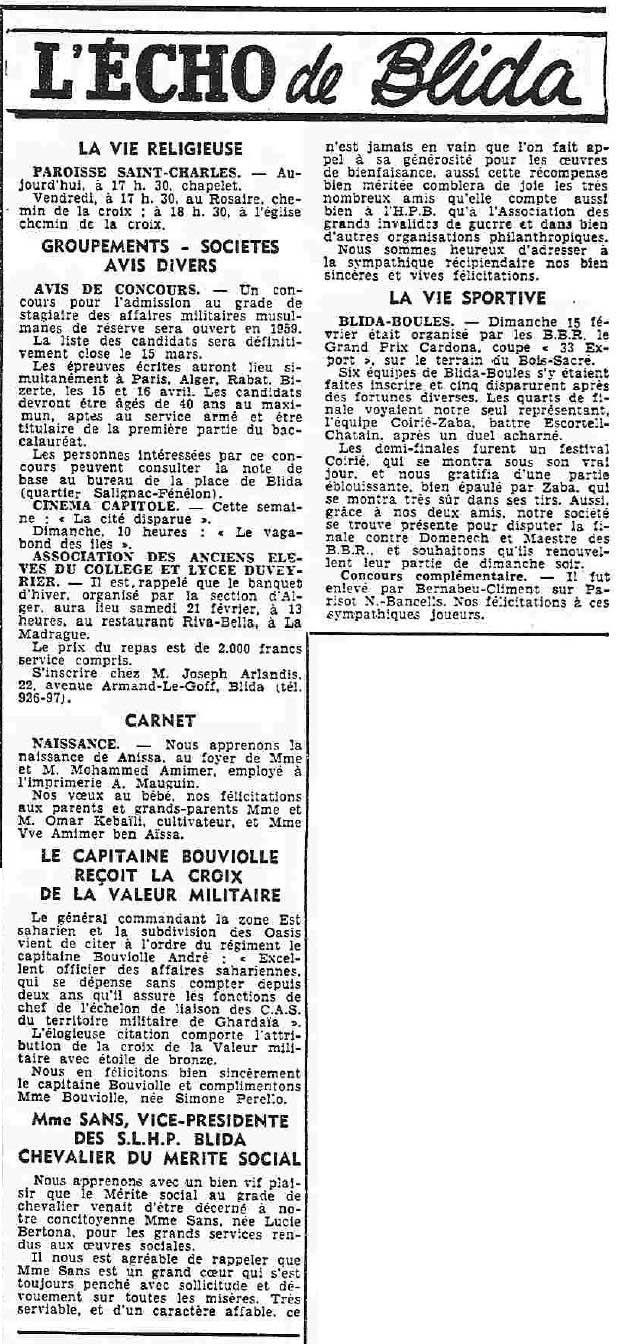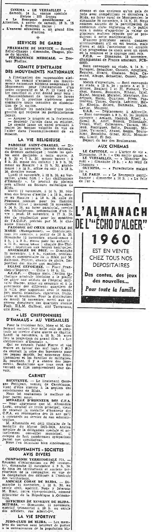 ANNEE 1959: Echos de BLIDA tirés de l'ECHO d'ALGER