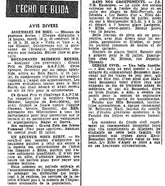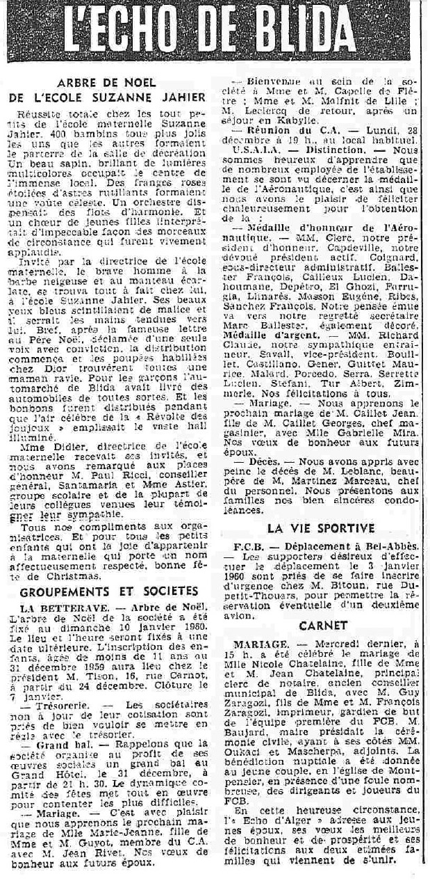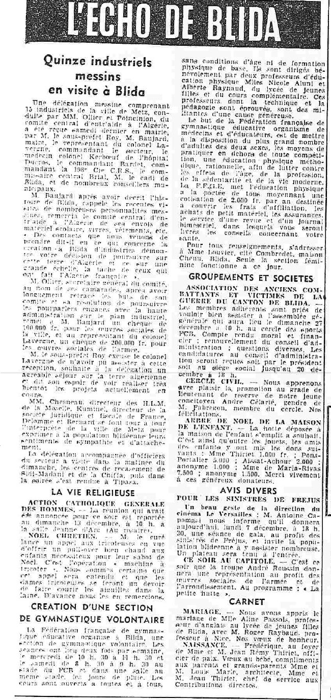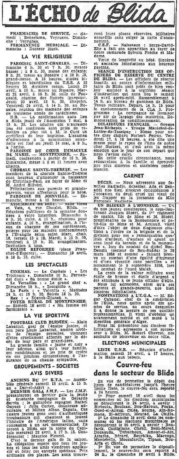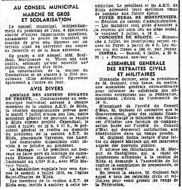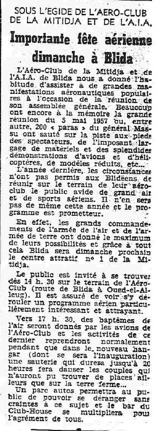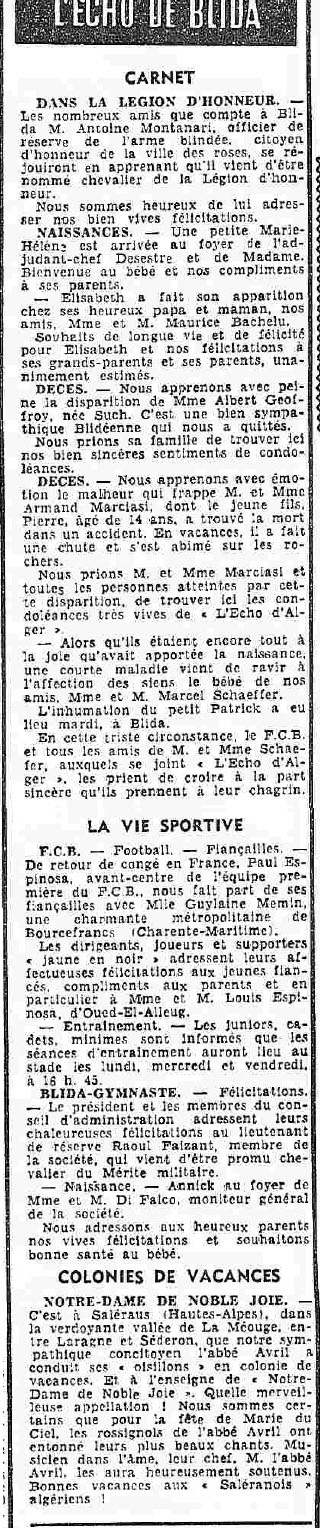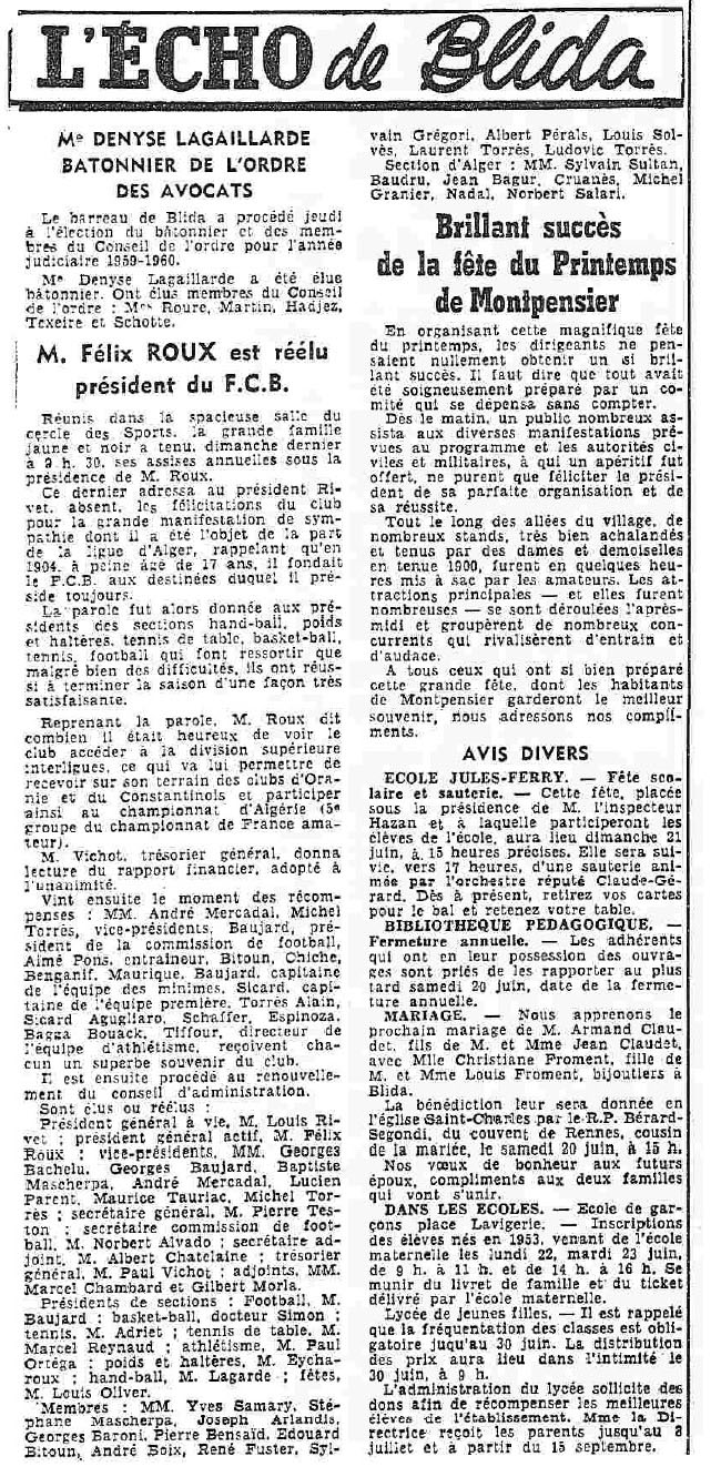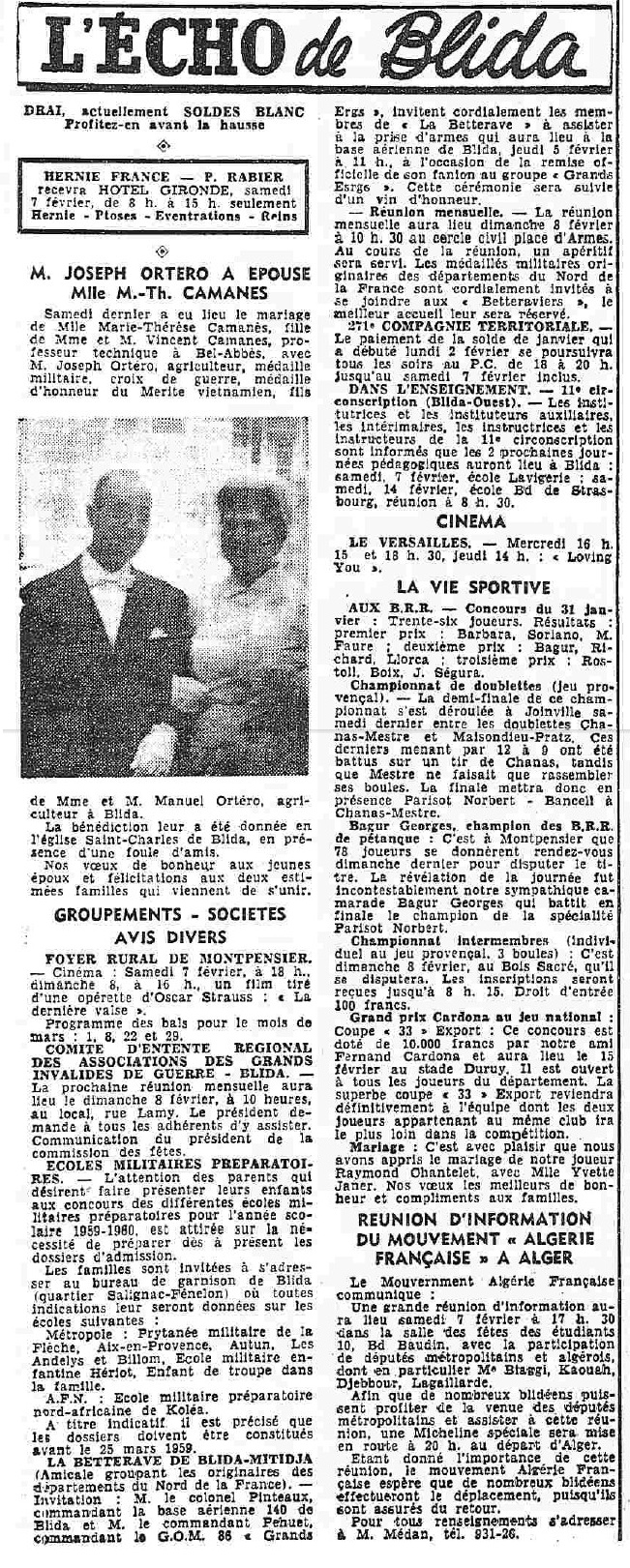 ANNEE 1959: Echos de BLIDA tirés de l'ECHO d'ALGER