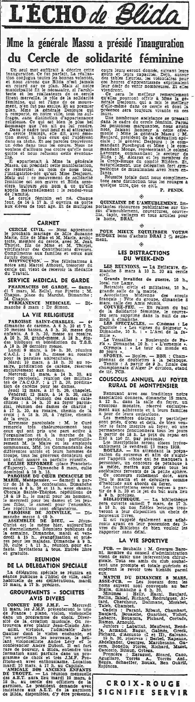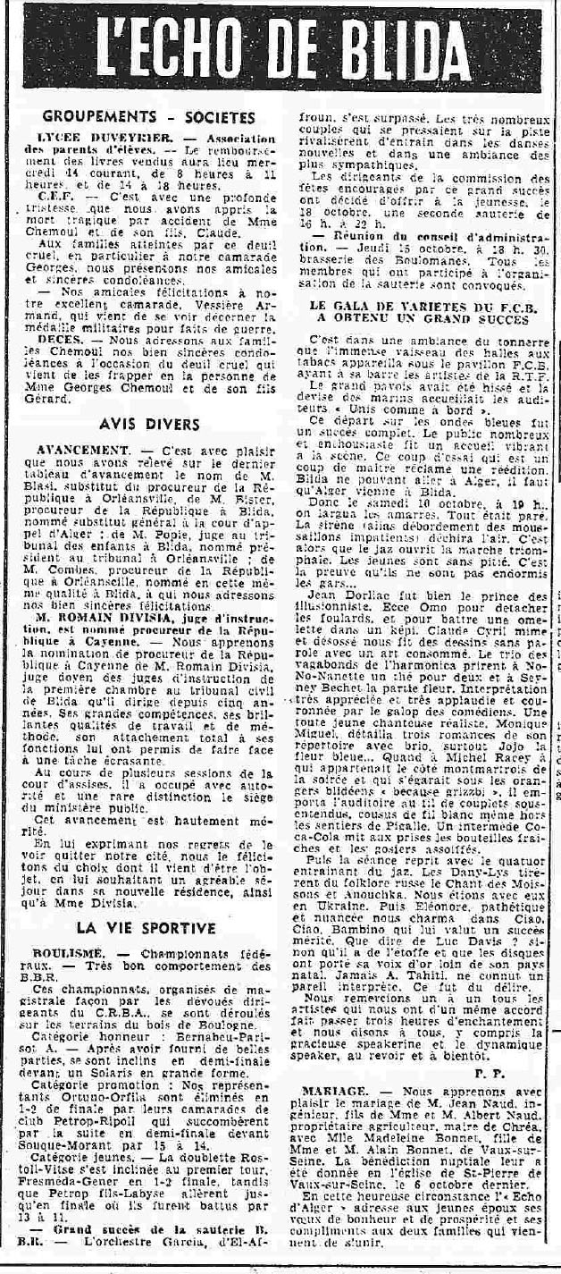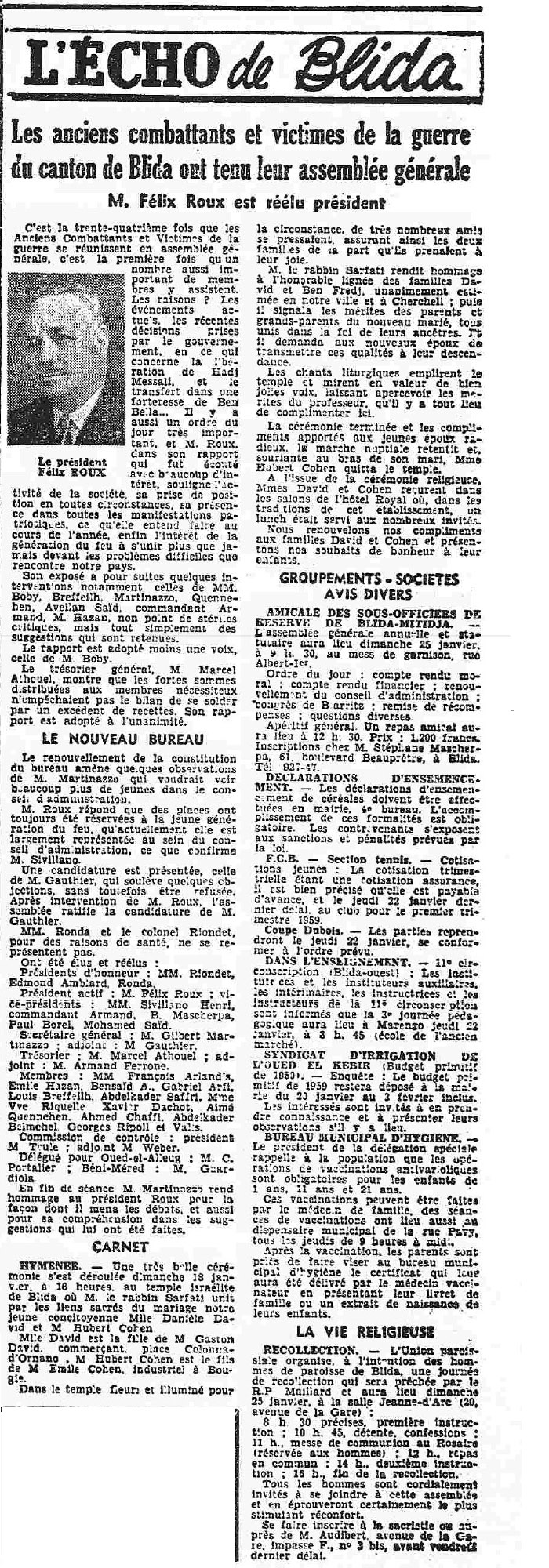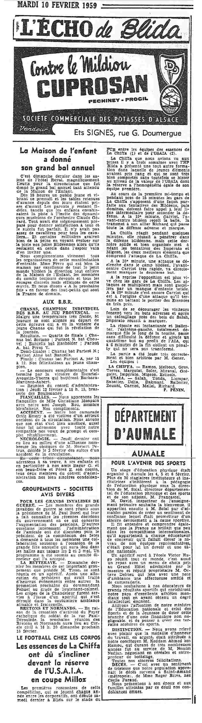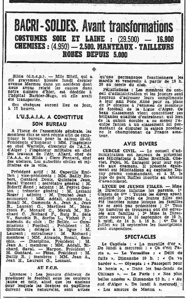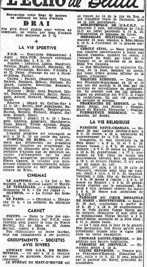 ANNEE 1959: Echos de BLIDA tirés de l'ECHO d'ALGER