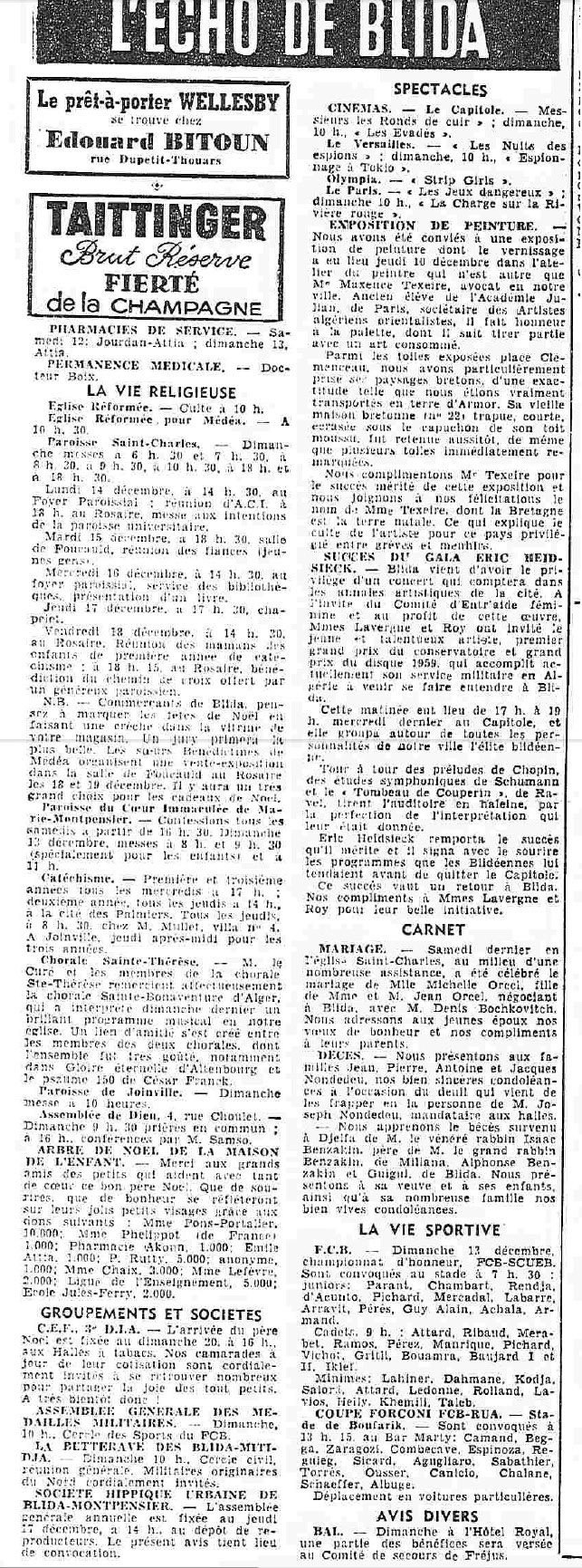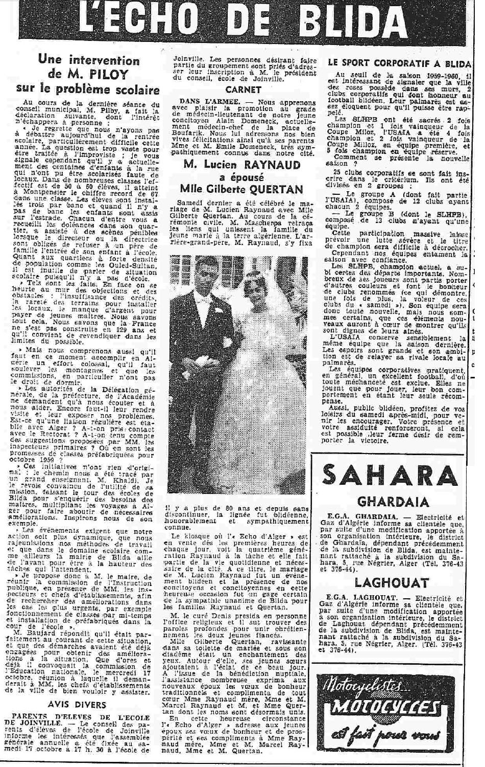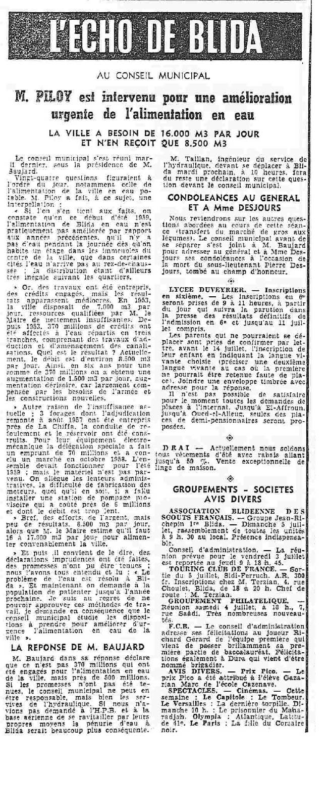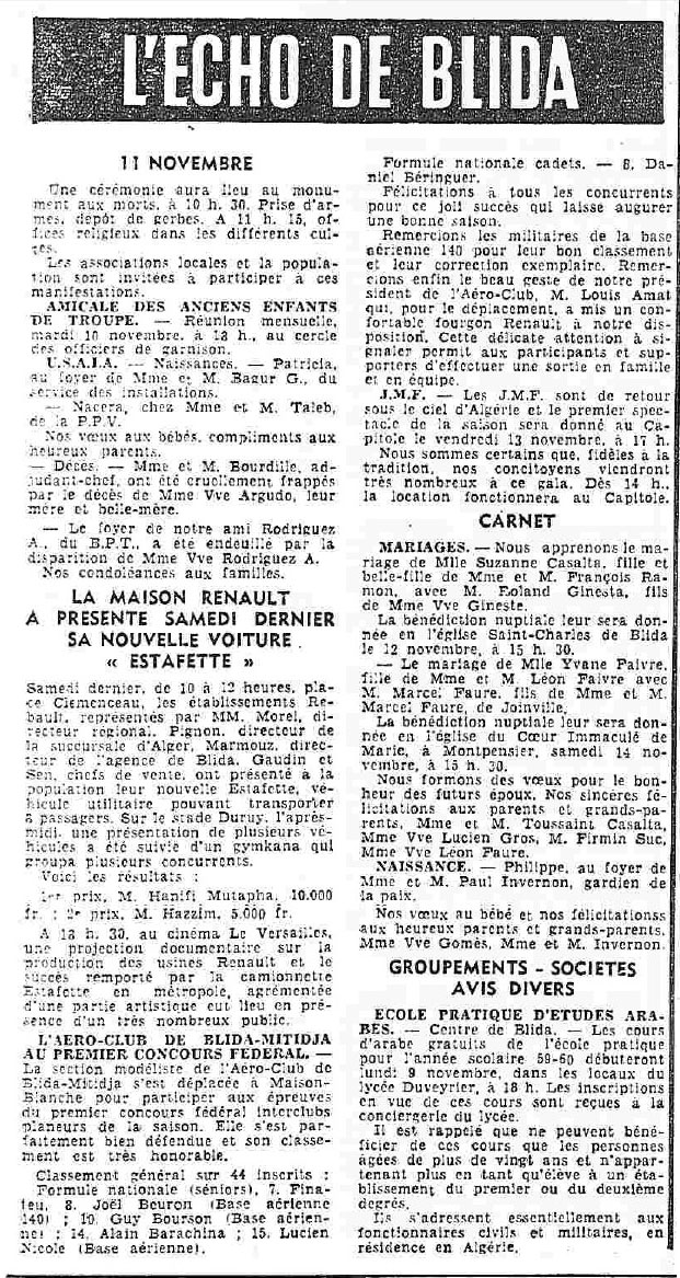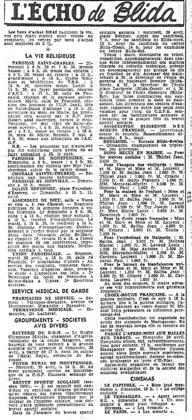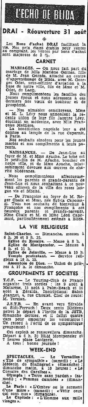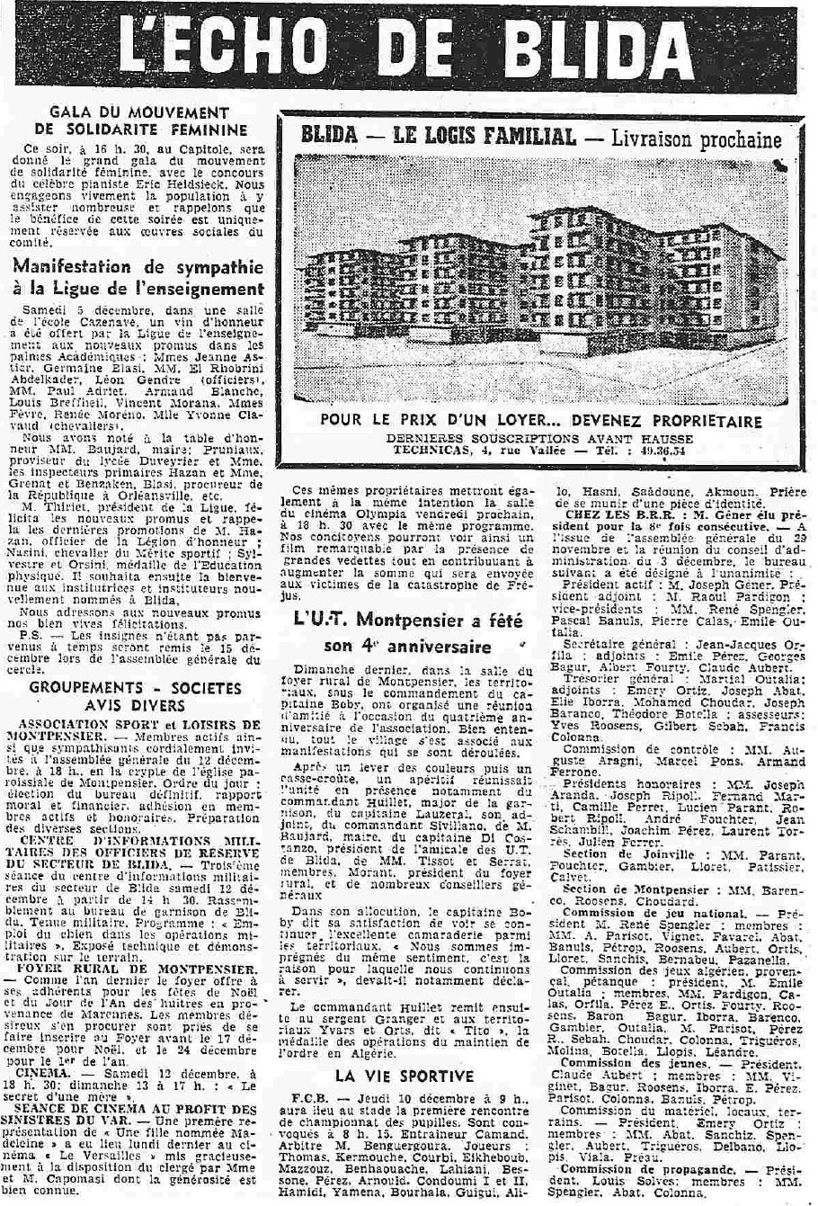 ANNEE 1959: Echos de BLIDA tirés de l'ECHO d'ALGER