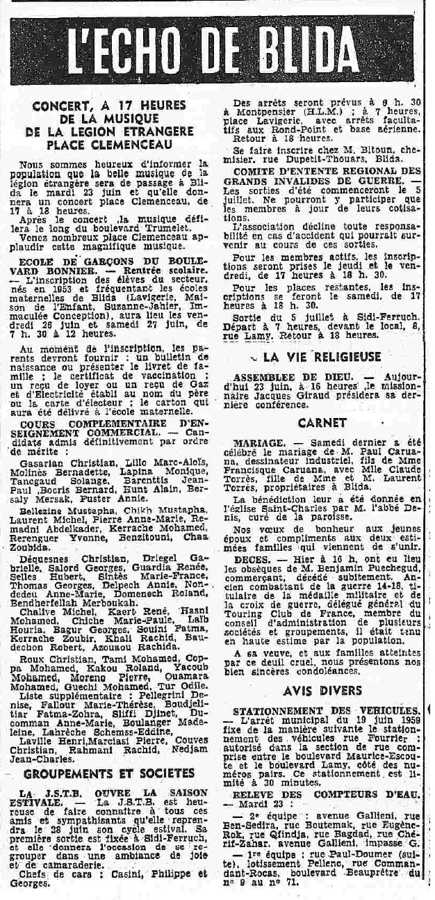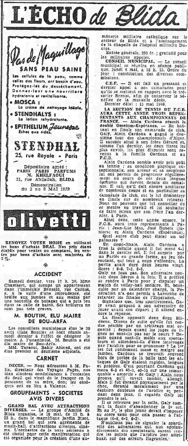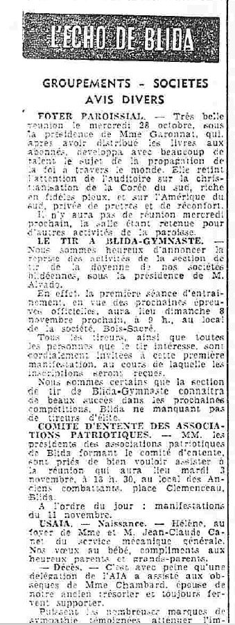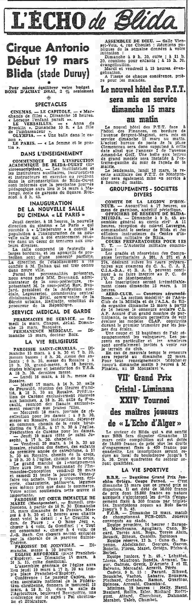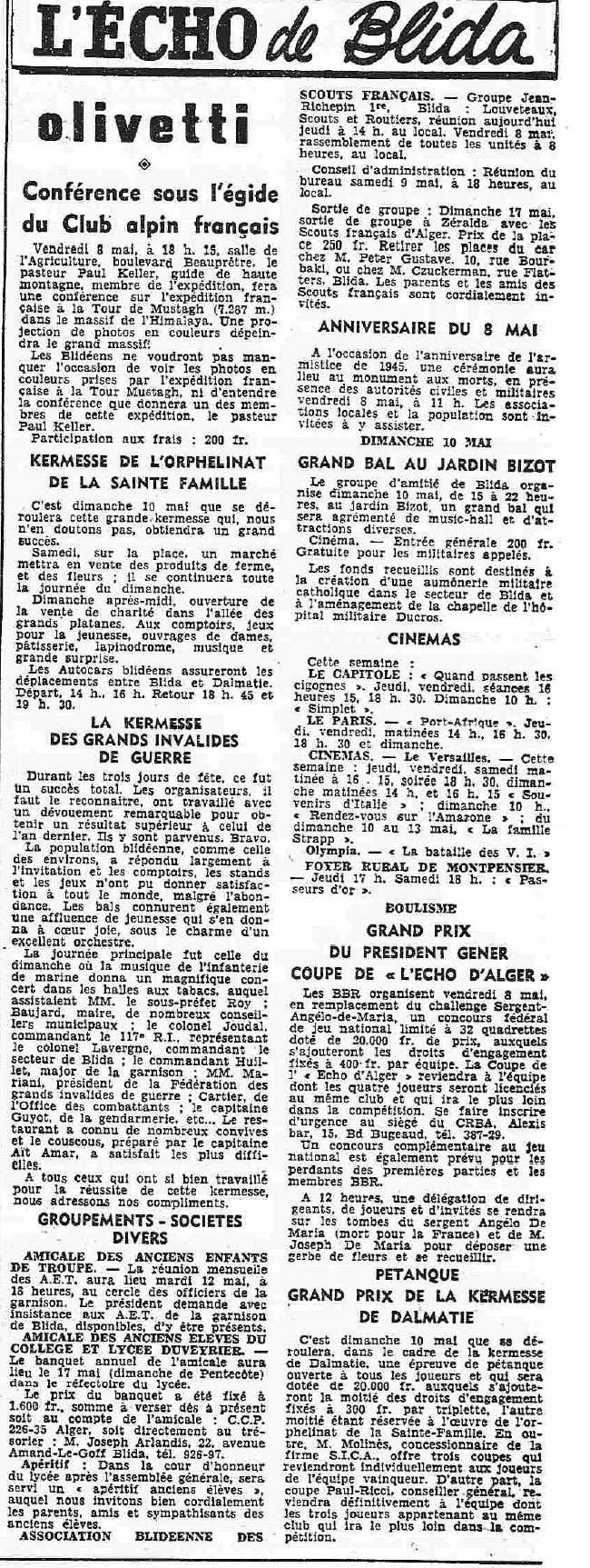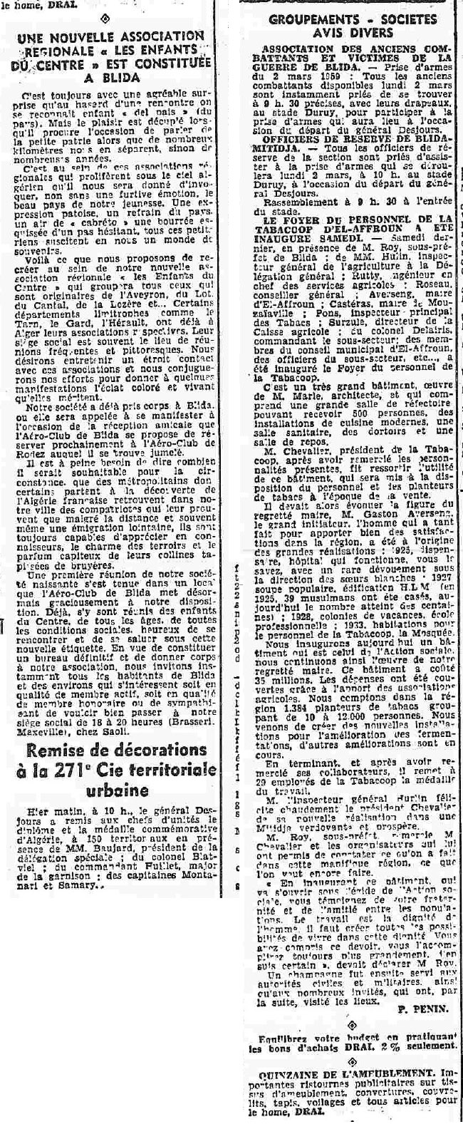ANNEE 1959: Echos de BLIDA tirés de l'ECHO d'ALGER