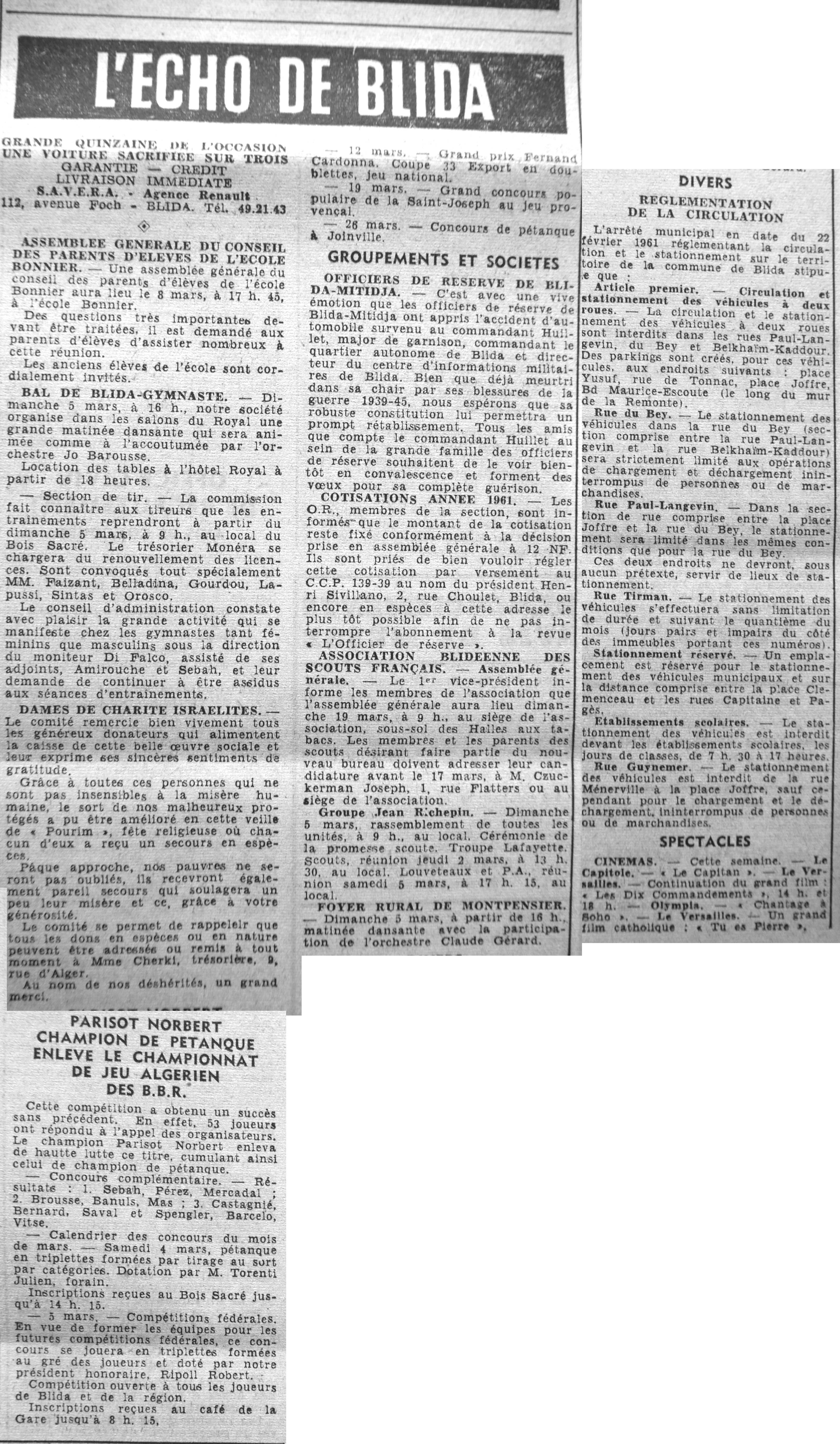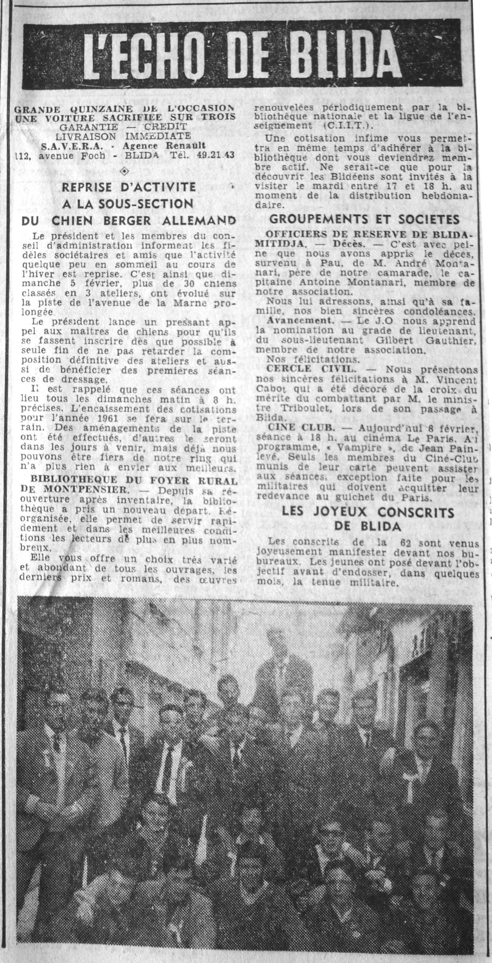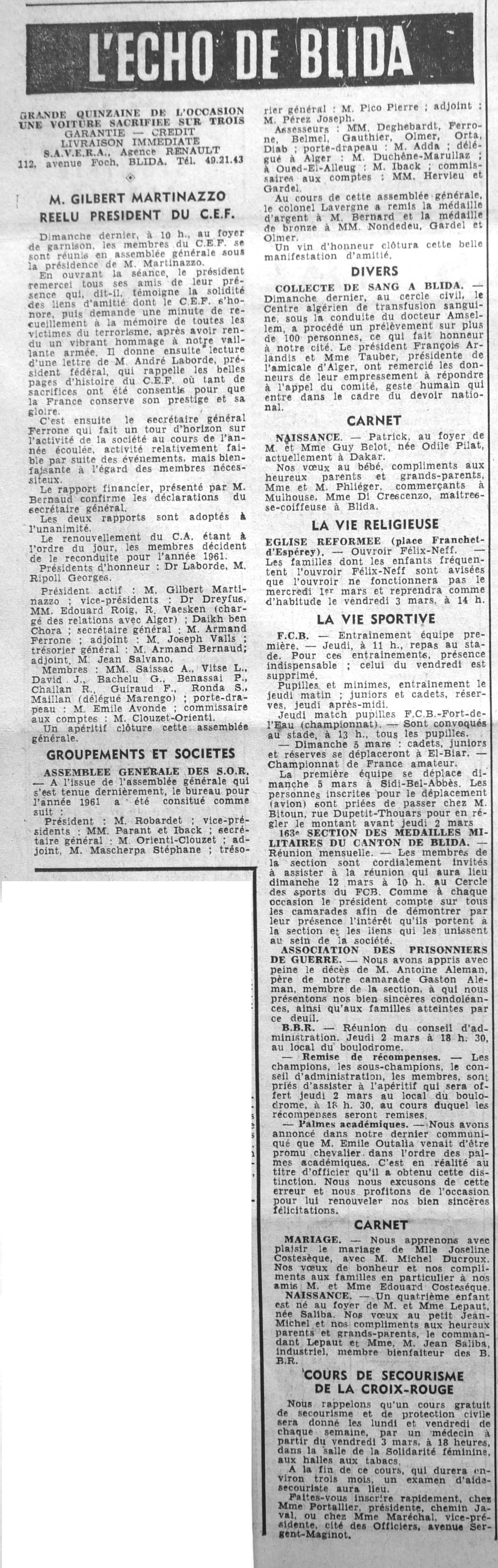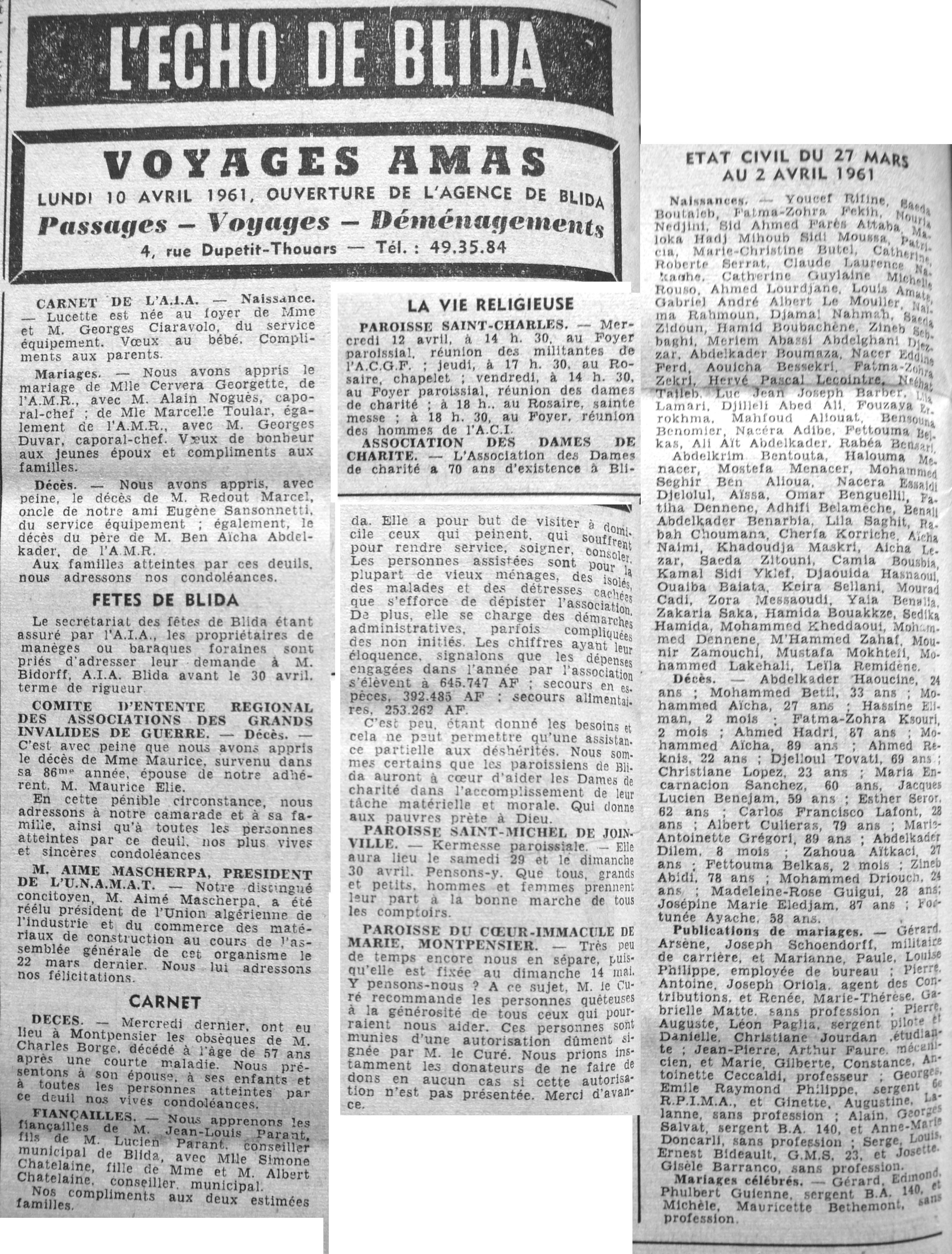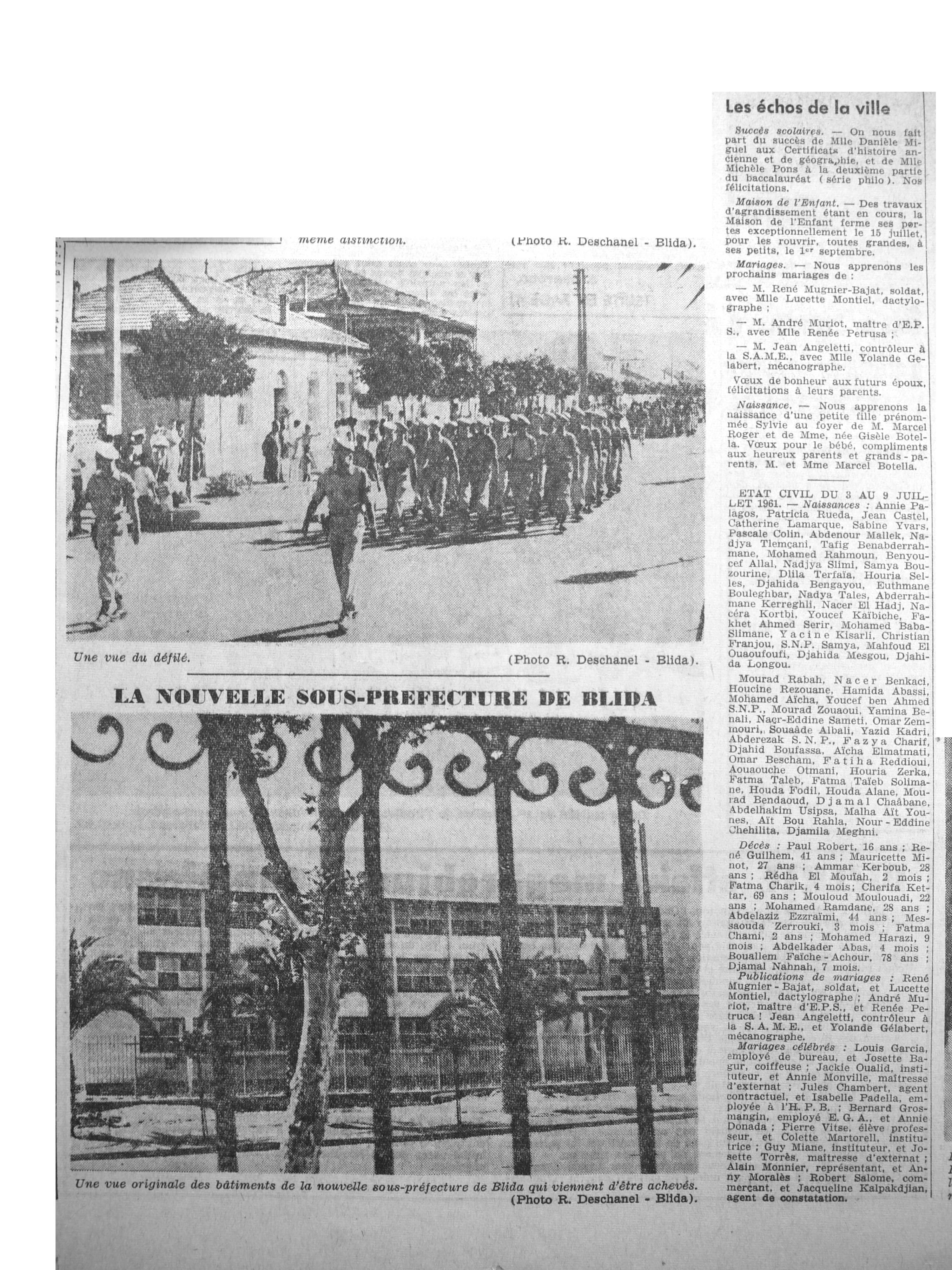 ANNEE 1961 Echos de BLIDA tirés de l'ECHO d'ALGER (janvier-avril) et de la Dépêche Quotidienne (mai-décembre) |