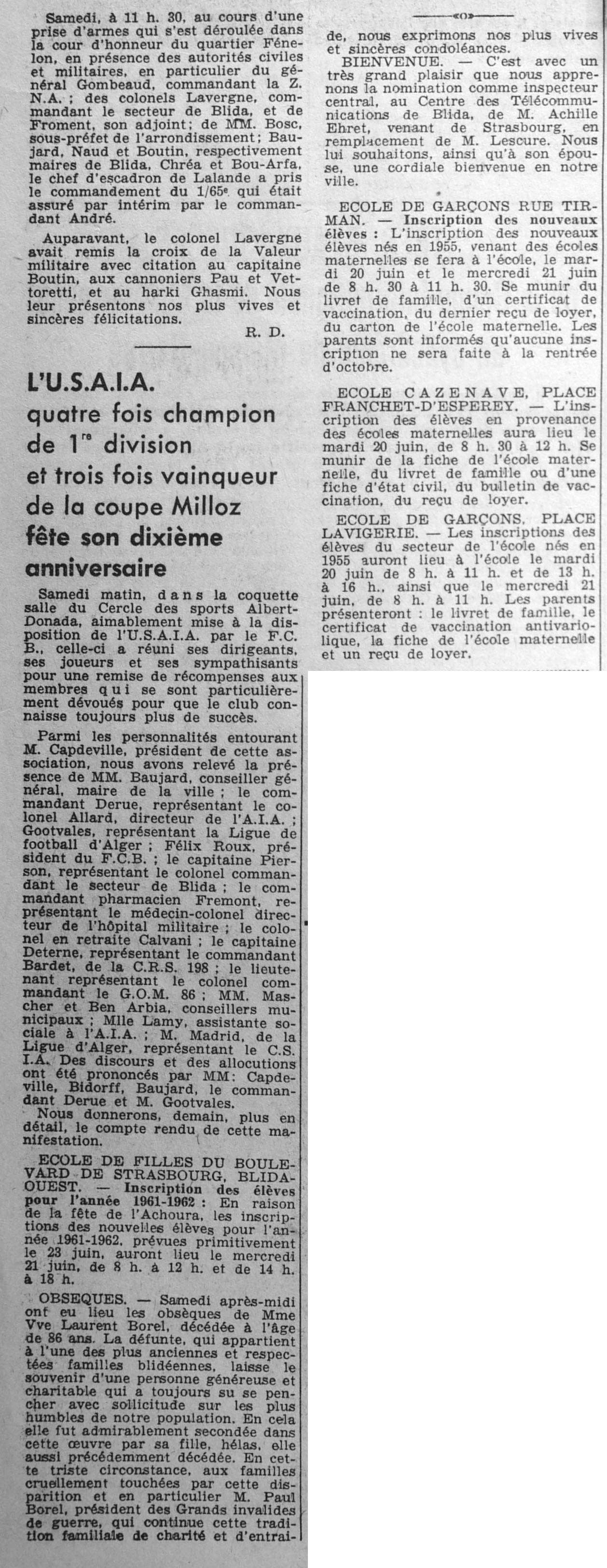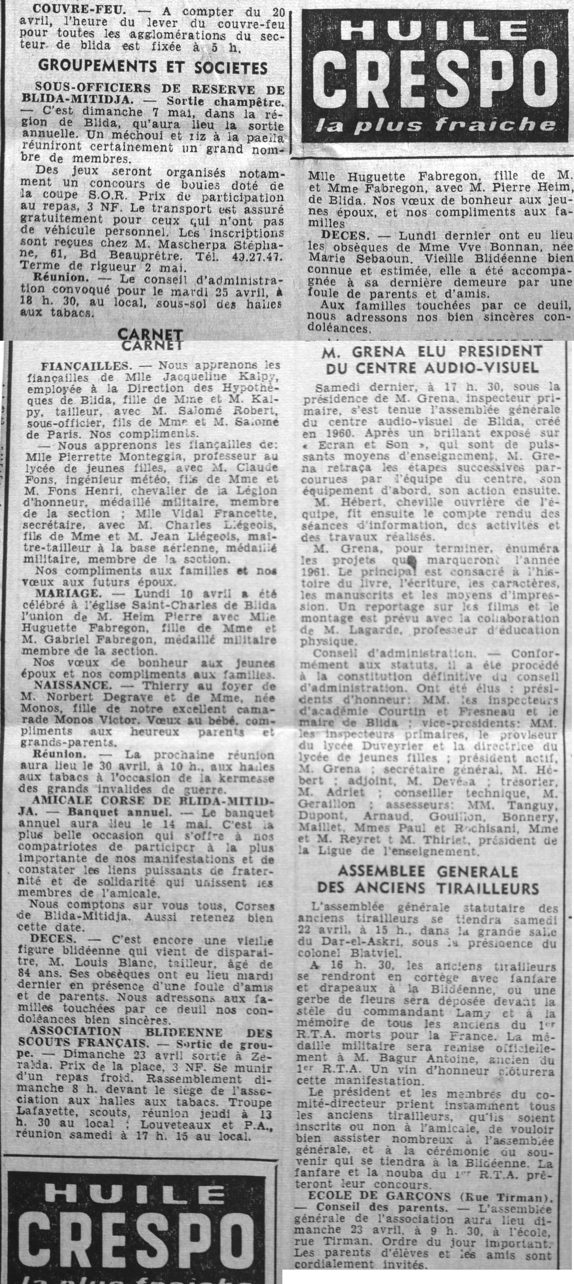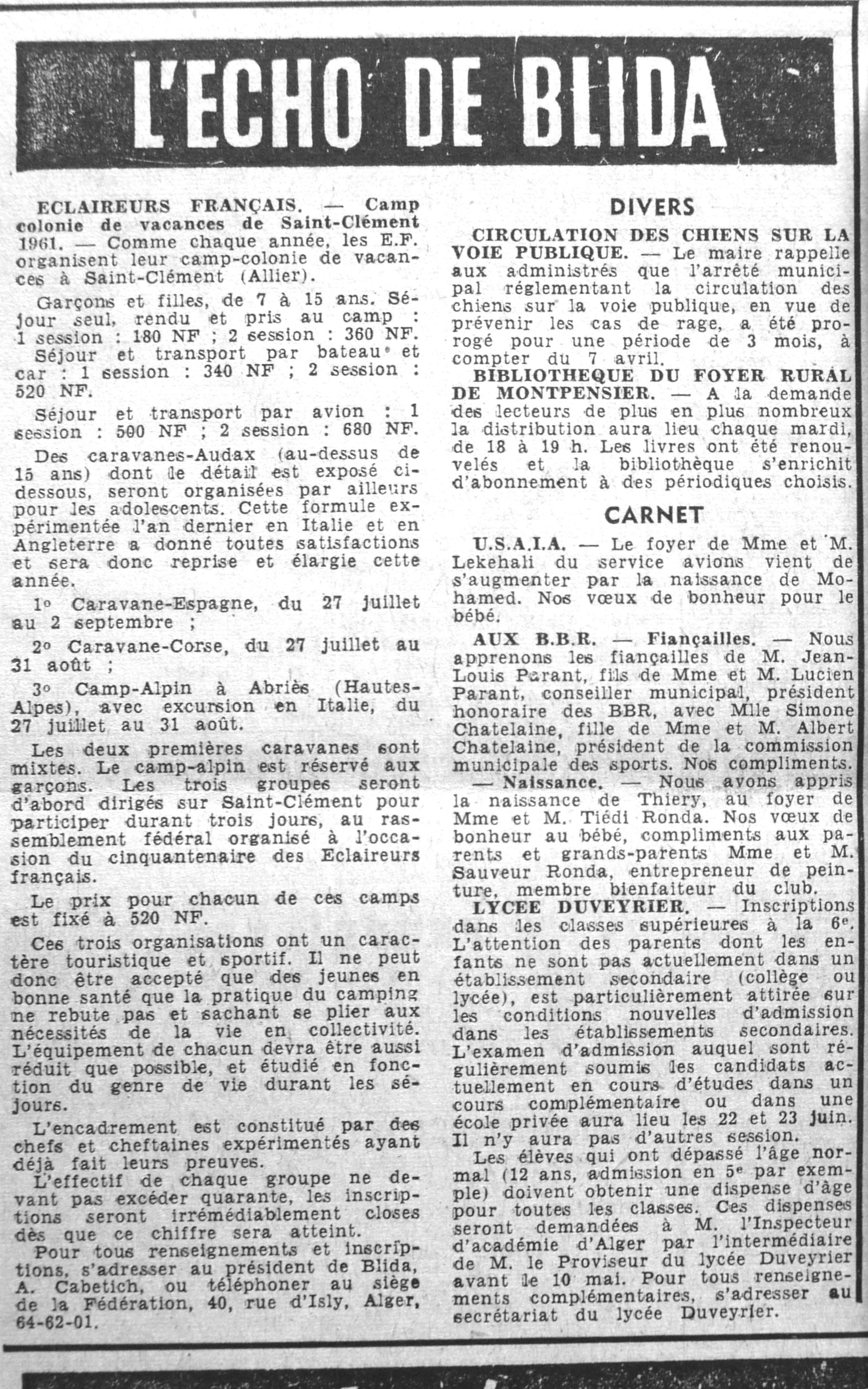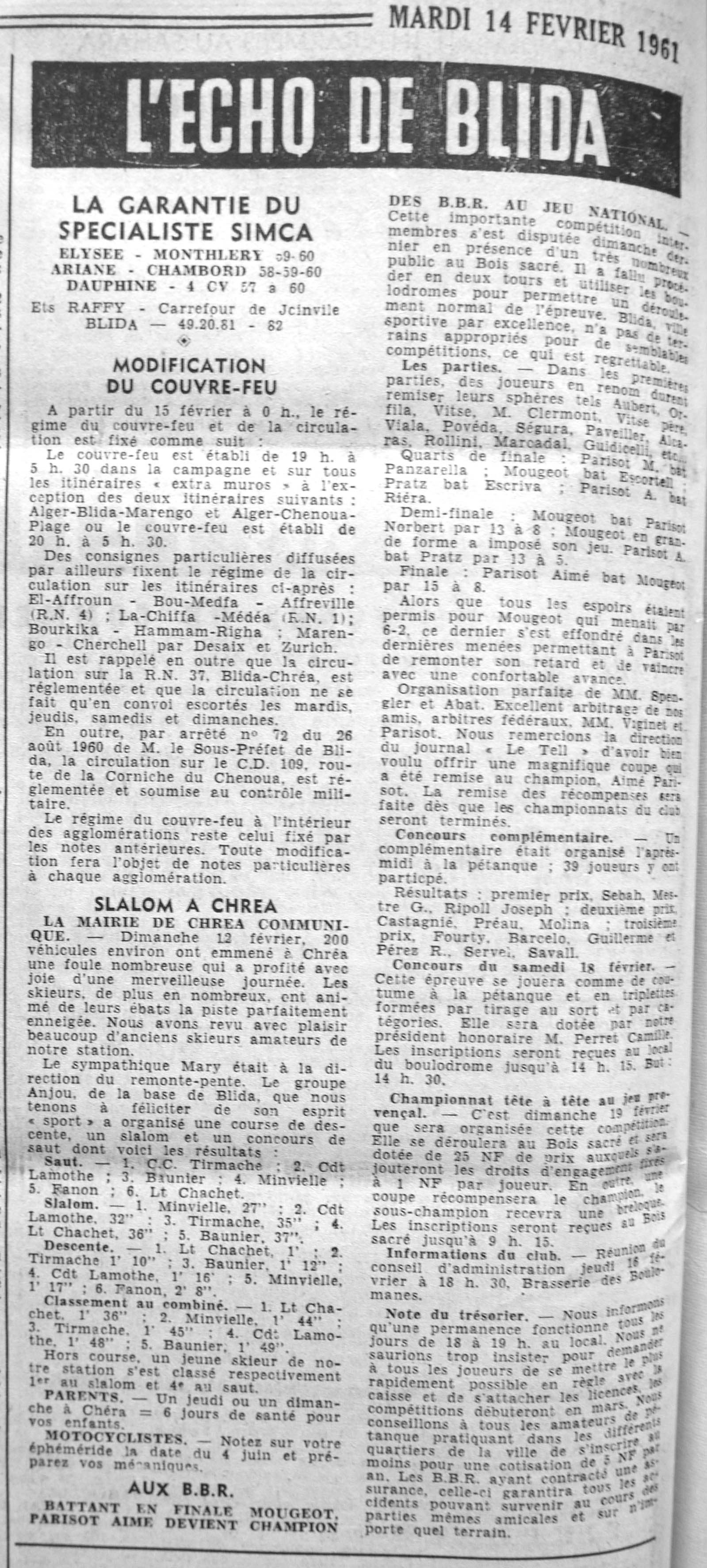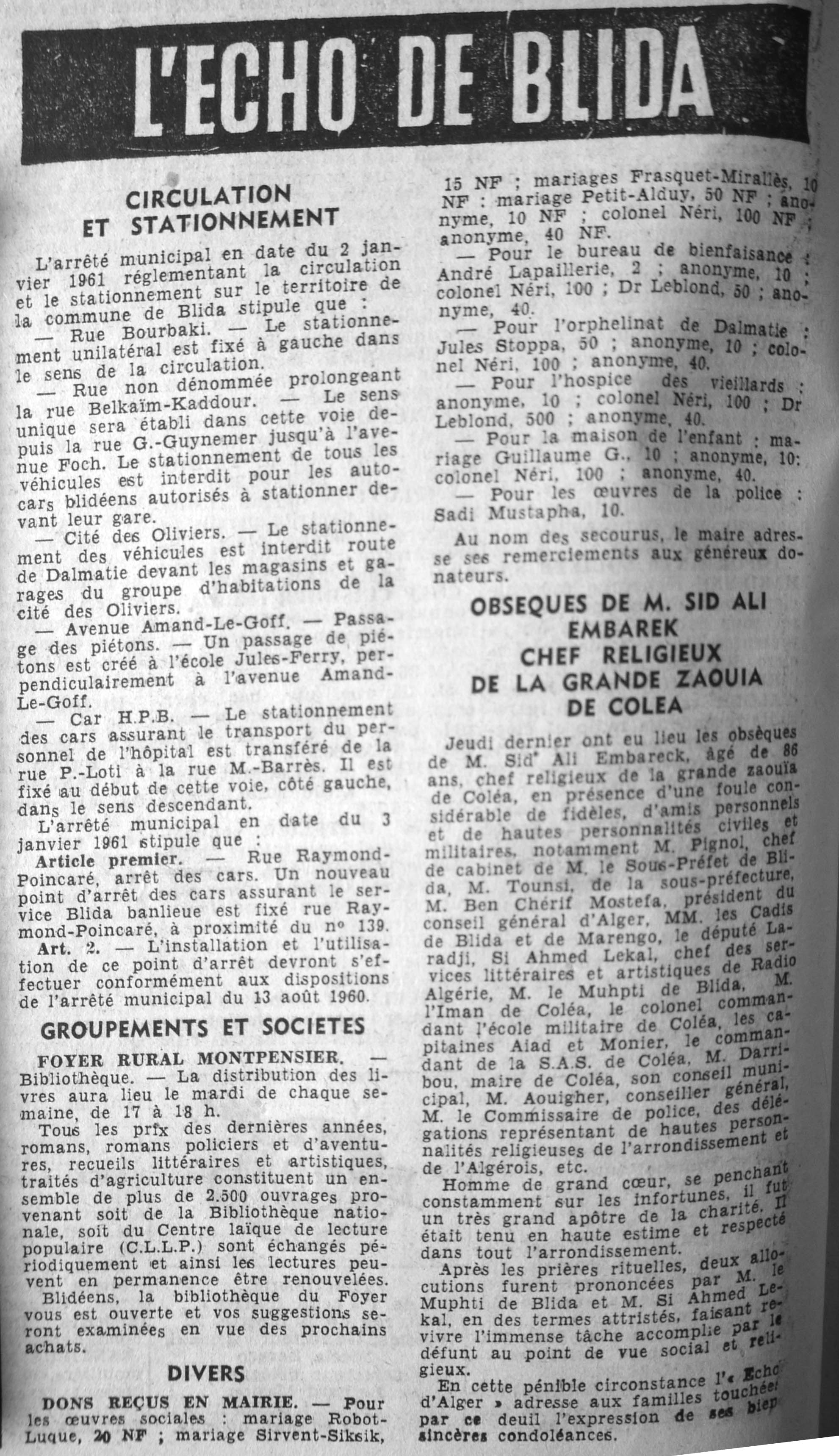ANNEE 1961 Echos de BLIDA tirés de l'ECHO d'ALGER (janvier-avril) et de la Dépêche Quotidienne (mai-décembre) |