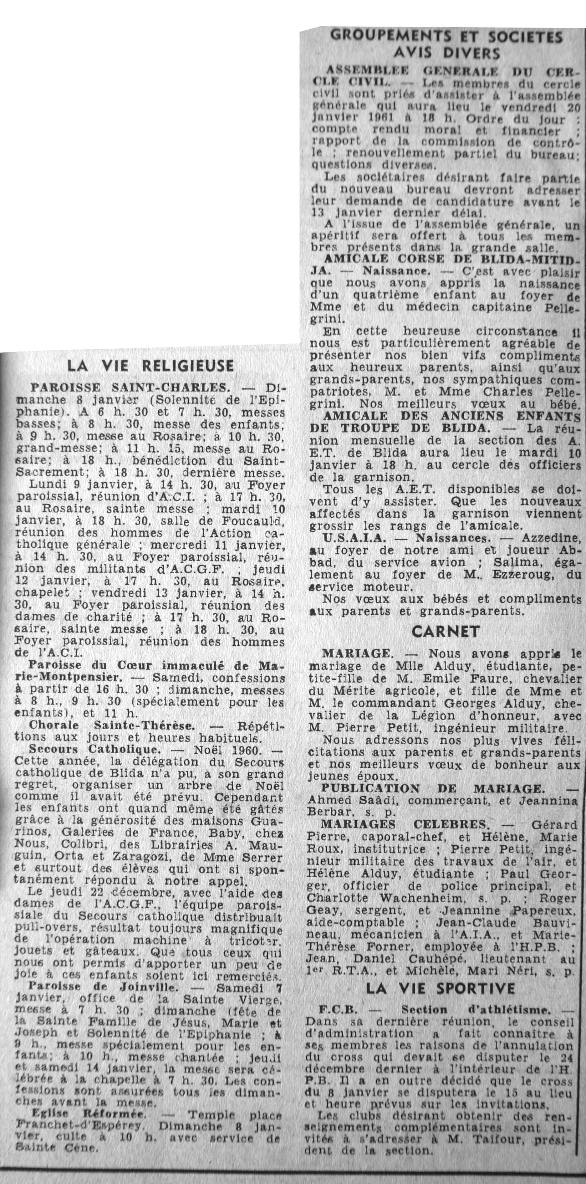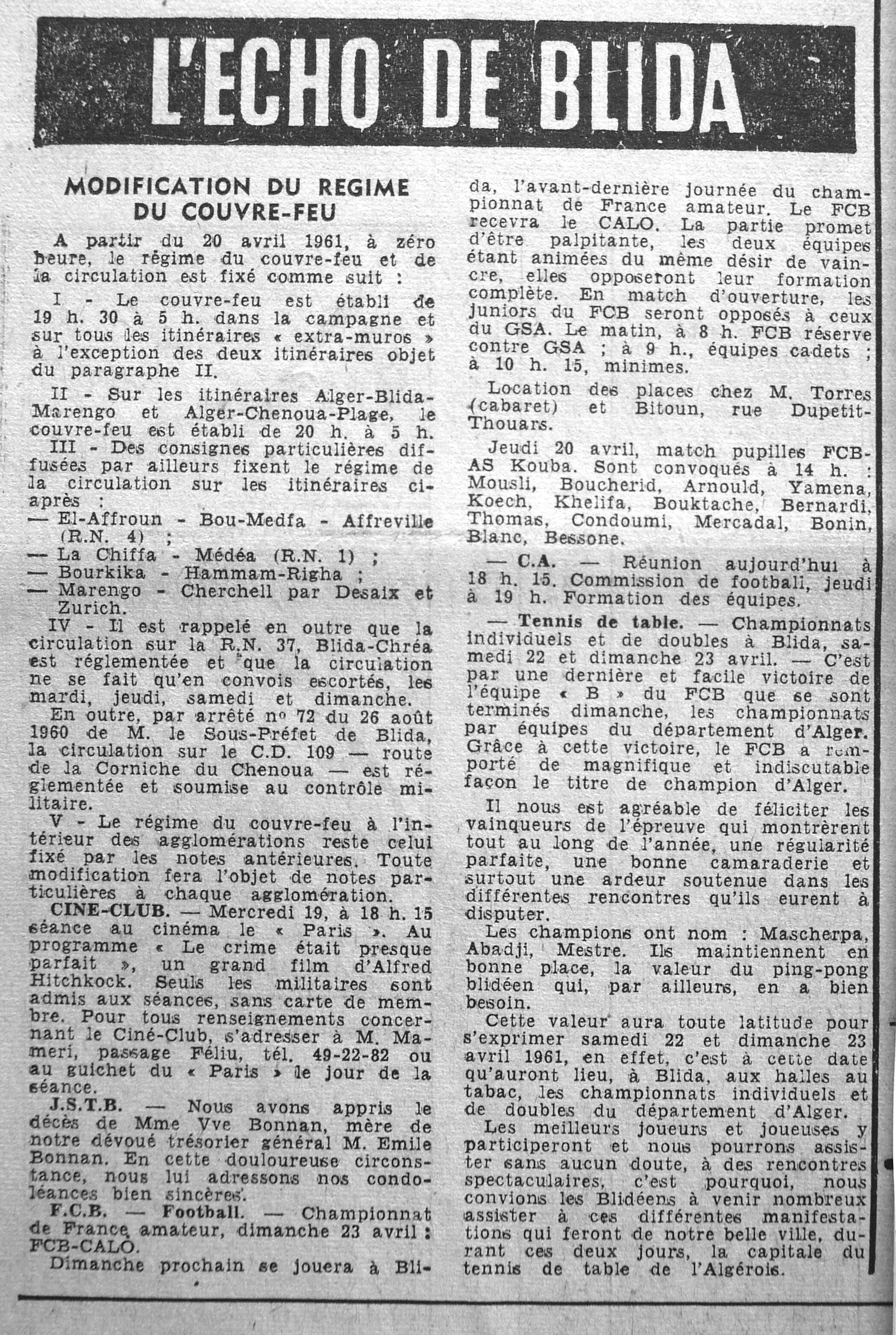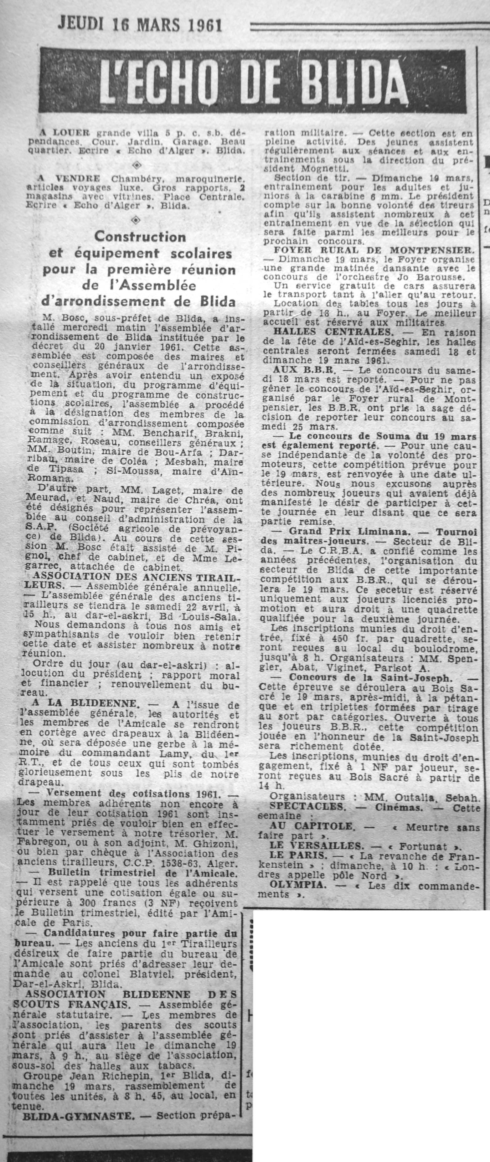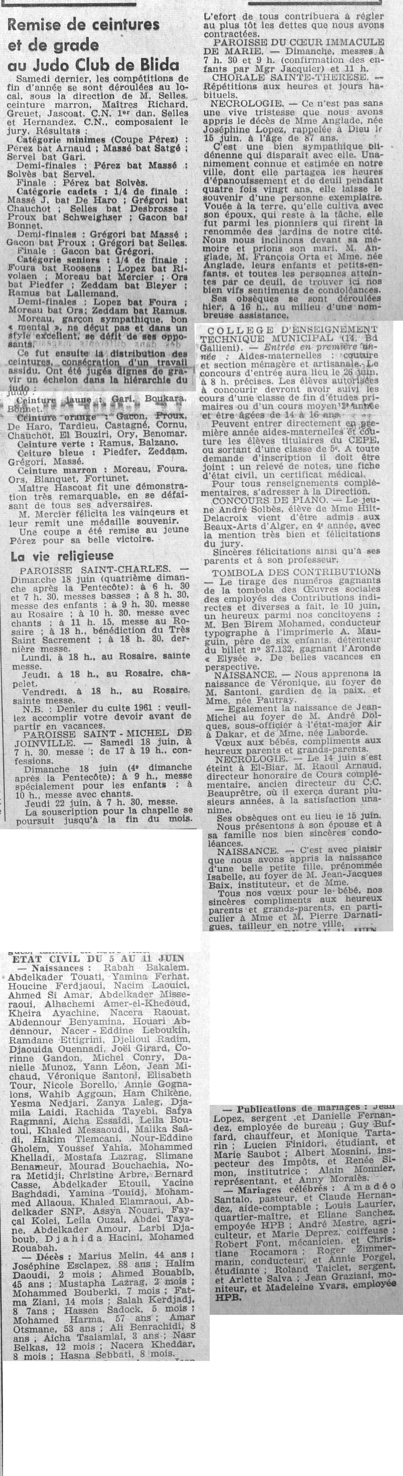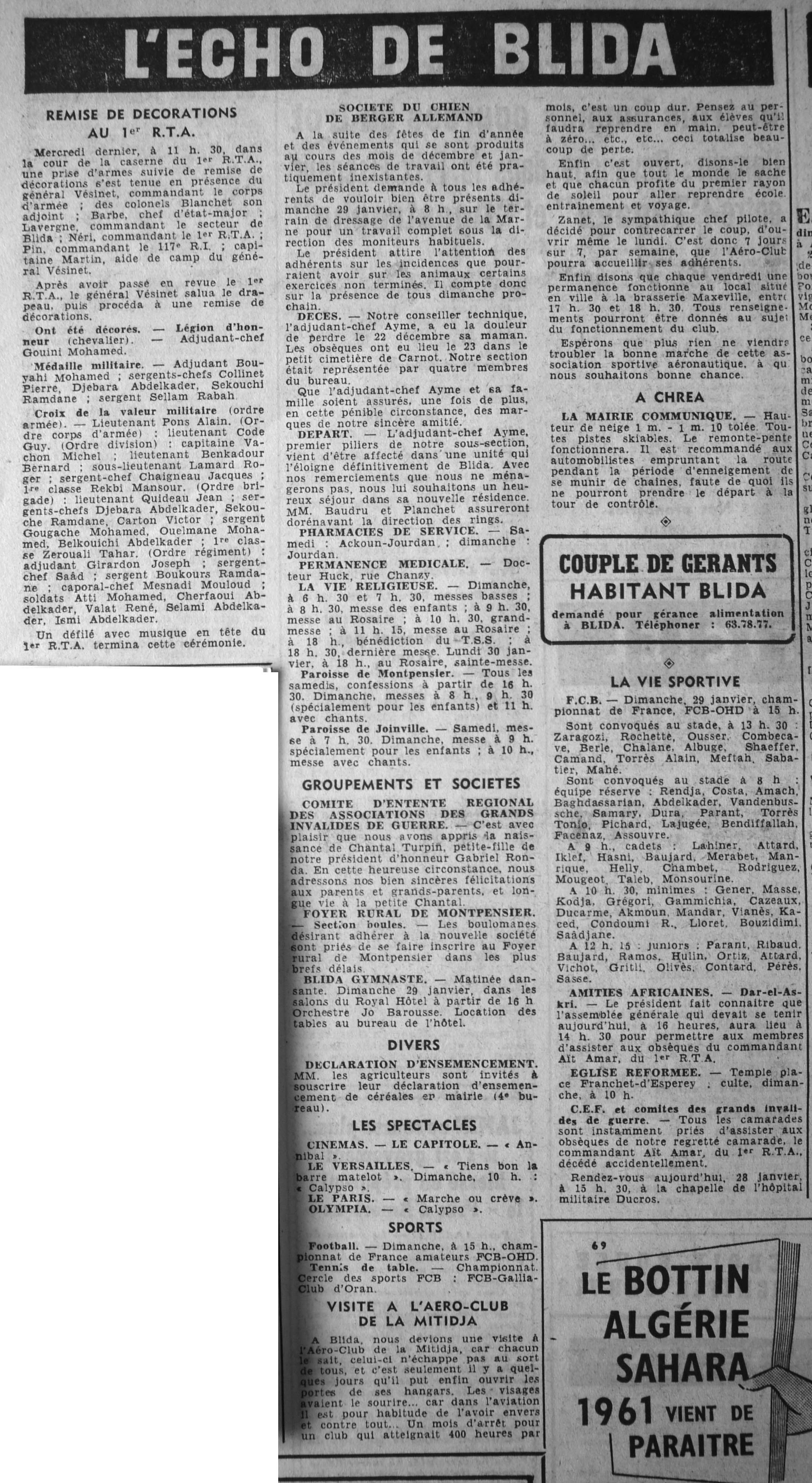 ANNEE 1961 Echos de BLIDA tirés de l'ECHO d'ALGER (janvier-avril) et de la Dépêche Quotidienne (mai-décembre) |