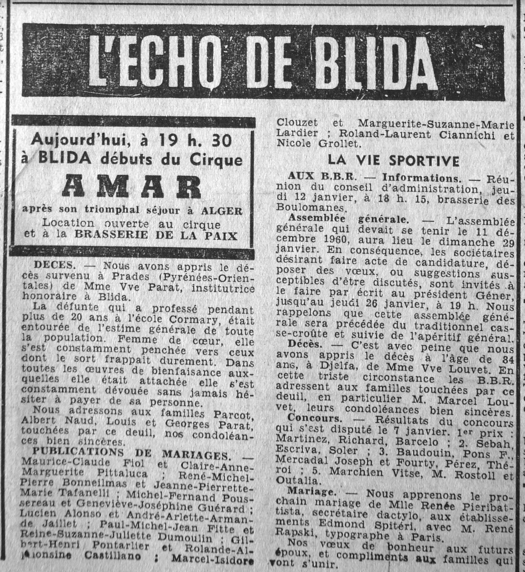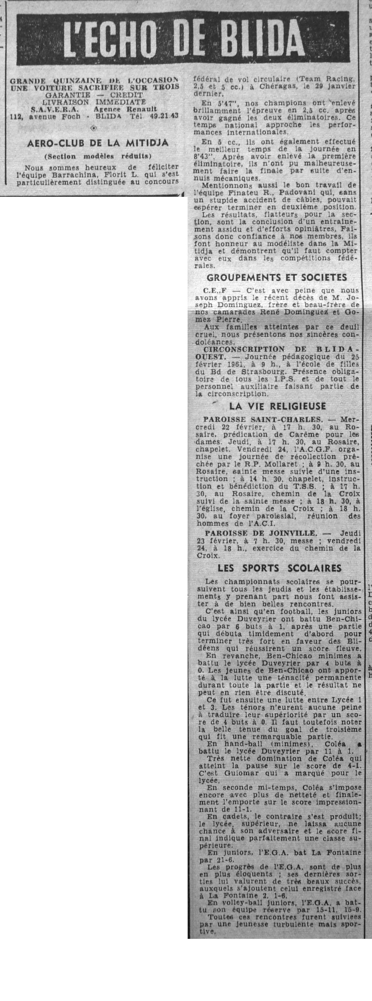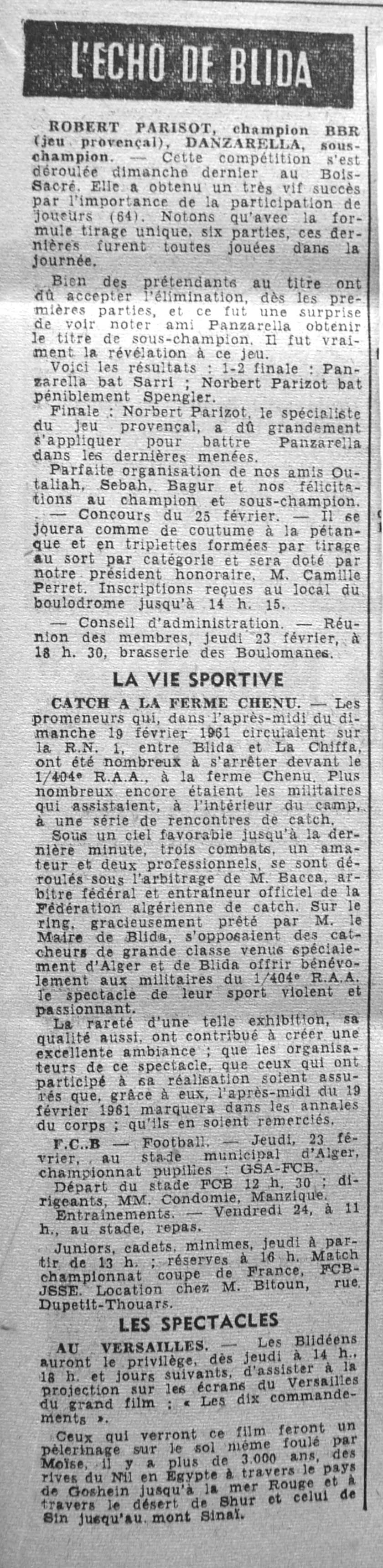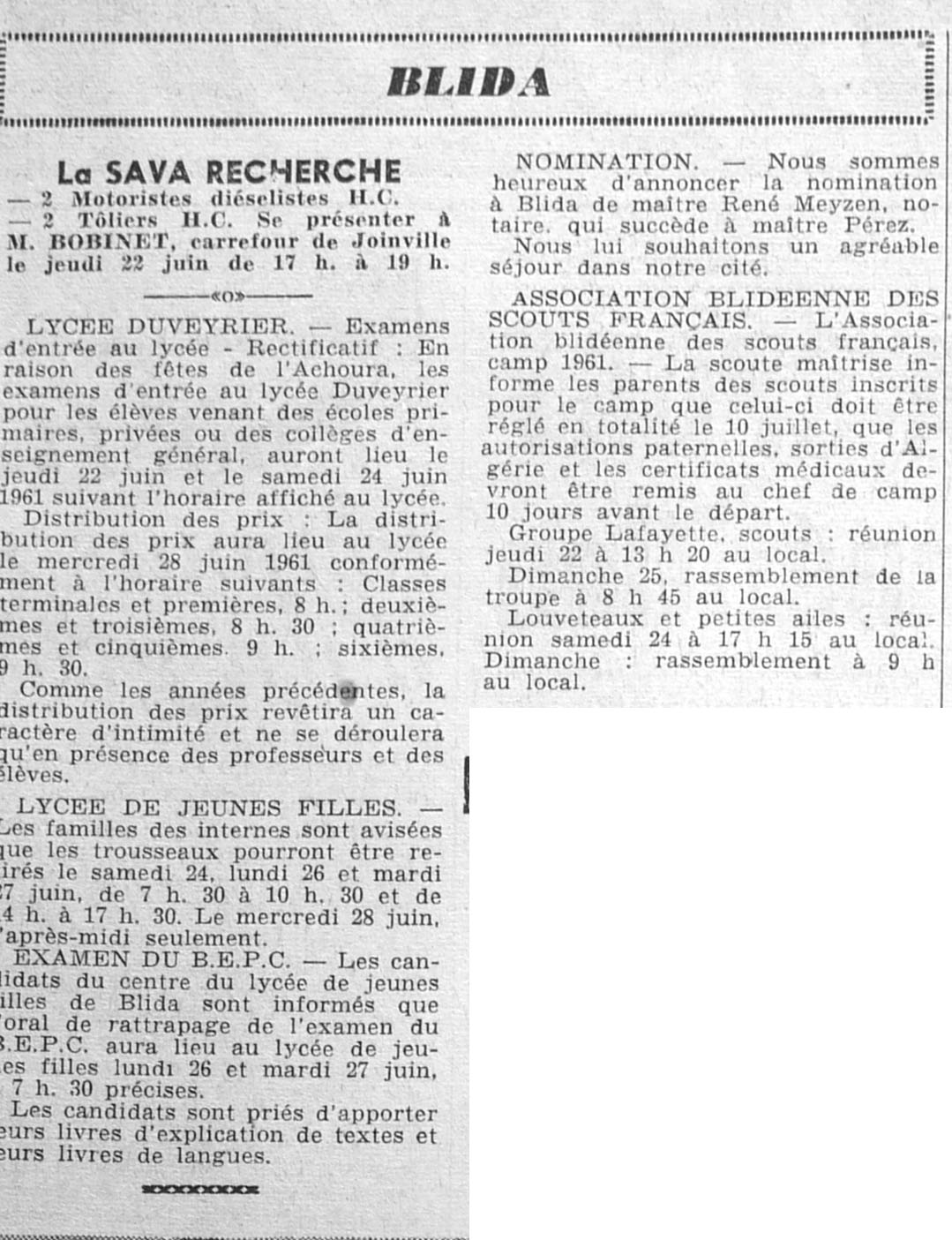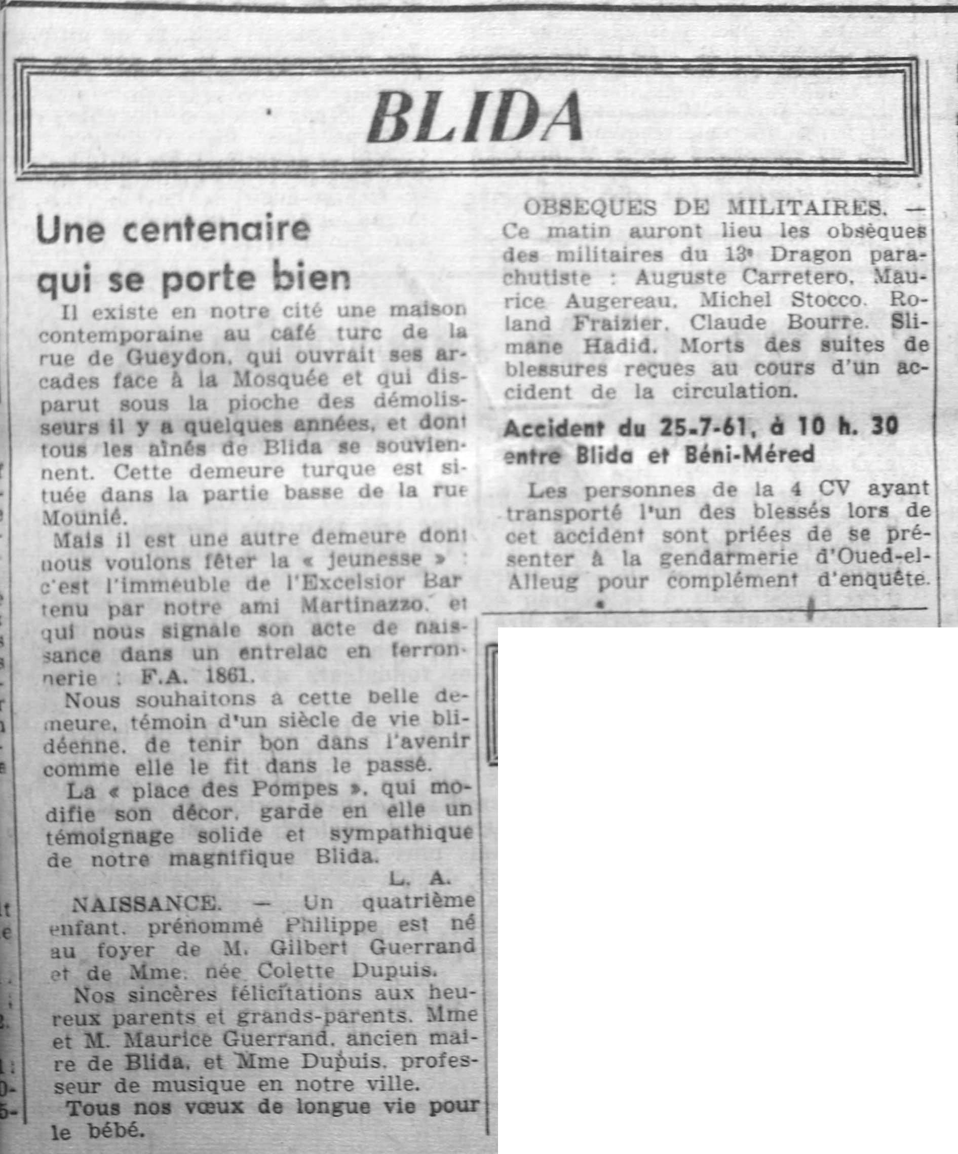 ANNEE 1961 Echos de BLIDA tirés de l'ECHO d'ALGER (janvier-avril) et de la Dépêche Quotidienne (mai-décembre) |
