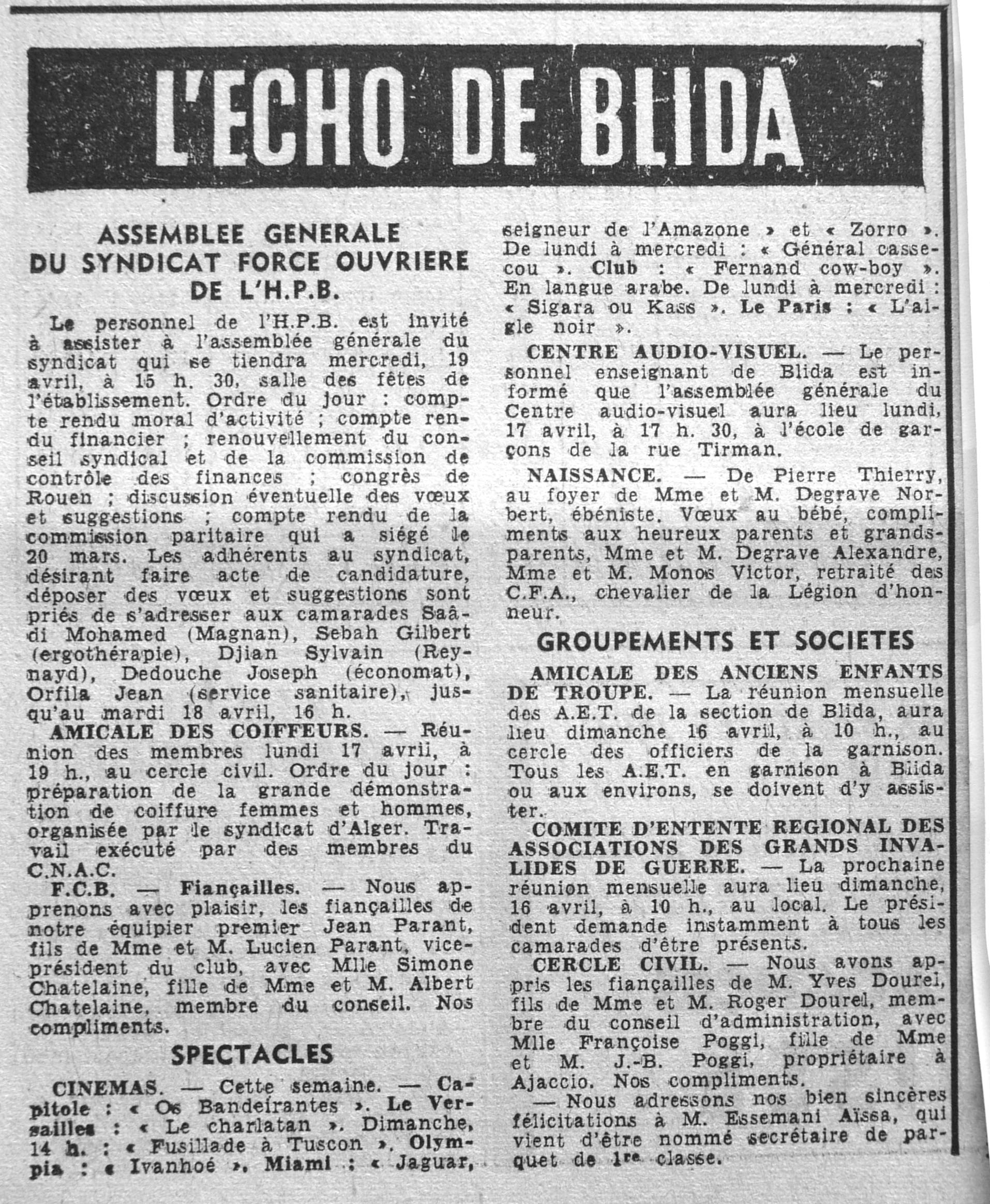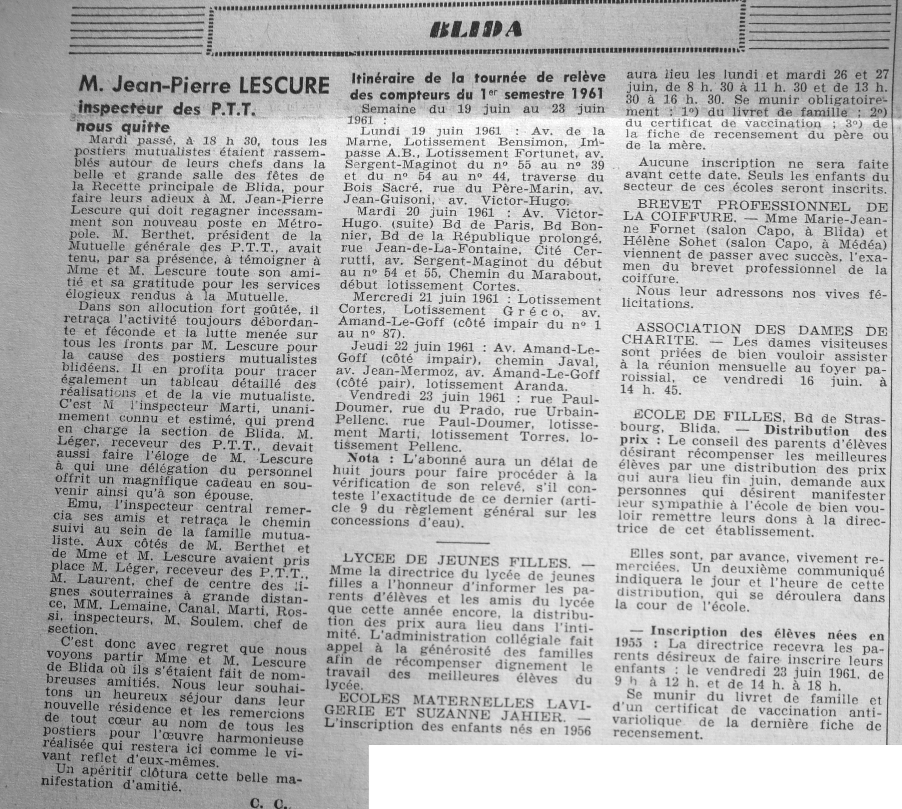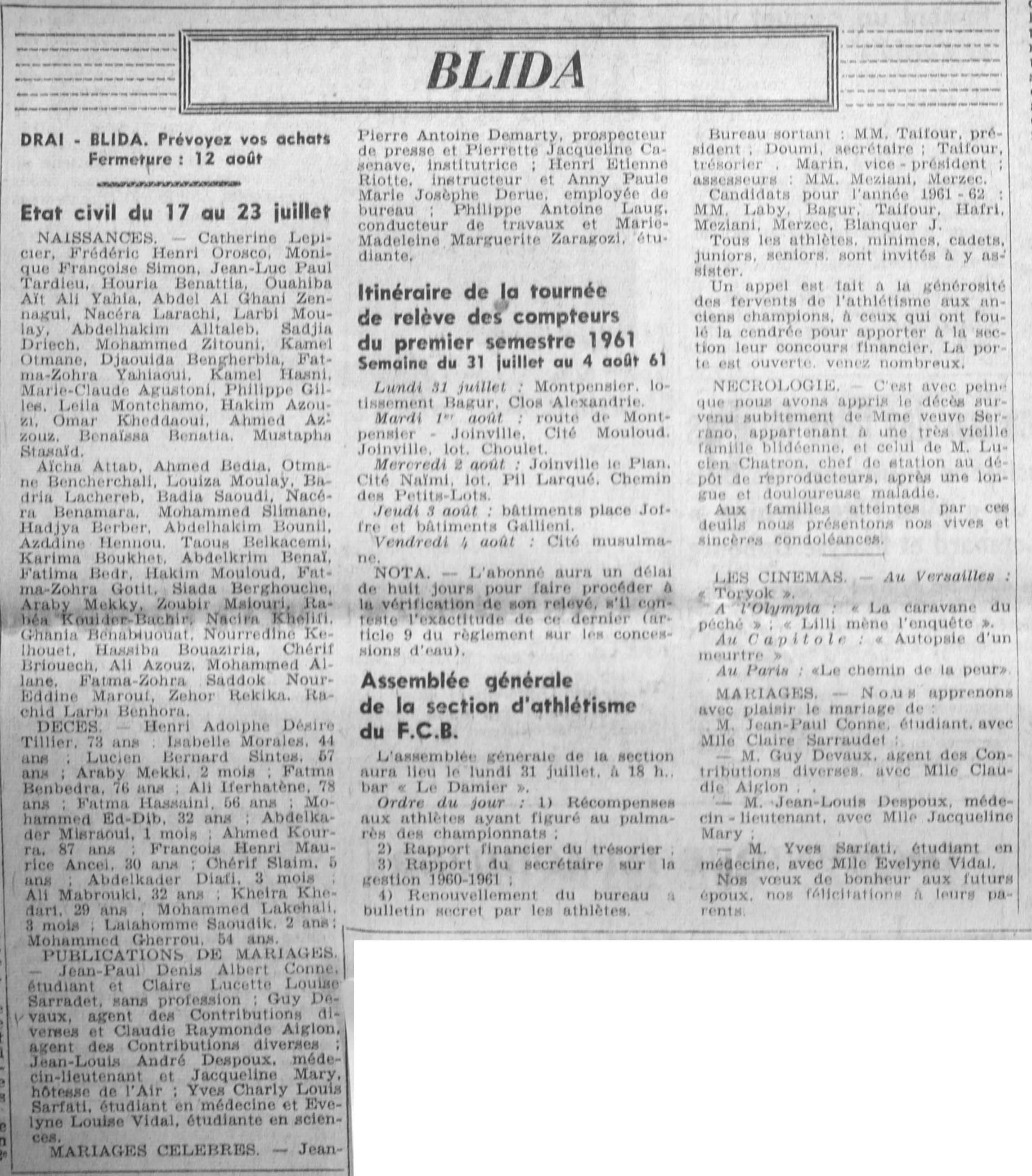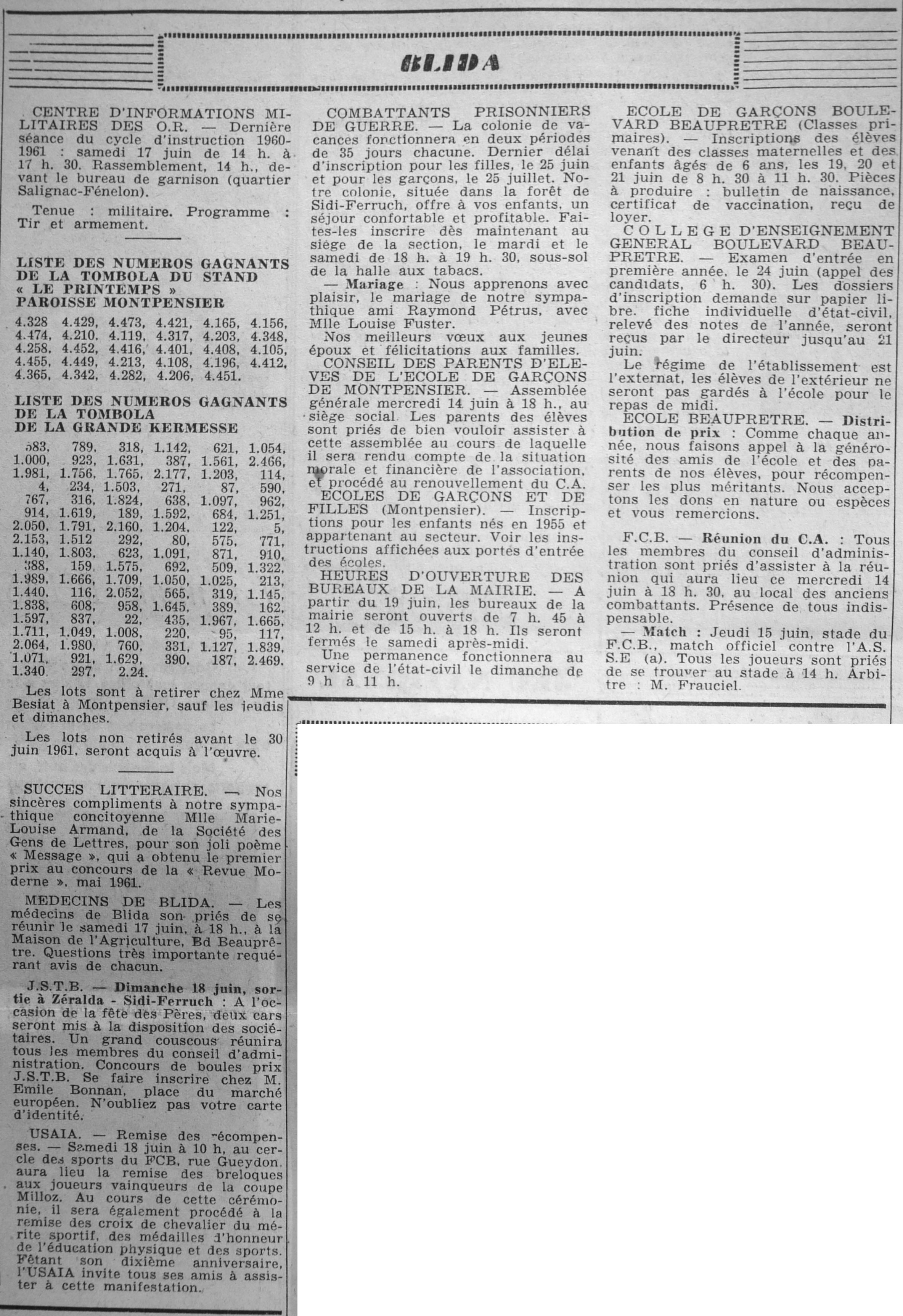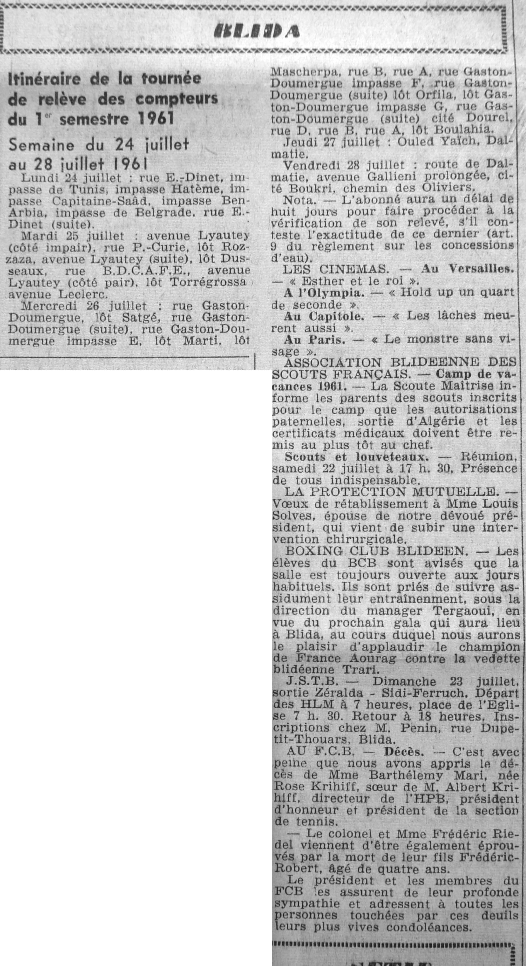 ANNEE 1961 Echos de BLIDA tirés de l'ECHO d'ALGER (janvier-avril) et de la Dépêche Quotidienne (mai-décembre) |