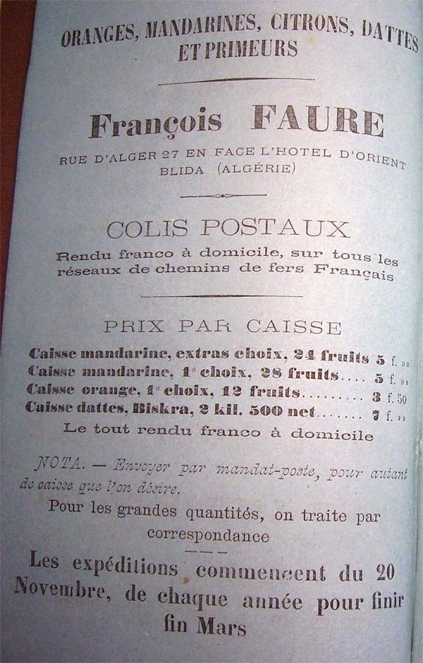Blida et les oranges C'est une longue histoire commune entre la ville et le fruit. L'orange est implantée par les Maures chassés d'Espagne au XVI ième siècle. L'oranger dont le fruit, en arabe, s'appelle "narandj", d'où le mot espagnol "naranja". On l'appelait aussi "tchina", le fruit de la Chine, double dénomination qui évoque le souvenir d'origines lointaines. Les orangers ont leurs titres de noblesse et continuent à être la parure principale du pays. La culture de l'arbre aux fruits d'or ne tarda pas à s'étendre dans le massif montagneux au dessus de Blida et jusque sur les déclivités dominant l'Arba et Rovigo, dans les replis abrités et arrosés par l'eau des sources grâce à la technique de l'irrigation apportée par les andalous. L'orange fera le charme de la ville et inspirera maints visiteurs dont Alphonse Daudet: "Pour bien connaître les oranges, il faut les avoir vues chez elles, aux îles Baléares, en Sardaigne, en Corse, en Algérie, dans l'air bleu doré, l'atmosphère tiède de la Méditerranée. Je me rappelle un petit bois d'orangers, aux portes de Blidah; c'est là qu'elles étaient belles ! Dans le feuillage sombre, lustré, vernissé, les fruits avaient l'éclat de verres de couleur, et doraient l'air environnant avec cette auréole de splendeur qui entoure les fleurs éclatantes. Ça et là des éclaircies laissaient voir à travers les branches les remparts de la petite ville, le minaret d'une mosquée, le dôme d'un marabout, et au-dessus l'énorme masse de l'Atlas, verte à sa base, couronnée de neige comme d'une fourrure blanche, avec des moutonnements, un flou de flocons tombés.