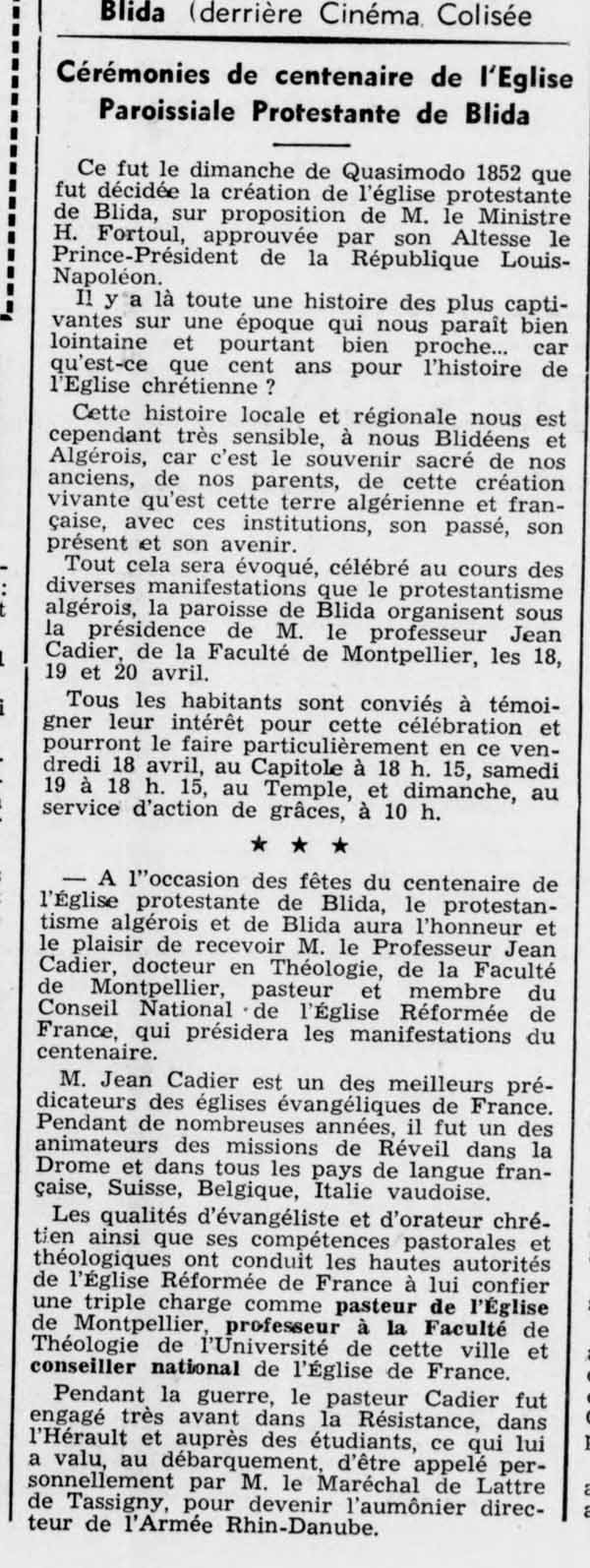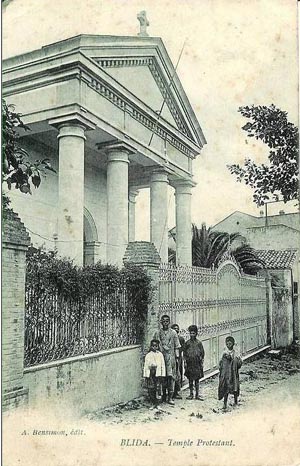 LES PROTESTANTS A BLIDA On pourra lire sur l'émigration des protestants en Algérie l'article de Jean Maurice DI COSTANZO http://alger-roi.fr/Alger/colonisation/textes/2_emigration_allemande_algerianiste57.htmhttp://alger-roi.fr/Alger/cdha/textes/62_emigration_allemande_cdha_contact_16_12_2016.htm et les articles de Mme Madiana DELAYE-LASTRAJOLI dans les revues du Généalogie Algérie Maroc Tunisie : Art1, Art1bis ; Art2, Art2bis et aussi l'article de Mr Georges PONS dans la même revue Art1, Art2, Art3 ******* Les protestants sont présents dès le début de la colonisation,3 à 5% de la population européenne également répartis géographiquement. Les estimations pour l'église de Blida varient de 150 à 500 personnes. Il est nécessaire d'avoir un lieu de culte. Les premiers services se déroulent dans les locaux qui servent aussi d'école aux protestants place de l'orangerie. Ci-dessous un historique de la vie de l'église protestante de Blida: ce texte est tiré du Journal des Protestants d'Algérie de mai 1930. Je remercie Mme Françoise Favre de m'avoir fourni ces documents qui font partie de sa collection personnelle.