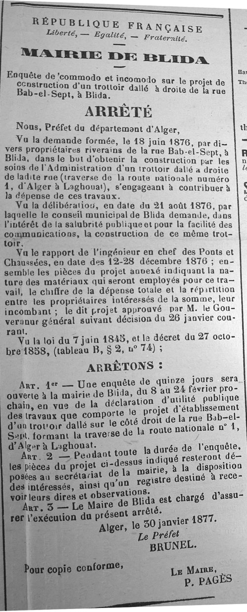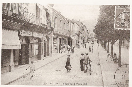 La rue Bab-el-Sebt, telle qu'elle était il y a cinquante ans et telle qu'elle est maintenant (suite II) Tant que le transport des voyageurs entre Alger et Blida s'effectua par le service des messageries de la Cie Bonnifay, la rue Bab-el-Sebt resta dans son état ordinaire. Et de fait rien de nouveau n'était venu rompre la désolante monotonie qui y régnait. Cependant le jour n'était pas bien éloigné où un heureux événement devait se produire et devenir la cause déterminante de sa future transformation. La construction de la voie ferrée entre Alger et Blida étant achevée, la ligne solennellement inaugurée au commencement de l'année 1863 fut livrée au public. Ainsi se trouvait accompli l'heureux événement attendu avec une bien légitime impatience. Ce nouveau mode de transport qui offrait à tous les points de vue de précieux avantages fut adopté avec empressement. Il s'ensuivit que de nombreux voyageurs, allant et venant par cette voie, créèrent un mouvement de va et vient qui répété, au départ et à l'arrivée de chaque train, eut pour résultat de donner à la rue Bab-el-Sebt, une animation du plus heureux présage pour son avenir. Cette pauvre rue, qui, depuis fort longtemps s'était assoupie dans une torpeur profonde se réveilla en sursaut juste au moment où elle devenait la plus fréquentée de Blida. L'importance qu'elle acquérait de plus en plus, ne devait pas laisser indifférente notre municipalité. Notre premier magistrat, l'honorable M. Rauël de Montagny, avait déjà pris l'excellente détermination d'entrer en pourparlers avec l'autorité militaire à l'effet d'arrêter les conditions auxquelles pourraient se faire l'acquisition de l'espace de terrain nécessaire pour l'agrandissement de la rue Bab-el-Sebt, reconnu absolument indispensable. Ses démarches furent couronnées d'un plein succès. Le génie se montra tout disposé à accéder au désir de la municipalité et au commencement d'octobre 1864, fut conclue à titre onéreux, la vente du terrain demandé et dont l'étendue en longueur ne pouvait pas dépasser les magasins à orge. Le mur de clôture fut bientôt démoli et reconstruit à la distance convenue. De son côté, l'administration municipale prit possession du terrain acheté et le disposa pour recevoir la double rangée d'arbres devant faire suite à celle de la Place d'Armes. En somme, le boulevard Bab-el-Sebt, avait reçu un bon commencement d'exécution, mais Mr Rauël de Montany, à qui en était due l'initiative, ne put achever son oeuvre. Le 28 avril 1865, il fut remplacé, dans ses fonctions de maire, par Mr Borély la Sapie. C'est donc notre nouveau maire qui la continuera, mais lorsqu'il crut opportun le moment de s'en occuper, un incident se produisit au sein de l'assemblée communale au sujet de la désignation de l'essence des arbres qui devaient orner le Boulevard. Quatre essences étaient indiquées: le platane, le caroubier, l'eucalyptus et enfin l'oranger. Je dois avouer que chacune de ces essences avait ses partisans résolus et ses détracteurs déterminés. L'eucalyptus n'ayant pas acquis le droit de cité nécessaire fut exclu du choix. Il en fut de même du caroubier dont les fruits seuls constituaient un avantage appréciable mais insuffisant pour compenser ses inconvénients dont les principaux résident dans son inélégance et dans l'odeur nauséabonde qui s'exhale de ses fleurs. Le platane donna lieu à une discussion assez vive. M Borely qui en avait tant fait planter à Boufarick, fit ressortir la propriété qu'on s'accorde à lui reconnaître d'assainir les centres d'insalubrité. Il se distingue, en outre, par l'élégance de son port, par la beauté de son feuillage, par l'ombre agréable qu'il produit, en un mot, c'est l'arbre préféré pour ombrager et orner les places et les promenades. Enfin, et comme raison majeure invoquée, il était tout naturellement indiqué pour continuer sur le boulevard la plantation des mêmes arbres que ceux de la place d'Armes. Rien n'y fit et le platane eut le même sort que les deux autres. Vint le tour de l'oranger. Voici en quels termes un de ses partisans en fit l'éloge: " Cet arbre, d'une élégance remarquable, réjouit la vue et charme l'odorat par la beauté de ses fleurs qui répandent un parfum pénétrant et extrêmement suave. Des fruits excellents d'une riche couleur d'or leur succèdent et contrastent agréablement avec le verts foncé du feuillage. Il a aussi un autre avantage que n'a pas le platane, c'est celui de conserver sa brillante verdure dans les saisons de l'année." On ne pouvait pas mieux dire en faveur de l'arbre favori de Blida, et l'oranger fut désigné pour orner le Boulevard (1). Dans le mois d'octobre 1865 les trous nécessaires furent creusés et au commencement de février 1866 eut lieu la plantation des orangers. Ce travail accompli, le jeune boulevard qui se déployait de la place d'Armes à la limite convenue, apparut tout radieux aux yeux du public. Aucun changement ne s'était opéré de l'autre côté de la rue. Ce n'est que quelques années plus tard qu'y furent édifiés les établissements que l'on y remarque aujourd'hui. Enfin, grâce aux instantes démarches de M.Mauguin, les magasins à orge qui déparaient la rue de si désagréable façon, furent reculés aux frais de la ville, et le boulevard put être achevé à la grande satisfaction de la population. C'est encore à Mr Mauguin qu'est due la transformation de l'ancienne porte en une autre plus élégante qui contribua à donner à la rue Bab-el-Sebt l'embellissement souhaité et à la rendre telle qu'elle est maintenant P.Cazenave Le TELL 19/03/1910 (1): On pourra lire par ailleurs la polémique lorsqu'il fallut changer ces arbres