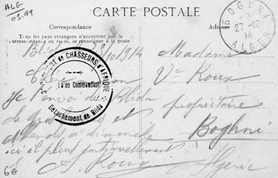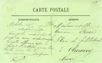 Blida 21/10/1910 Mademoiselle Nous voilà arrivés dans le pays des roses et des orangers.Quelle différence avec ce désert. Recevez vous bienn toutes mes cartes. Mes meilleurs souvenirs |