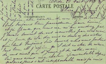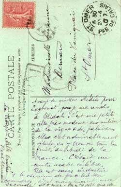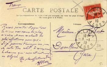 Reçois pour toi et pour tous les tiens nos voeux les plus sincères et nos souhaits les plus affectueux pour 1910. Si je pouvais t'envoyer un peu de notre bon soleil, tu comprendrais le charme qui nous retient ..... en Algérie. |
